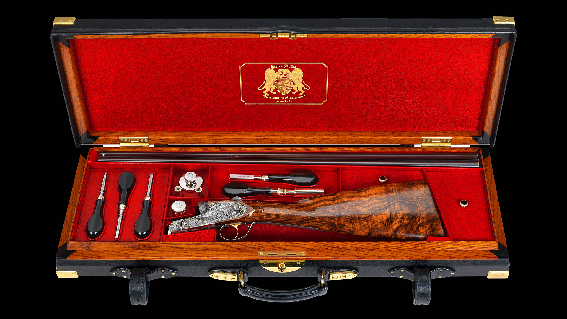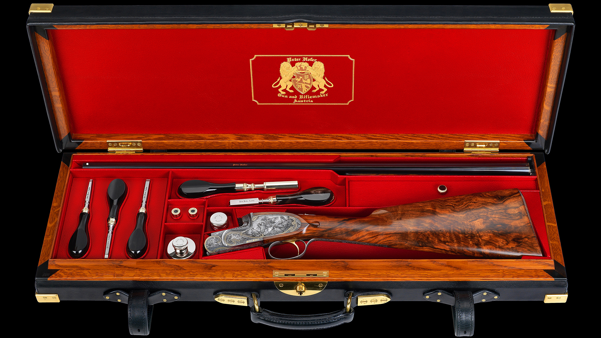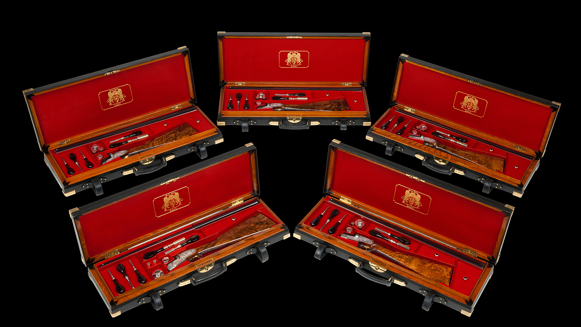 Zum Schutz dieses absolut einzigartigen Flintensets wurden maßgefertigte und handgearbeitete Lederkoffer inklusive Accessoires in Auftrag gegeben, deren Bauzeit drei Jahre betrug. Jeder einzelne Koffer ist innen in feinstem, rotem Ziegenleder und außen in schwarzem Büffelleder ausgeführt. Die Koffer sind mit abnehmbaren Kofferdeckeln und eigens dafür entwickelten Scharnieren ausgestattet, sodass eine Unterbringung in einem Schrank mit Schubladen oder Safe möglich ist. Diese Flinten mit maßgefertigten Lederkoffern sind in einer nicht mehr zu überbietenden Qualität ausgeführt.