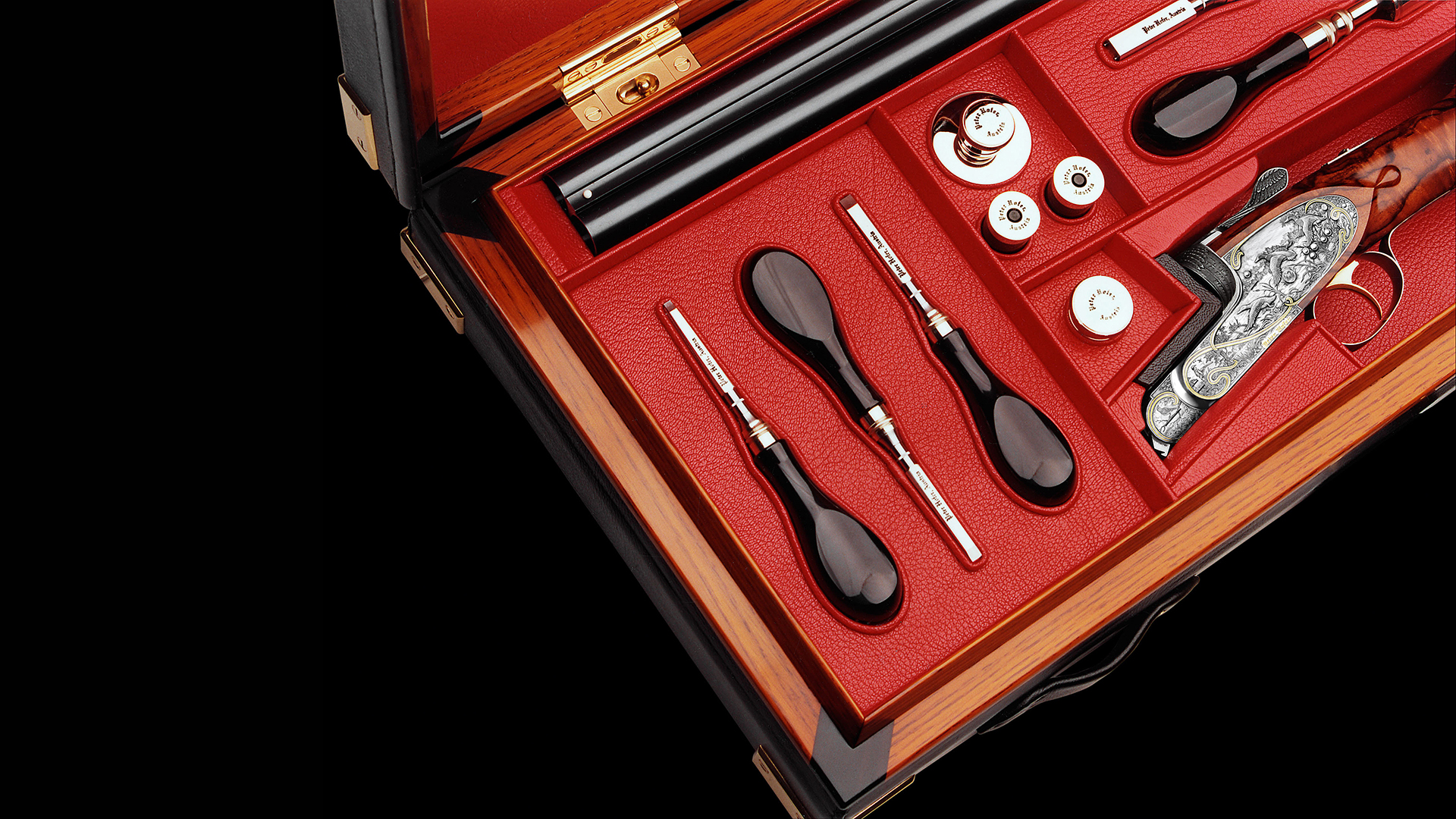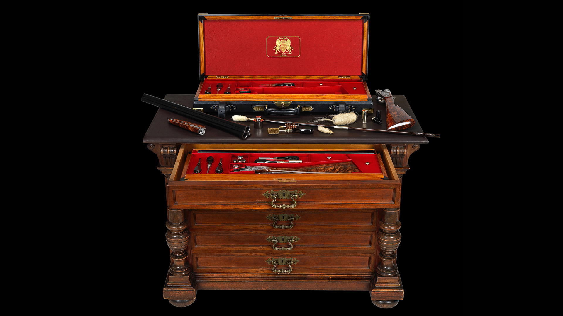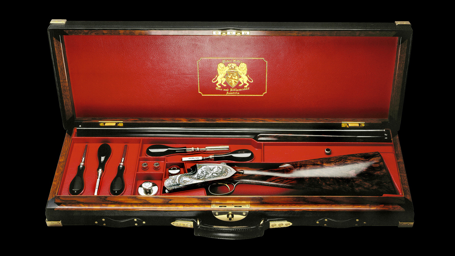 Zum Schutz dieses absolut einzigartigen Flintensets wurden maßgefertigte und handgearbeitete Lederkoffer inklusive Accessoires in Auftrag gegeben, deren Bauzeit drei Jahre betrug. Jeder einzelne Koffer ist innen in feinstem, rotem Ziegenleder und außen in schwarzem Büffelleder ausgeführt. Die Koffer sind mit abnehmbaren Kofferdeckeln und eigens dafür entwickelten Scharnieren ausgestattet, sodass eine Unterbringung in einem Schrank mit Schubladen oder Safe möglich ist. Diese Flinten mit maßgefertigten Lederkoffern sind in einer nicht mehr zu überbietenden Qualität ausgeführt.
