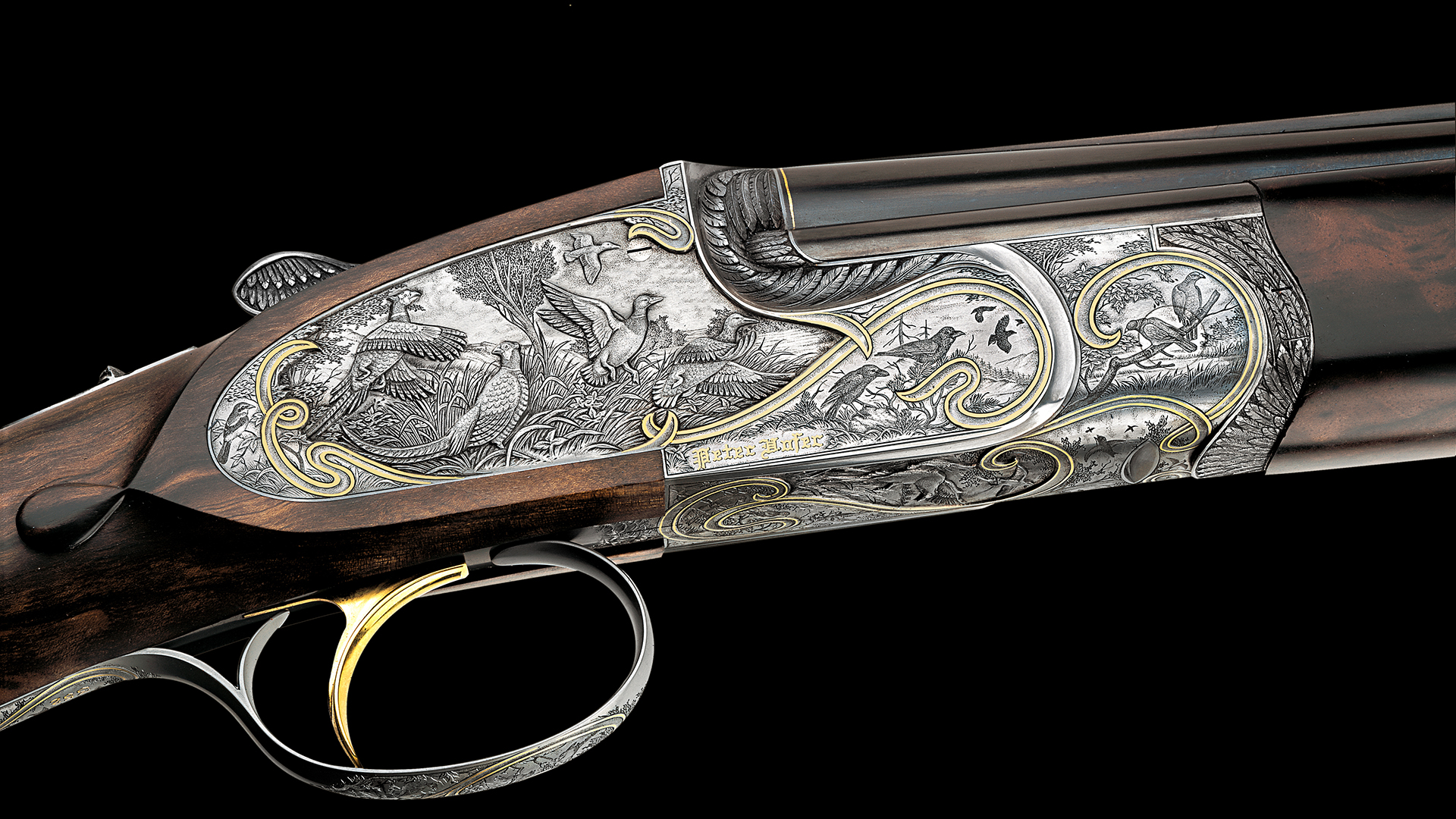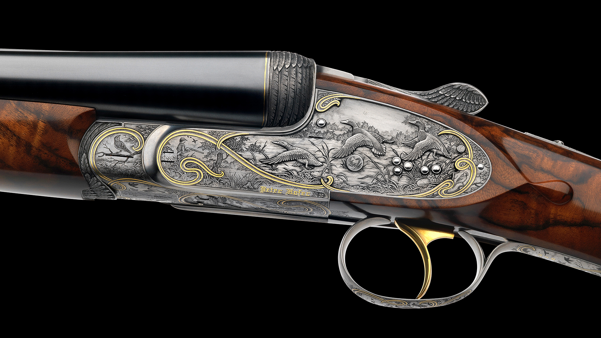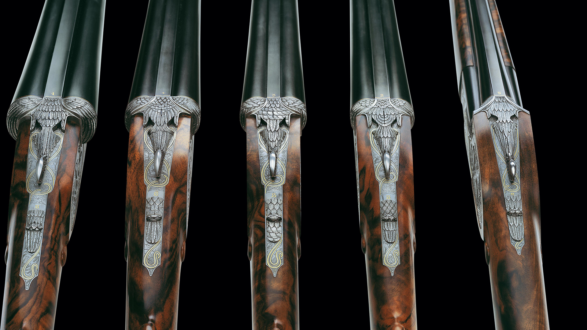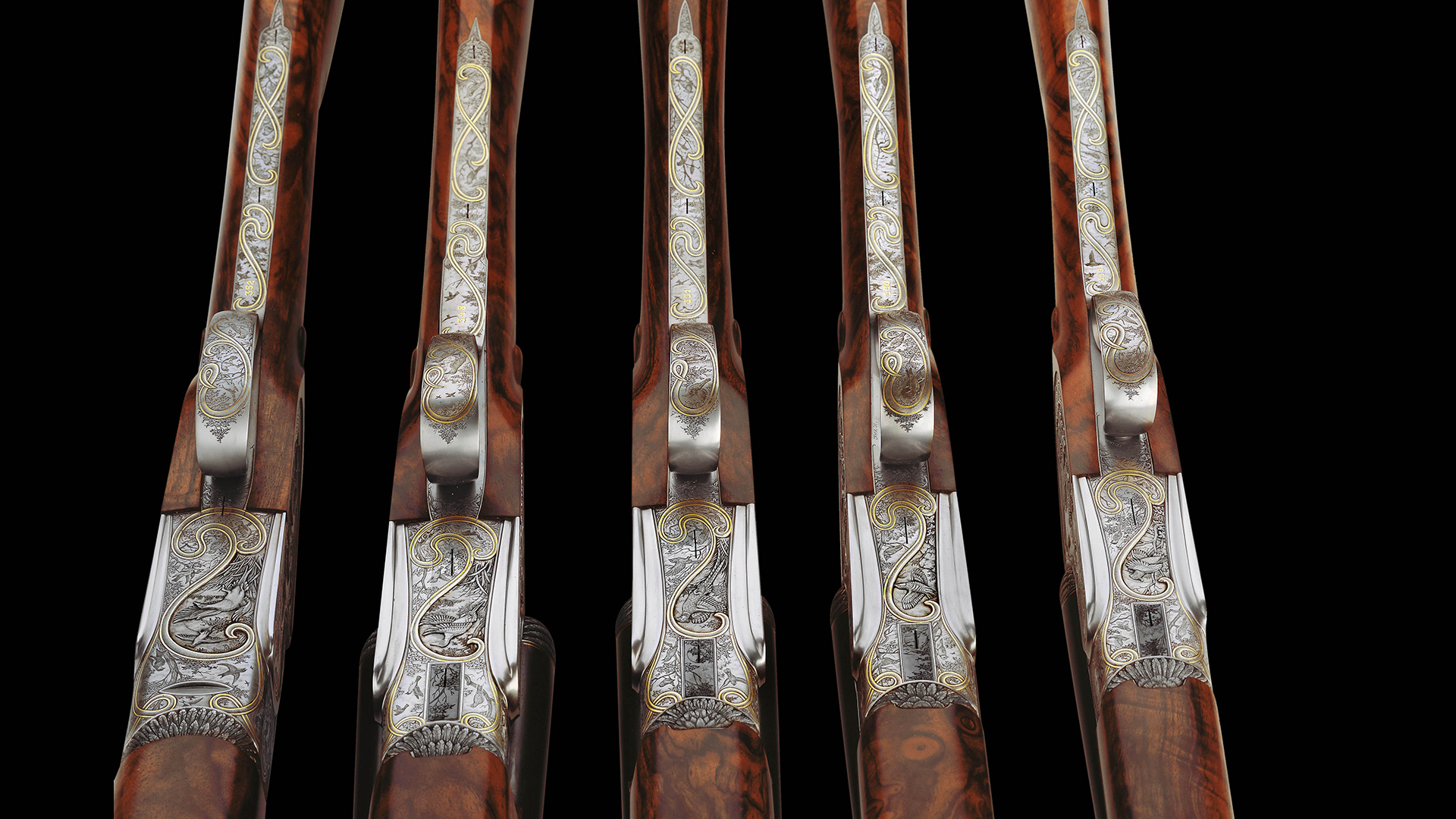 Jede Flinte dieses Sets steht im Zeichen eines bestimmten Flugwildes. Das Großartige an diesem Flintenset ist jedoch, dass nicht, wie üblich, bei jeder Flinte stets die gleiche Gravur-Komposition verwendet wurde, sondern dass jede Flinte unterschiedliche Gravurszenen aufweist und nur die Grundanordnung der Szenen beibehalten wurde, wodurch dieser einzigartige Set-Charakter erzielt werden konnte. Die Hauptszenen sind in Relieftechnik graviert und stellen jeweils eine bestimmte Flugwildart dar. Das Gefieder des jeweiligen Flugwildes wurde ebenso in Relief an der Muschlierung, am Schlüssel und am Vorderschaft graviert. Anstelle der üblichen Ornamentgravur wurden Landschaftsdarstellungen mit beeindruckenden Flugwildszenen graviert. Auch dieses Konzept wurde bei jeder einzelnen Flinte beibehalten. 24 Karat Massivgoldbänder unterstreichen überdies den Setcharakter bei jeder einzelnen Flinte.