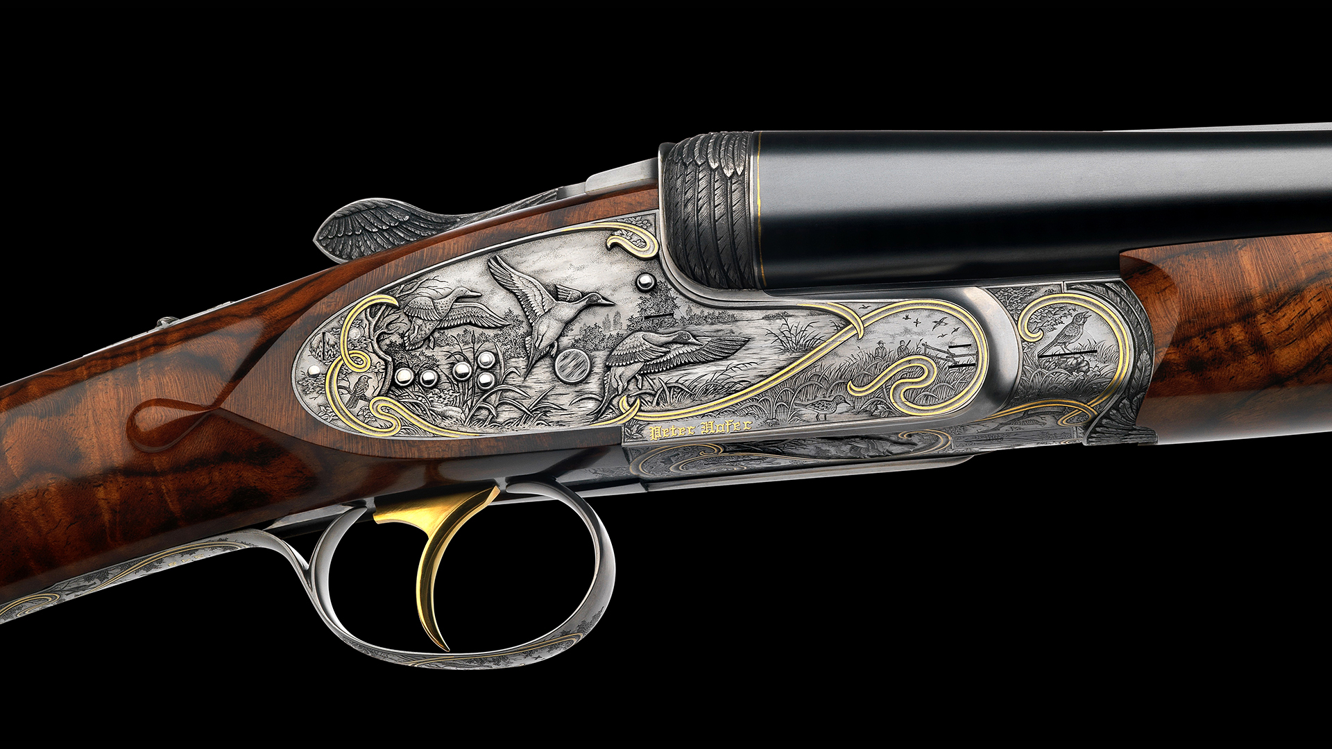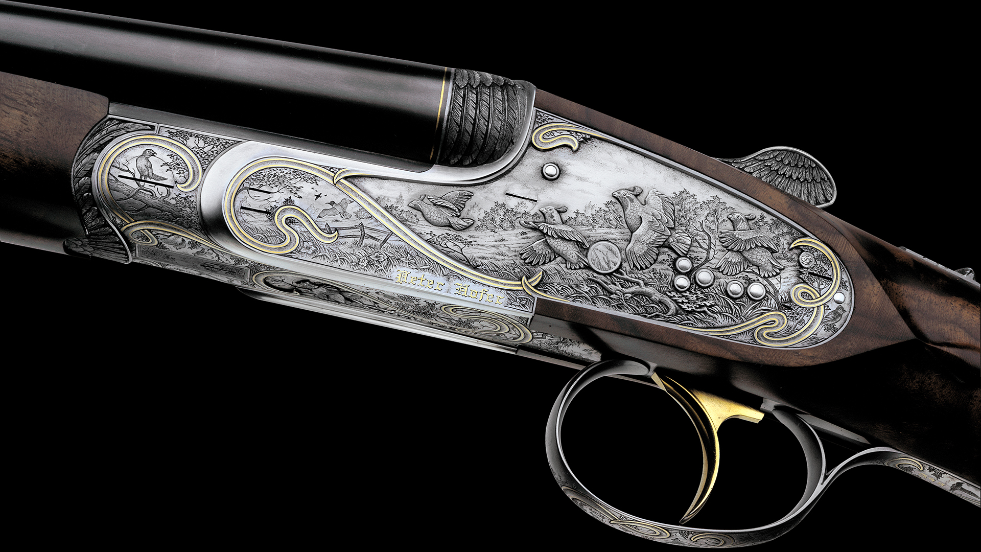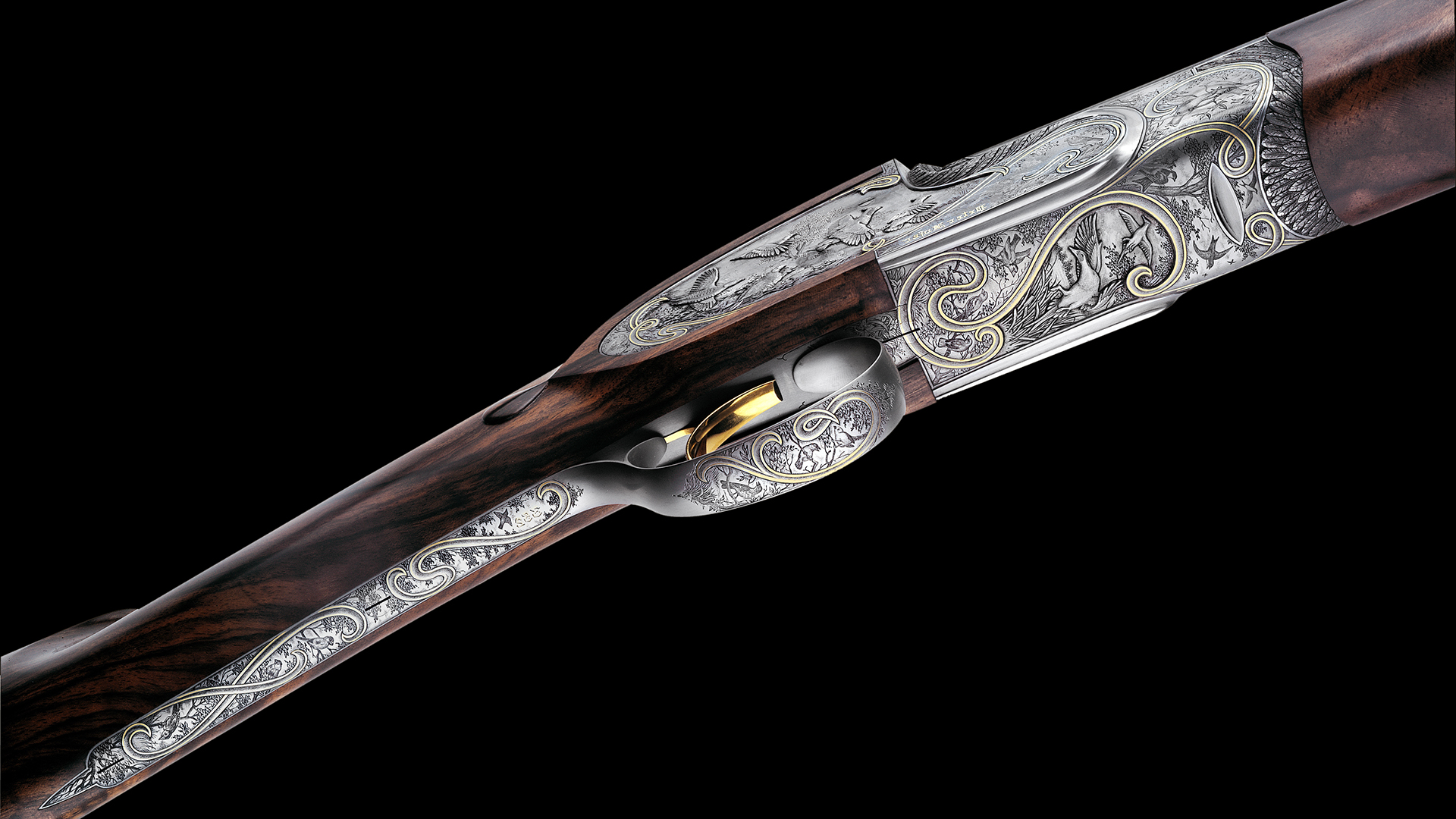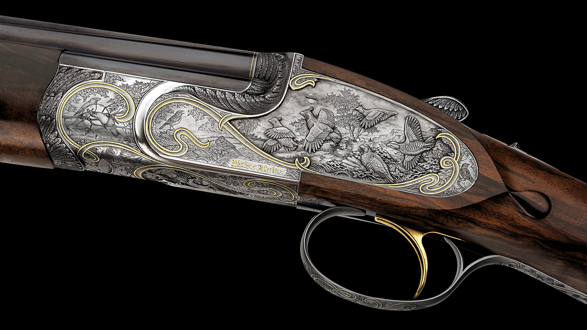 Jede Flinte dieses Sets steht im Zeichen eines bestimmten Flugwildes. Das Großartige an diesem Flintenset ist jedoch, dass nicht, wie üblich, bei jeder Flinte stets die gleiche Gravur-Komposition verwendet wurde, sondern dass jede Flinte unterschiedliche Gravurszenen aufweist und nur die Grundanordnung der Szenen beibehalten wurde, wodurch dieser einzigartige Set-Charakter erzielt werden konnte. Die Hauptszenen sind in Relieftechnik graviert und stellen jeweils eine bestimmte Flugwildart dar. Das Gefieder des jeweiligen Flugwildes wurde ebenso in Relief an der Muschlierung, am Schlüssel und am Vorderschaft graviert. Anstelle der üblichen Ornamentgravur wurden Landschaftsdarstellungen mit beeindruckenden Flugwildszenen graviert. Auch dieses Konzept wurde bei jeder einzelnen Flinte beibehalten. 24 Karat Massivgoldbänder unterstreichen überdies den Setcharakter bei jeder einzelnen Flinte.