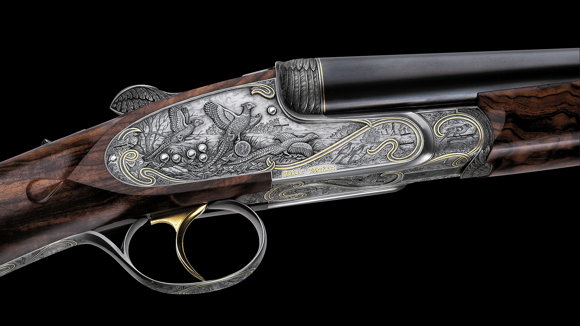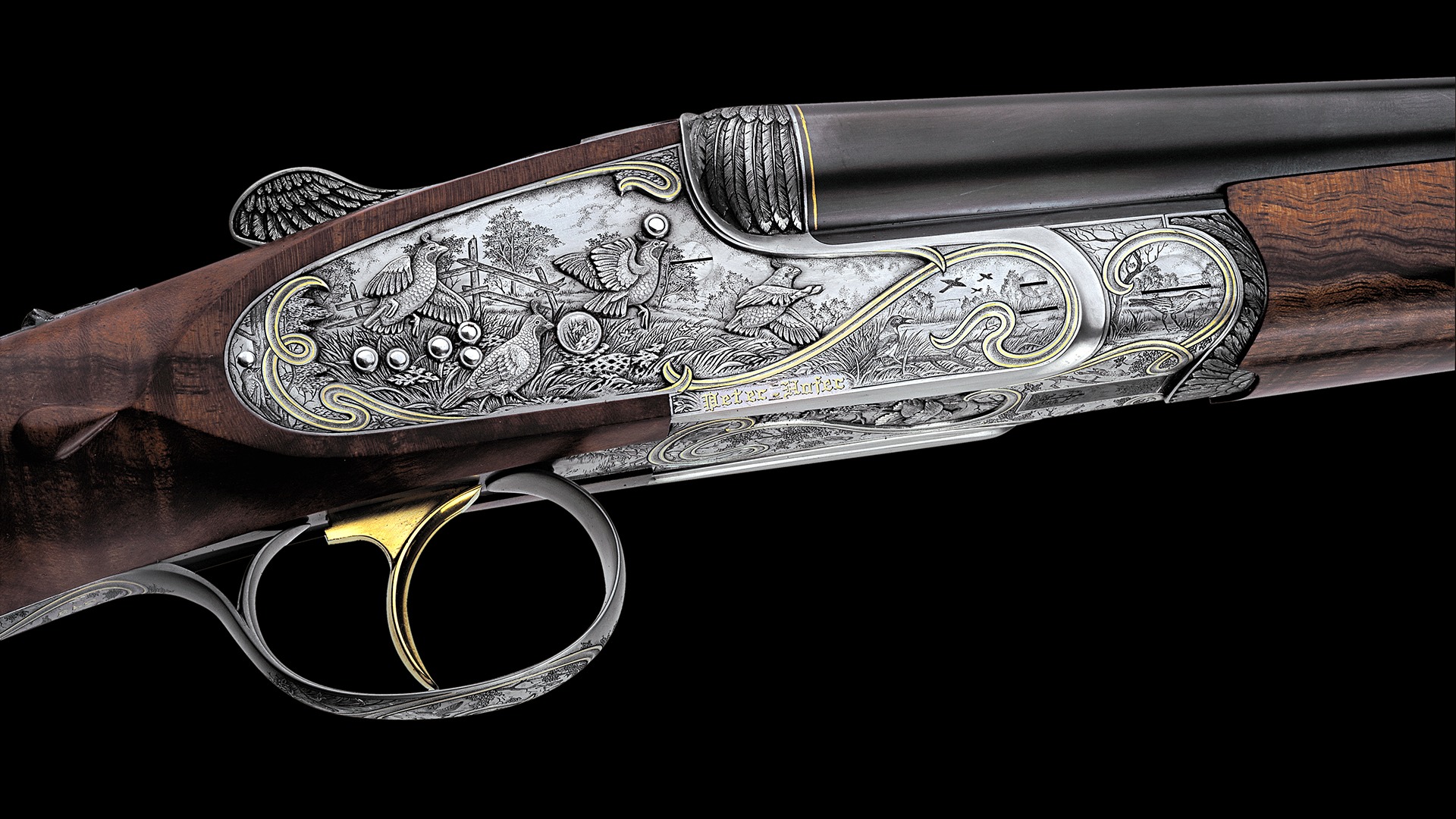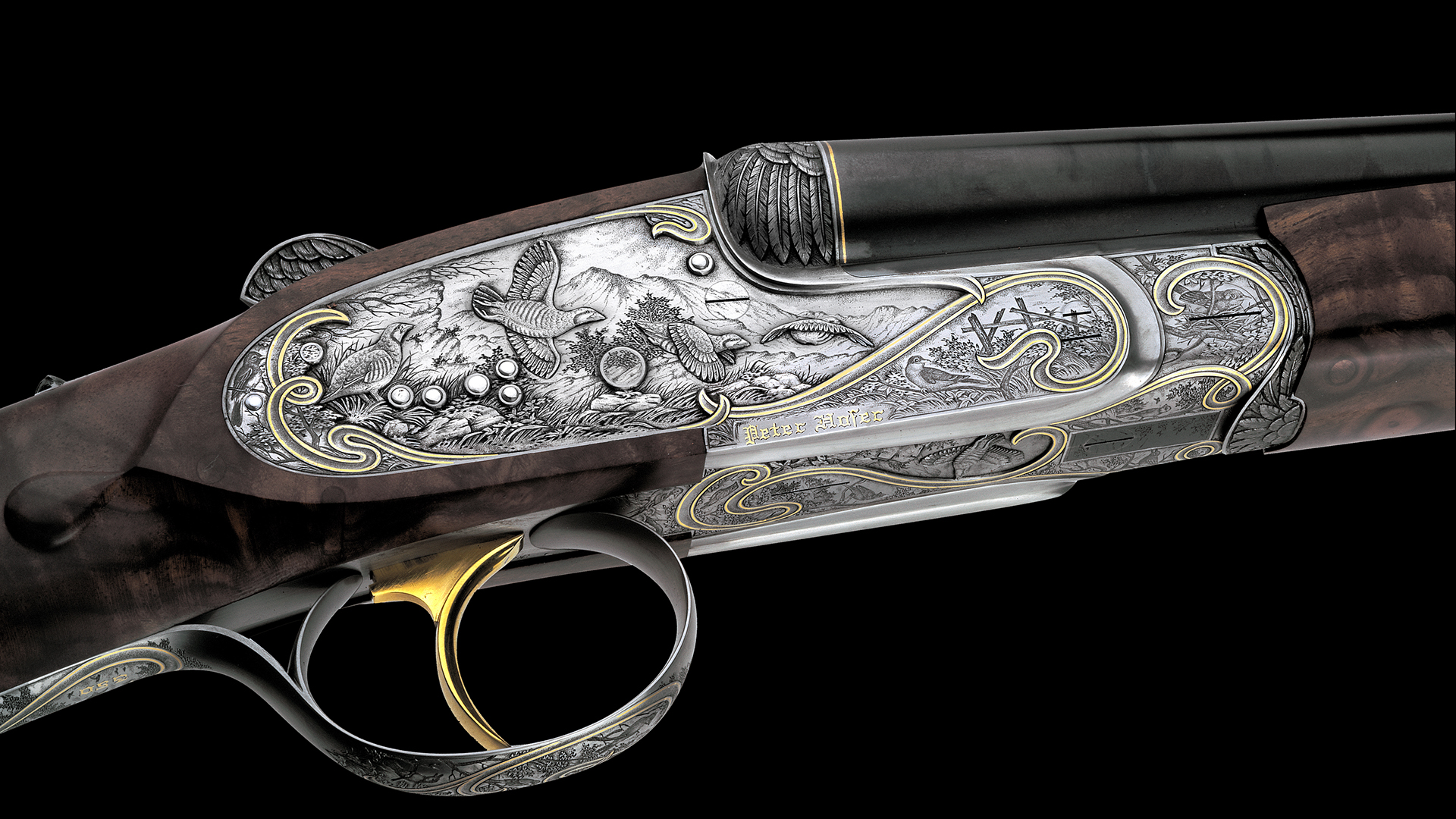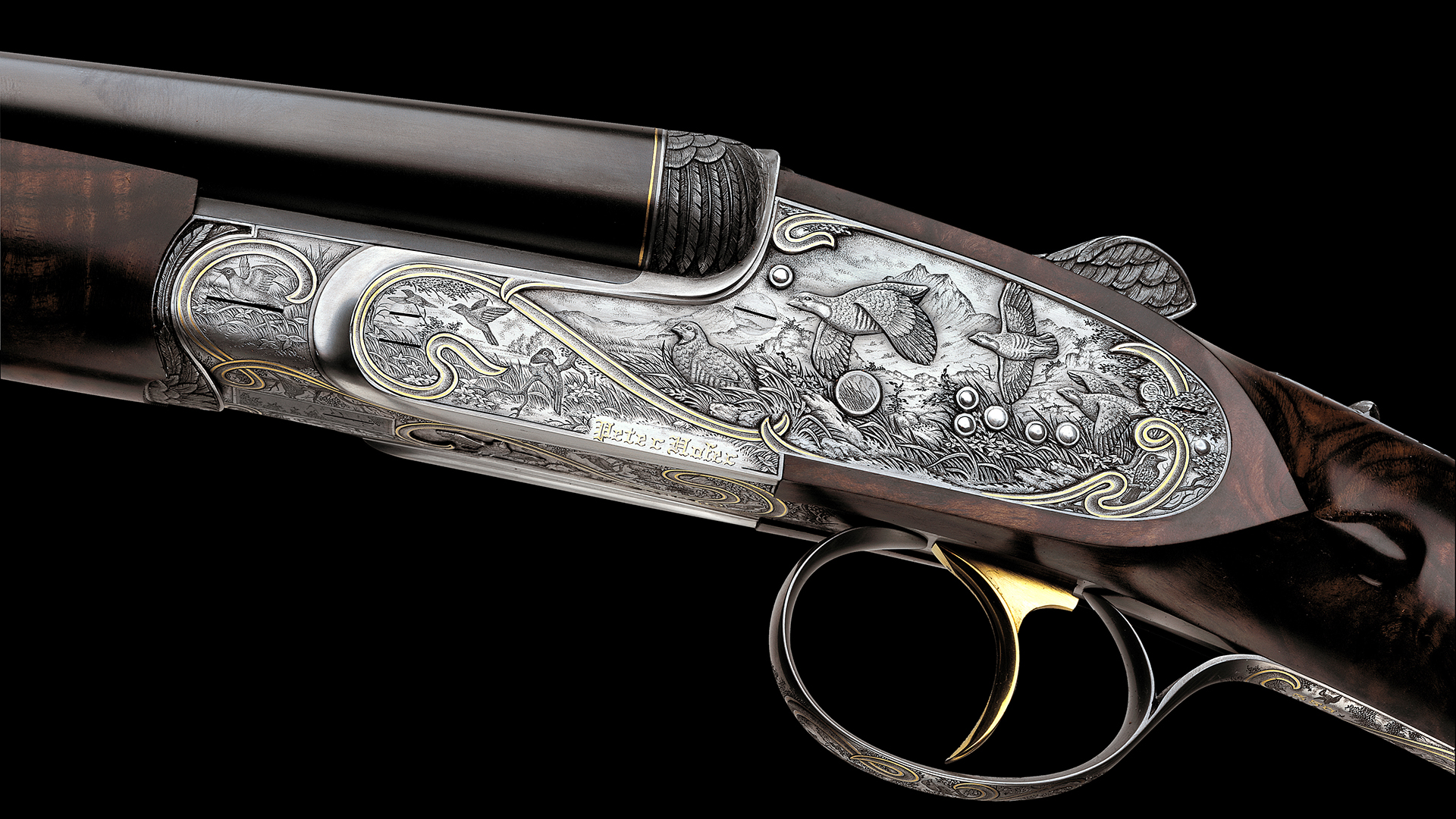 Jede Flinte dieses Sets steht im Zeichen eines bestimmten Flugwildes. Das Großartige an diesem Flintenset ist jedoch, dass nicht, wie üblich, bei jeder Flinte stets die gleiche Gravur-Komposition verwendet wurde, sondern dass jede Flinte unterschiedliche Gravurszenen aufweist und nur die Grundanordnung der Szenen beibehalten wurde, wodurch dieser einzigartige Set-Charakter erzielt werden konnte. Die Hauptszenen sind in Relieftechnik graviert und stellen jeweils eine bestimmte Flugwildart dar. Das Gefieder des jeweiligen Flugwildes wurde ebenso in Relief an der Muschlierung, am Schlüssel und am Vorderschaft graviert. Anstelle der üblichen Ornamentgravur wurden Landschaftsdarstellungen mit beeindruckenden Flugwildszenen graviert. Auch dieses Konzept wurde bei jeder einzelnen Flinte beibehalten. 24 Karat Massivgoldbänder unterstreichen überdies den Setcharakter bei jeder einzelnen Flinte.