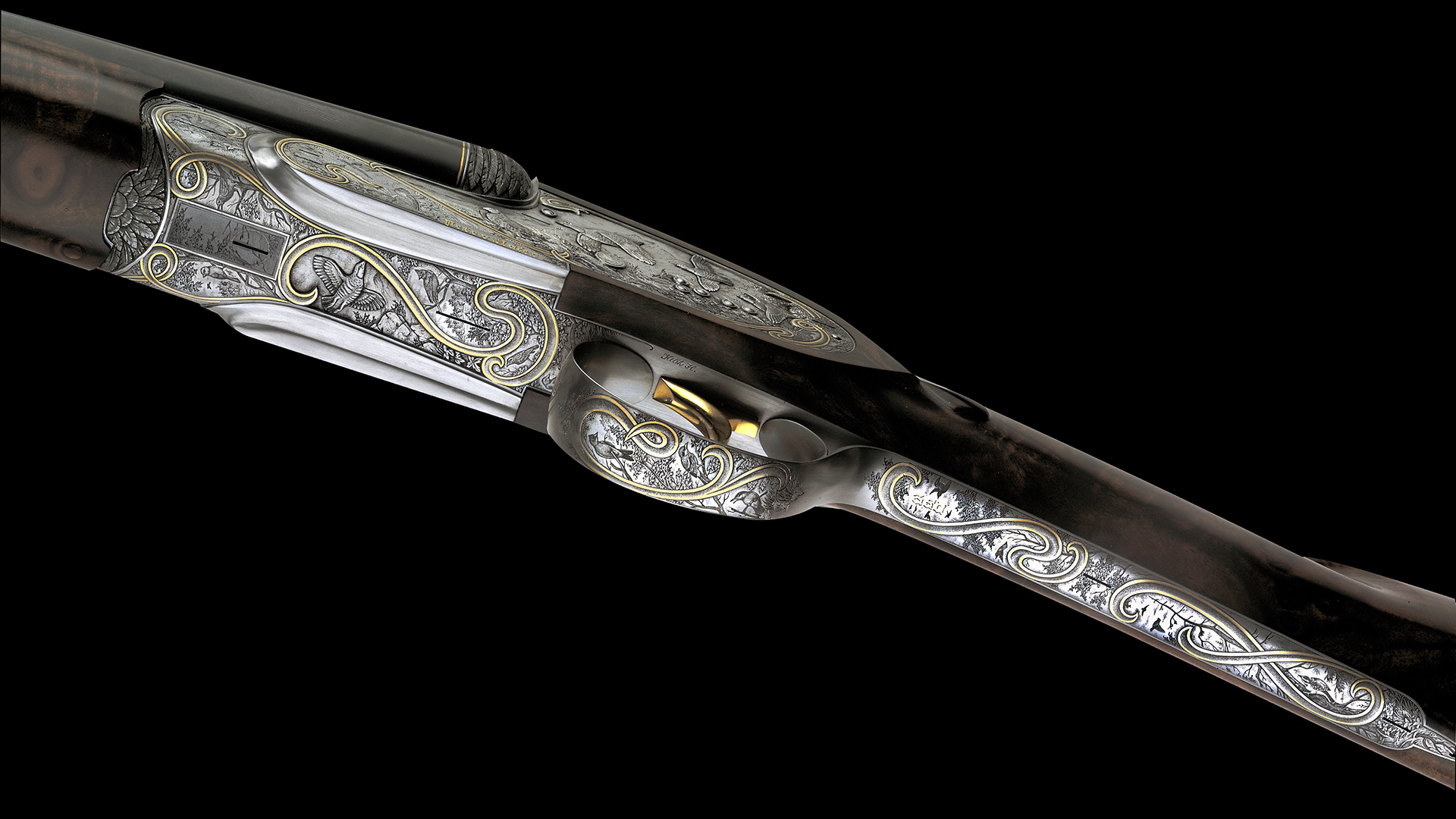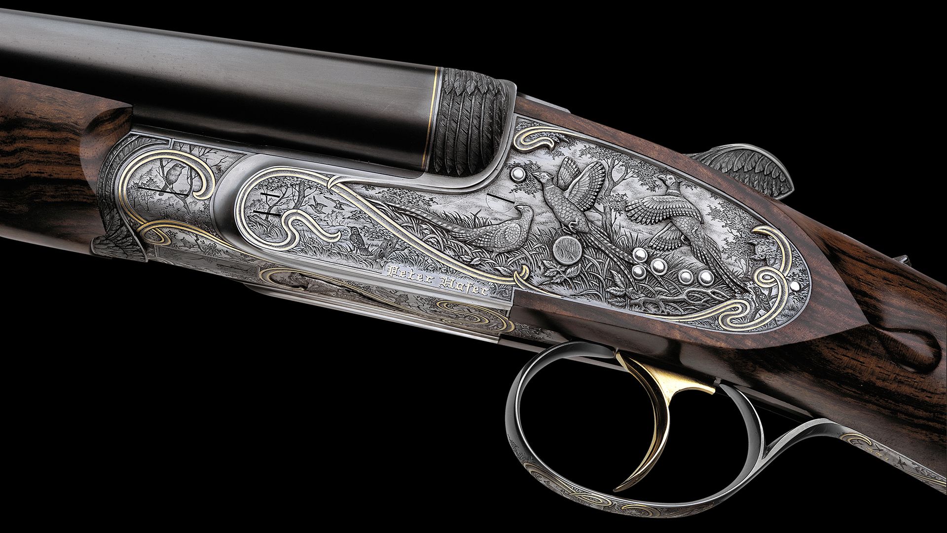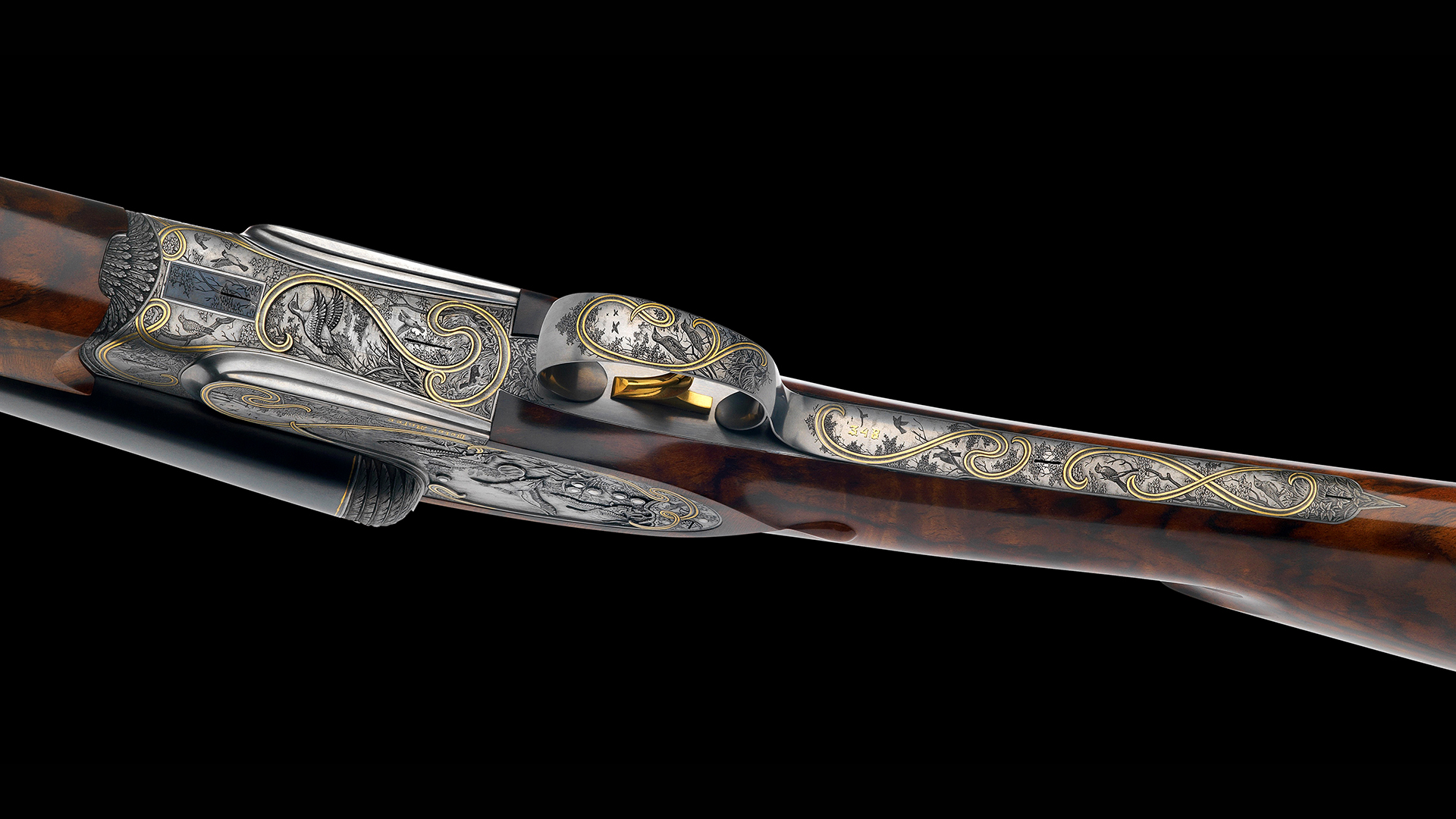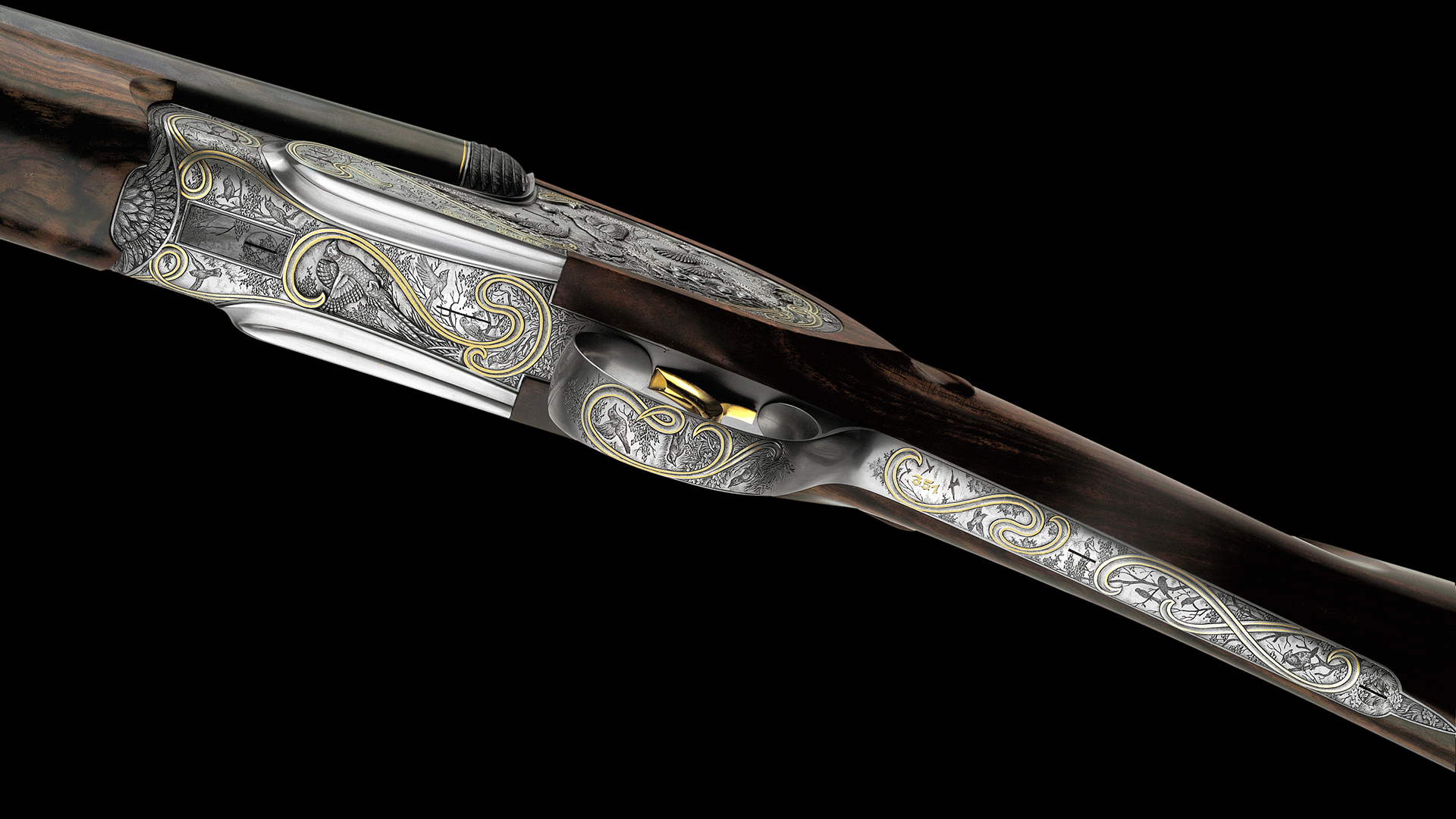 Jede Flinte dieses Sets steht im Zeichen eines bestimmten Flugwildes. Das Großartige an diesem Flintenset ist jedoch, dass nicht, wie üblich, bei jeder Flinte stets die gleiche Gravur-Komposition verwendet wurde, sondern dass jede Flinte unterschiedliche Gravurszenen aufweist und nur die Grundanordnung der Szenen beibehalten wurde, wodurch dieser einzigartige Set-Charakter erzielt werden konnte. Die Hauptszenen sind in Relieftechnik graviert und stellen jeweils eine bestimmte Flugwildart dar. Das Gefieder des jeweiligen Flugwildes wurde ebenso in Relief an der Muschlierung, am Schlüssel und am Vorderschaft graviert. Anstelle der üblichen Ornamentgravur wurden Landschaftsdarstellungen mit beeindruckenden Flugwildszenen graviert. Auch dieses Konzept wurde bei jeder einzelnen Flinte beibehalten. 24 Karat Massivgoldbänder unterstreichen überdies den Setcharakter bei jeder einzelnen Flinte.