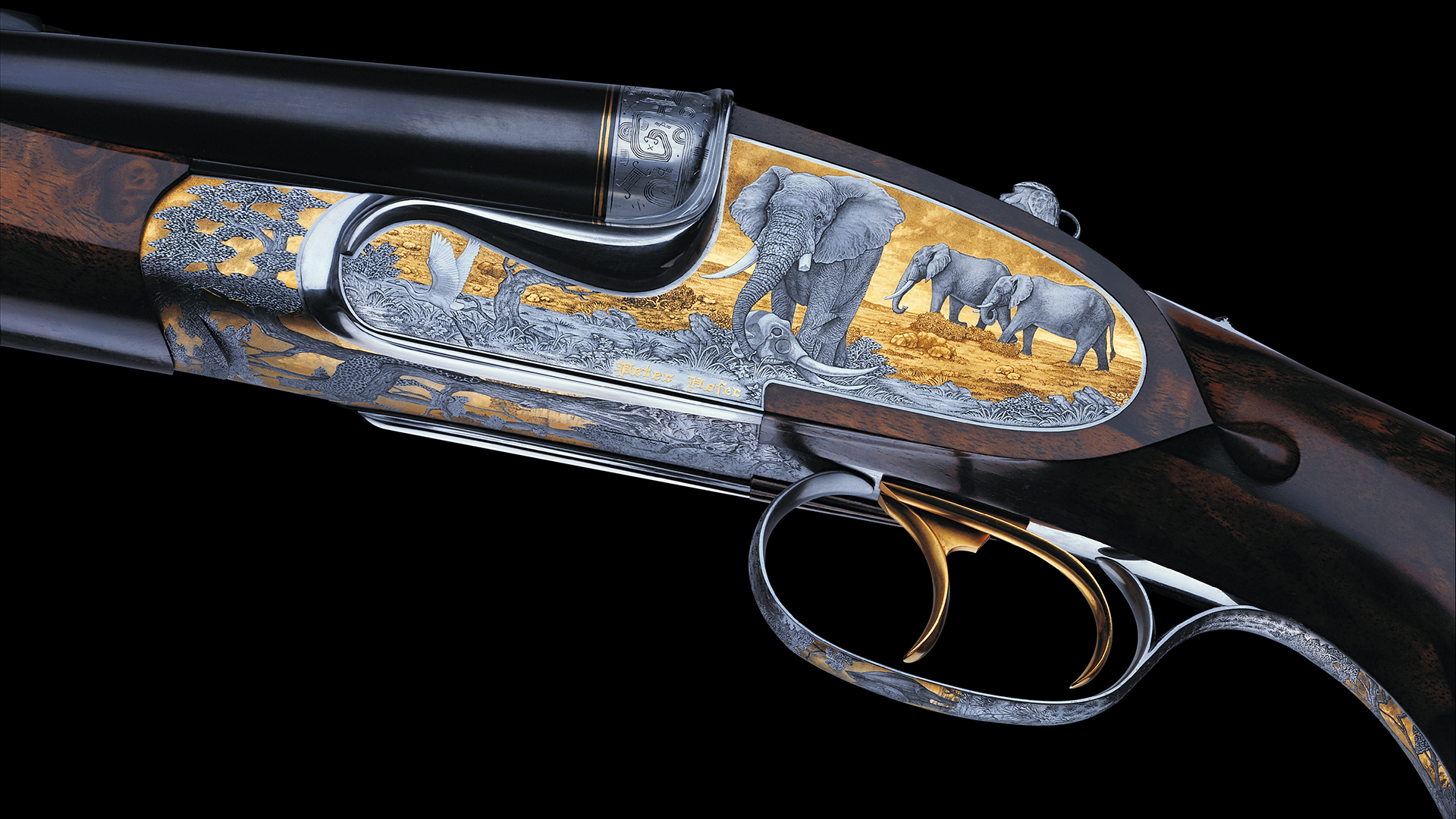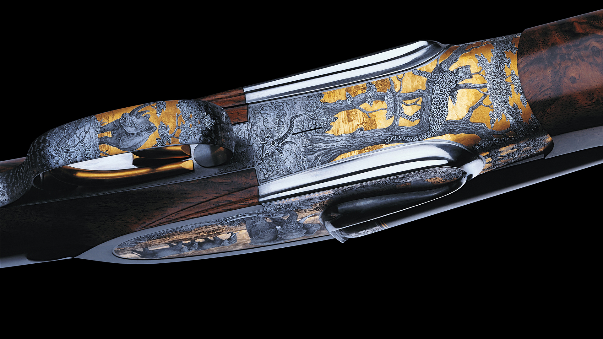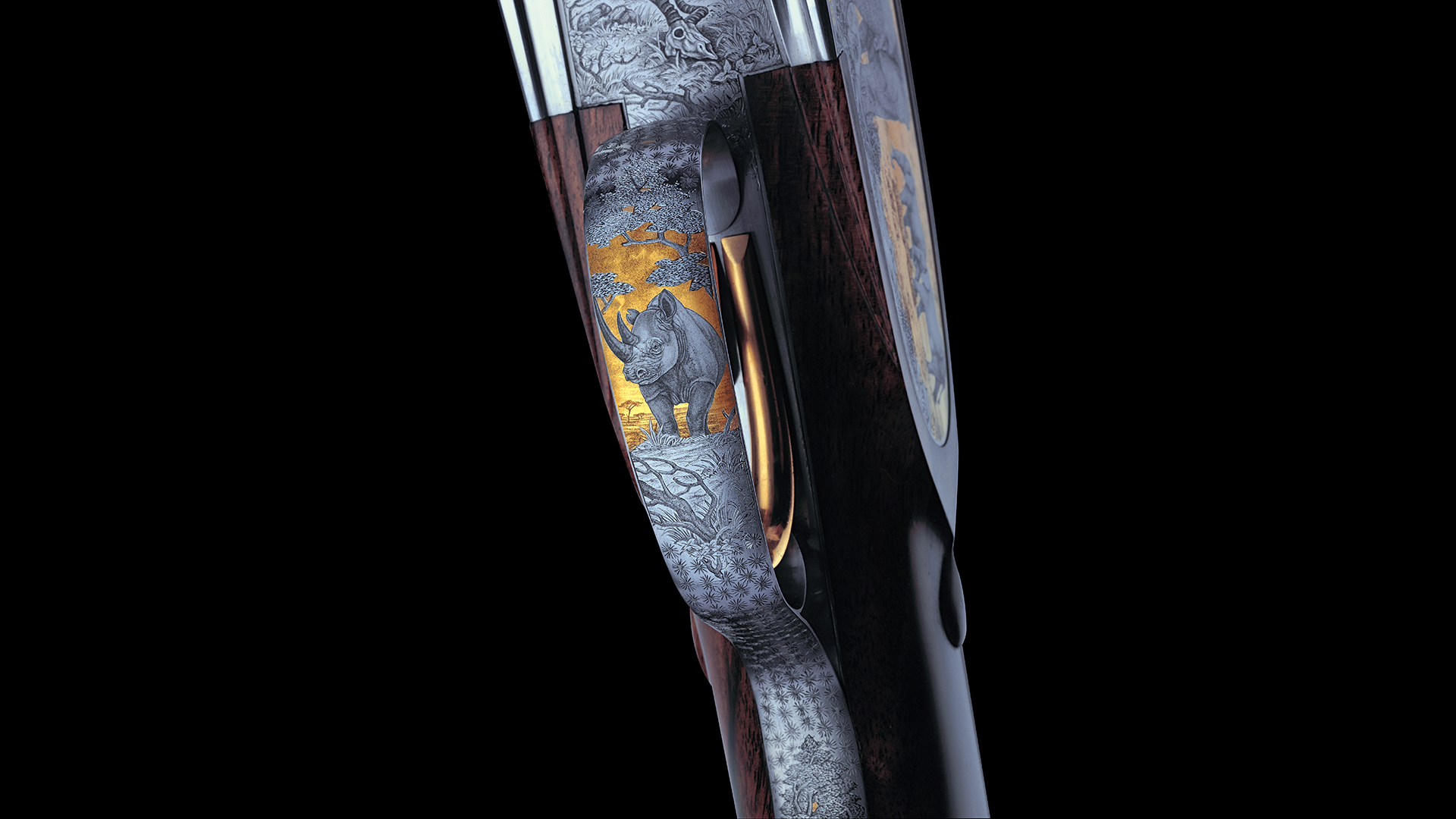 Diese Großwild Doppelbüchse ist den “Big Five” gewidmet. Sie ist eine Huldigung an die „großen Fünf“, eine Huldigung an deren Kraft und die Kraft der afrikanischen Sonne, vor deren goldenen Hintergrund die „Big Five“ verewigt wurden. Die in feinster Butinitechnik ausgeführte Gravur mit 10.000 Stichen pro Quadratmillimeter erforderte über 13.000 Stunden unter dem 40-fachen Stereomikroskop. 15 Jahre lang hat uns diese Großwilddoppelbüchse in ihrem jeweiligen Fertigungsstadium zu den Messen begleitet und konnte auf diese Weise einem internationalen Publikum gezeigt werden. Die Waffe wurde dadurch weltberühmt. Das Interesse am Fortgang der Arbeiten war enorm. Wir erhielten unzählige Kaufangebote, konnten jedoch keinen Zuschlag geben, da wir uns weder in zeitlicher noch wirtschaftlicher Hinsicht binden wollten.