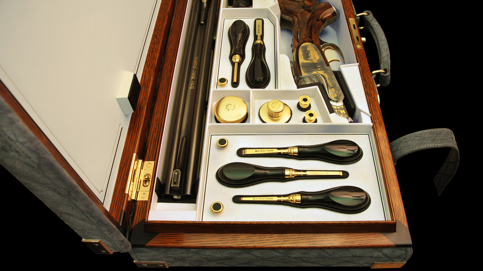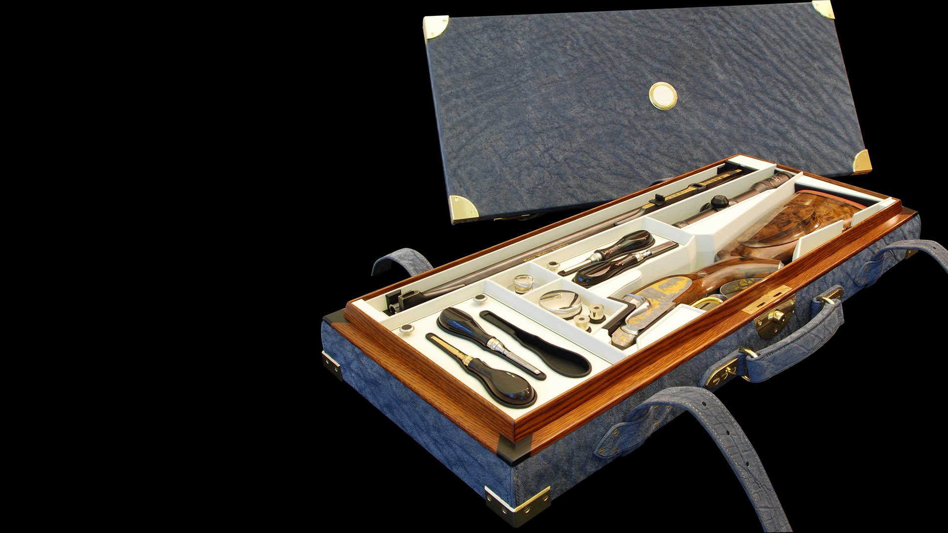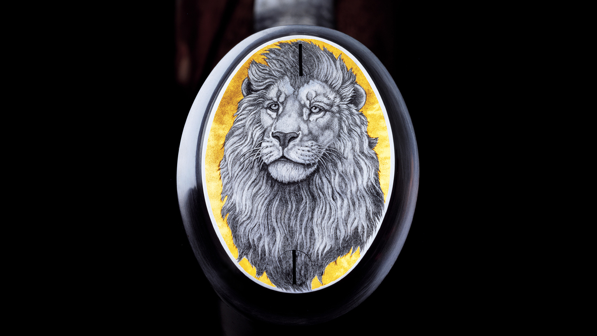 Diese Großwild Doppelbüchse ist den “Big Five” gewidmet. Sie ist eine Huldigung an die „großen Fünf“, eine Huldigung an deren Kraft und die Kraft der afrikanischen Sonne, vor deren goldenen Hintergrund die „Big Five“ verewigt wurden. Die in feinster Butinitechnik ausgeführte Gravur mit 10.000 Stichen pro Quadratmillimeter erforderte über 13.000 Stunden unter dem 40-fachen Stereomikroskop. 15 Jahre lang hat uns diese Großwilddoppelbüchse in ihrem jeweiligen Fertigungsstadium zu den Messen begleitet und konnte auf diese Weise einem internationalen Publikum gezeigt werden. Die Waffe wurde dadurch weltberühmt. Das Interesse am Fortgang der Arbeiten war enorm. Wir erhielten unzählige Kaufangebote, konnten jedoch keinen Zuschlag geben, da wir uns weder in zeitlicher noch wirtschaftlicher Hinsicht binden wollten.