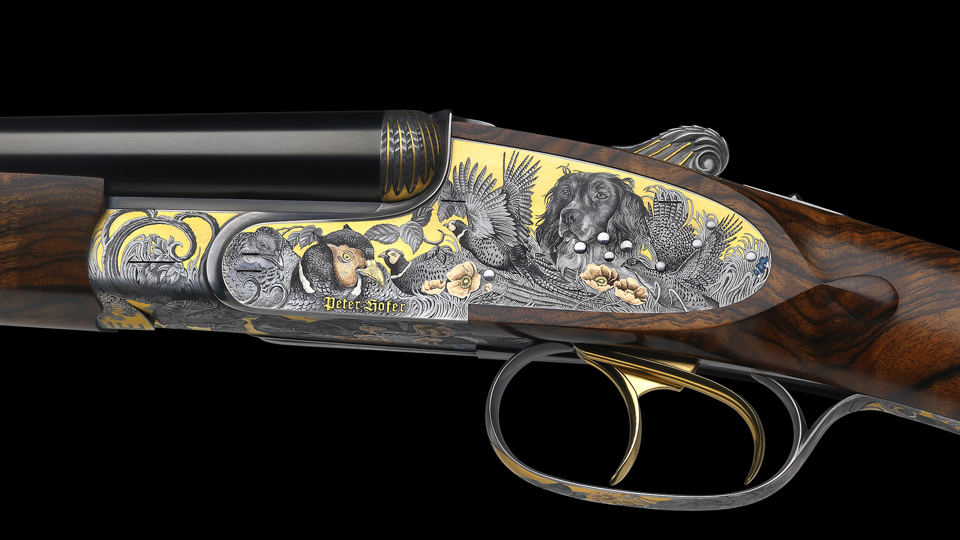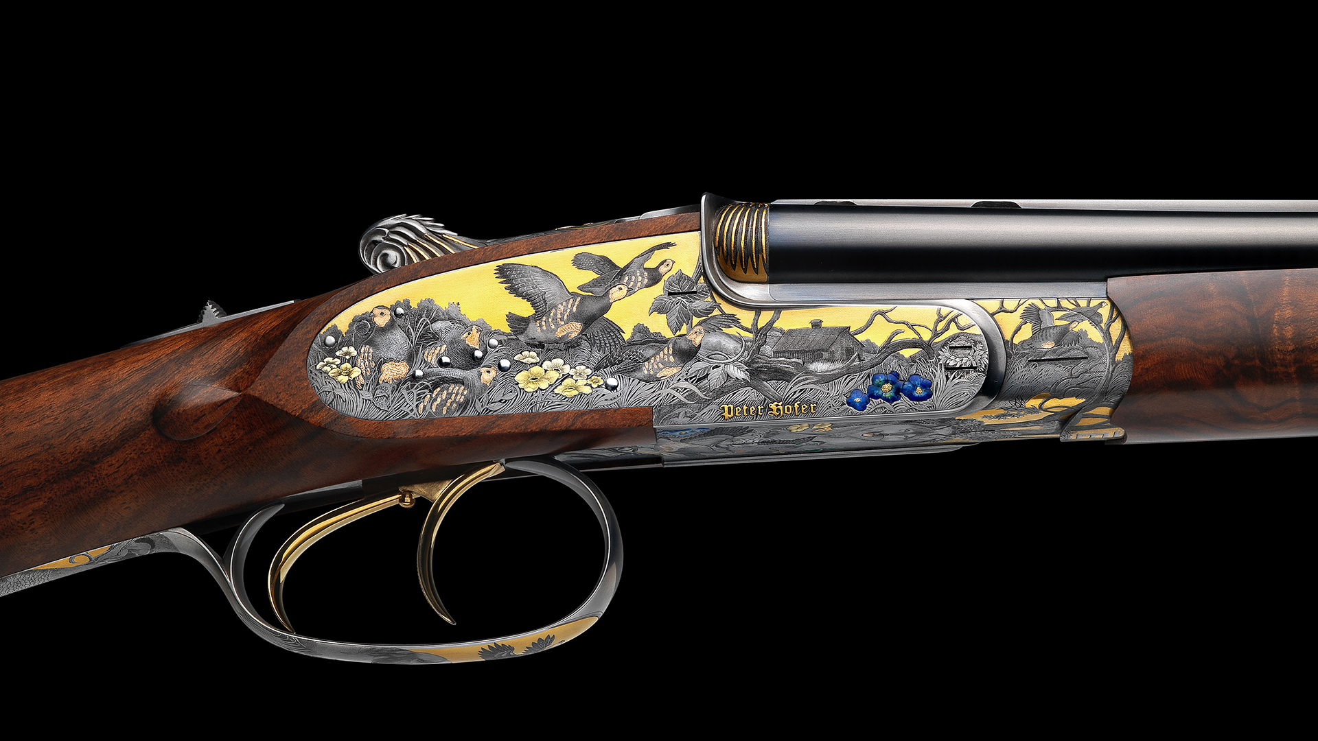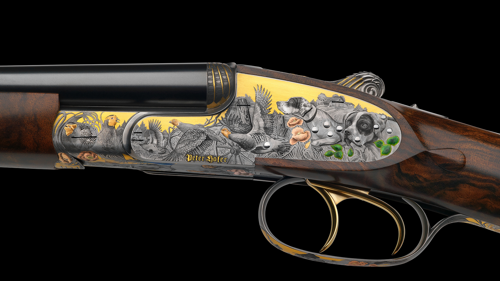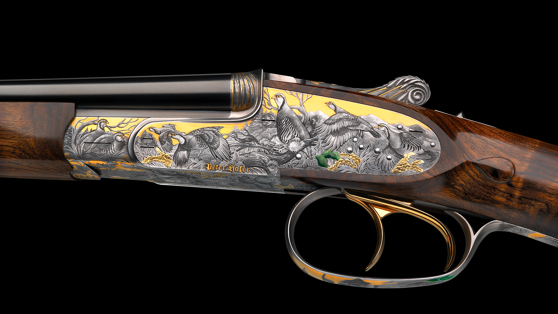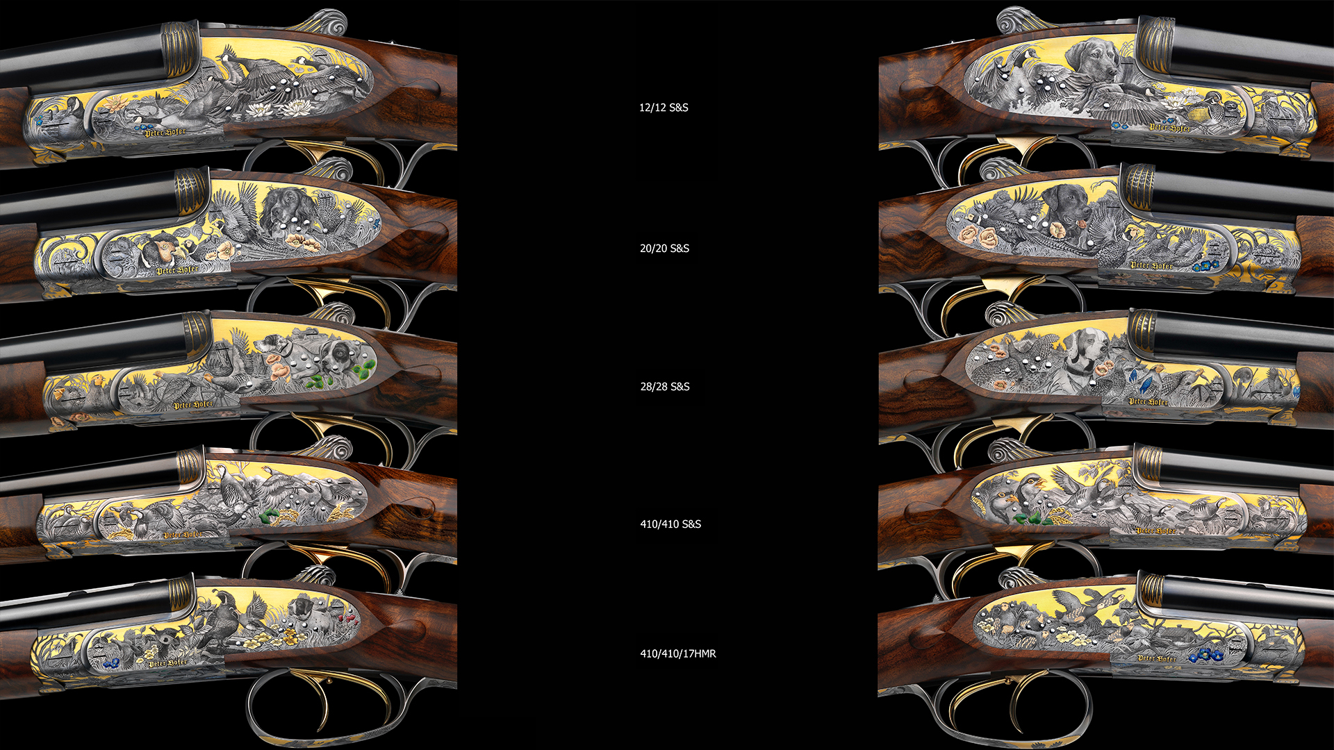 Gemäß ihrer Verwendung wurden auf jeder Flinte das Flugwild und die für dieses Wild speziell ausgebildeten Jagdhunde, sowie detailgetreue Landschaftsszenen des Jagdgebietes in feinster Bulinostichtechnik verewigt. Die 24-Karat Massivgold- und andere Edelmetalleinlagen sowie die speziell für dieses Set entwickelten Emaillierungen erzielen Effekte, die in ihrer Schönheit nur mehr von der Natur selbst übertroffen werden können.