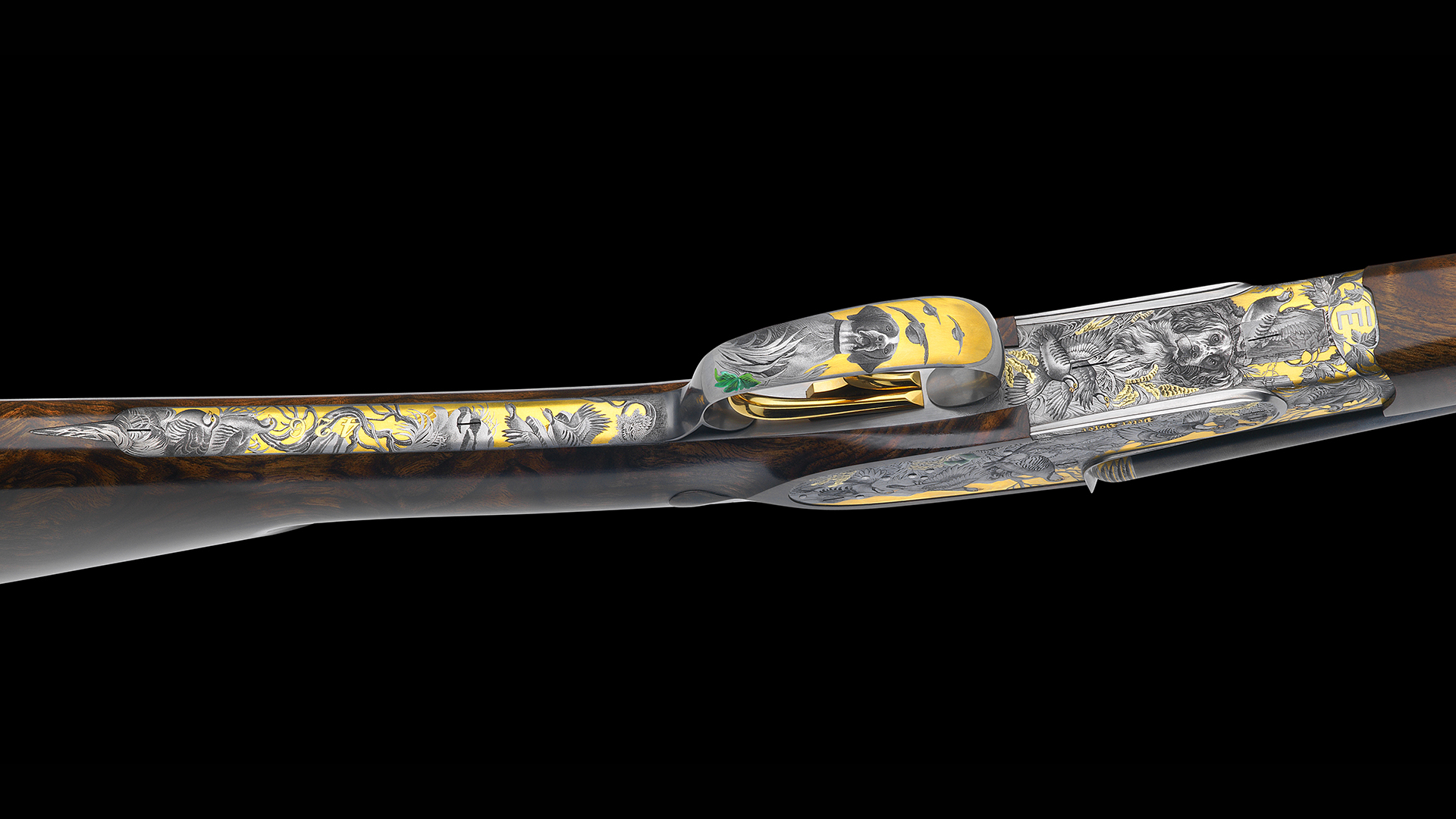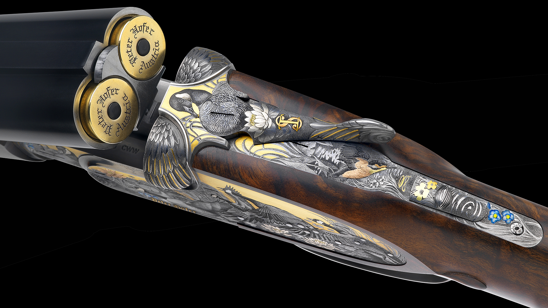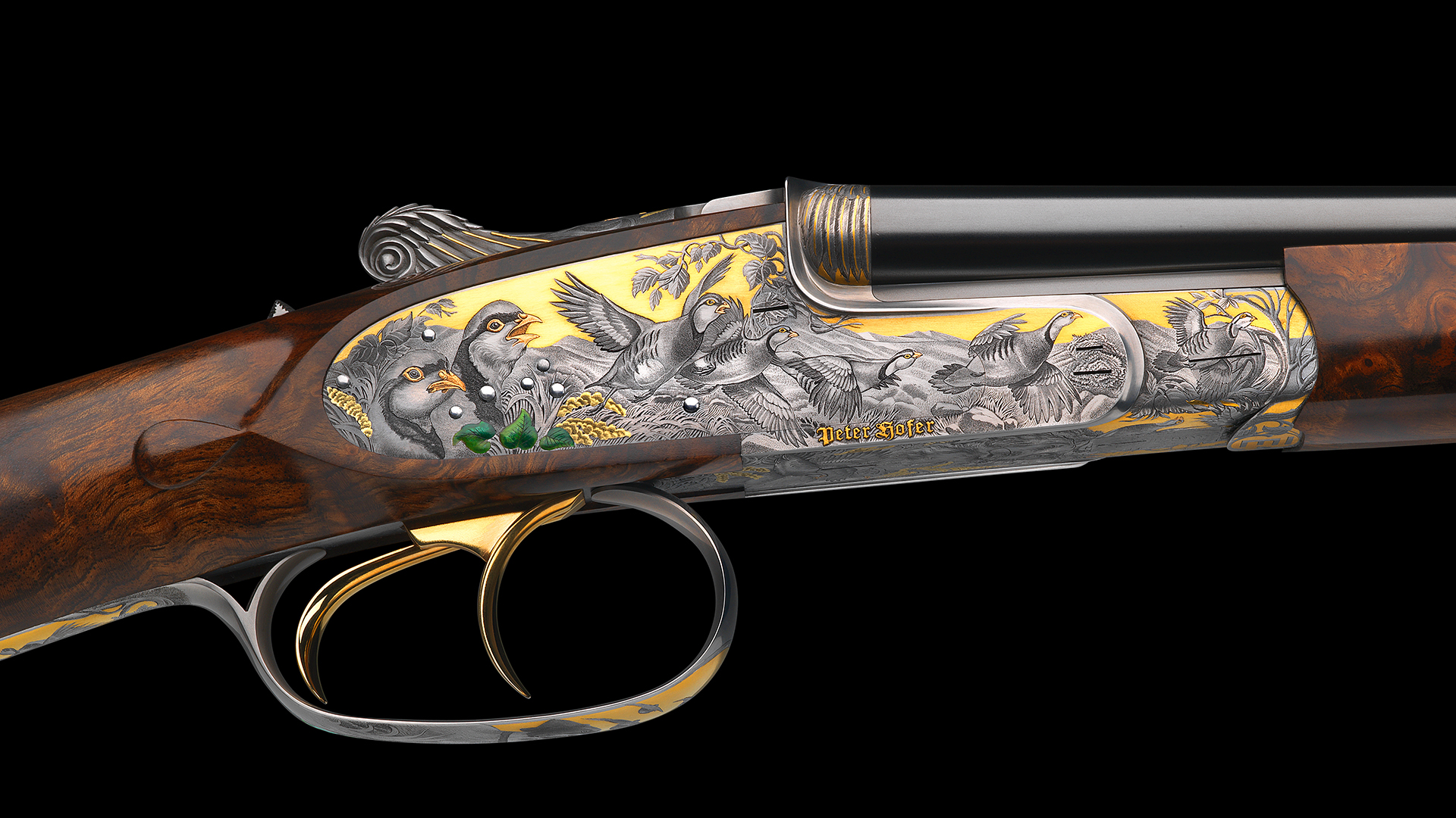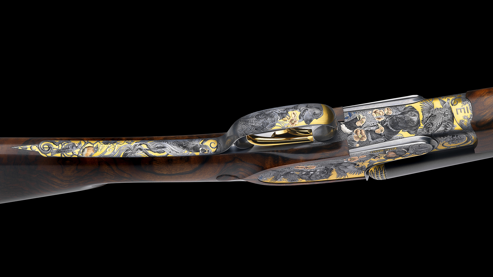 Gemäß ihrer Verwendung wurden auf jeder Flinte das Flugwild und die für dieses Wild speziell ausgebildeten Jagdhunde, sowie detailgetreue Landschaftsszenen des Jagdgebietes in feinster Bulinostichtechnik verewigt. Die 24-Karat Massivgold- und andere Edelmetalleinlagen sowie die speziell für dieses Set entwickelten Emaillierungen erzielen Effekte, die in ihrer Schönheit nur mehr von der Natur selbst übertroffen werden können.