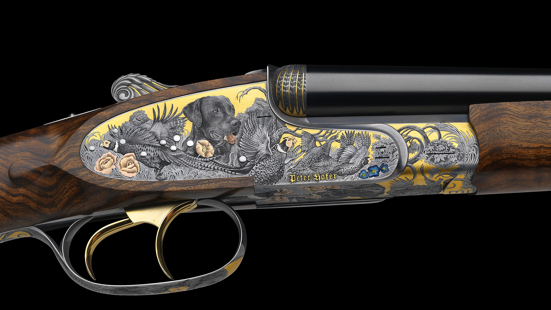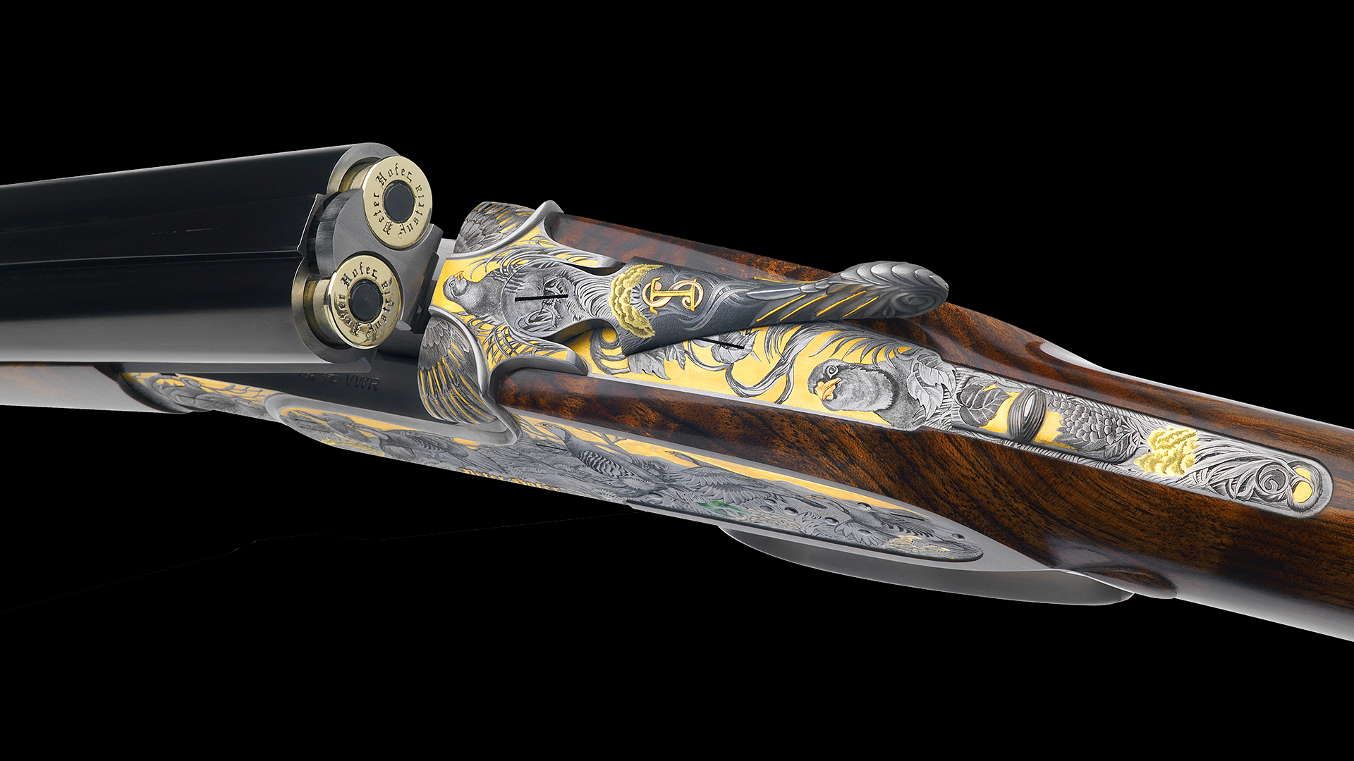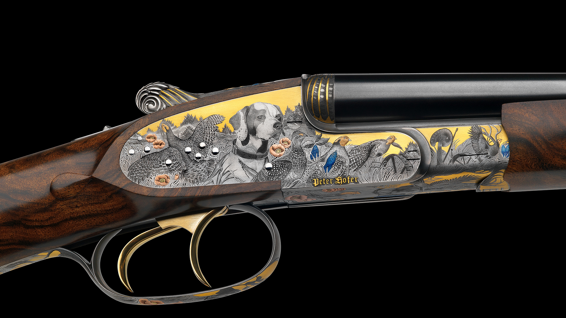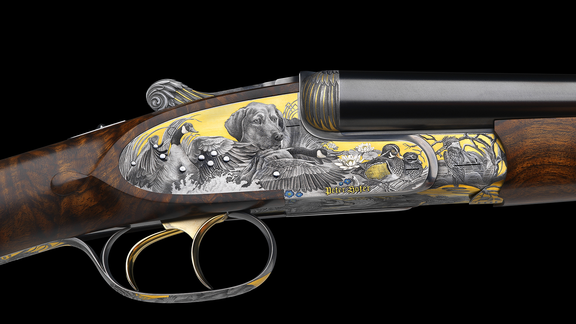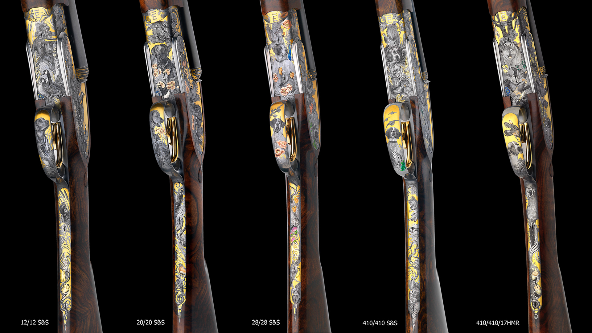 Gemäß ihrer Verwendung wurden auf jeder Flinte das Flugwild und die für dieses Wild speziell ausgebildeten Jagdhunde, sowie detailgetreue Landschaftsszenen des Jagdgebietes in feinster Bulinostichtechnik verewigt. Die 24-Karat Massivgold- und andere Edelmetalleinlagen sowie die speziell für dieses Set entwickelten Emaillierungen erzielen Effekte, die in ihrer Schönheit nur mehr von der Natur selbst übertroffen werden können.