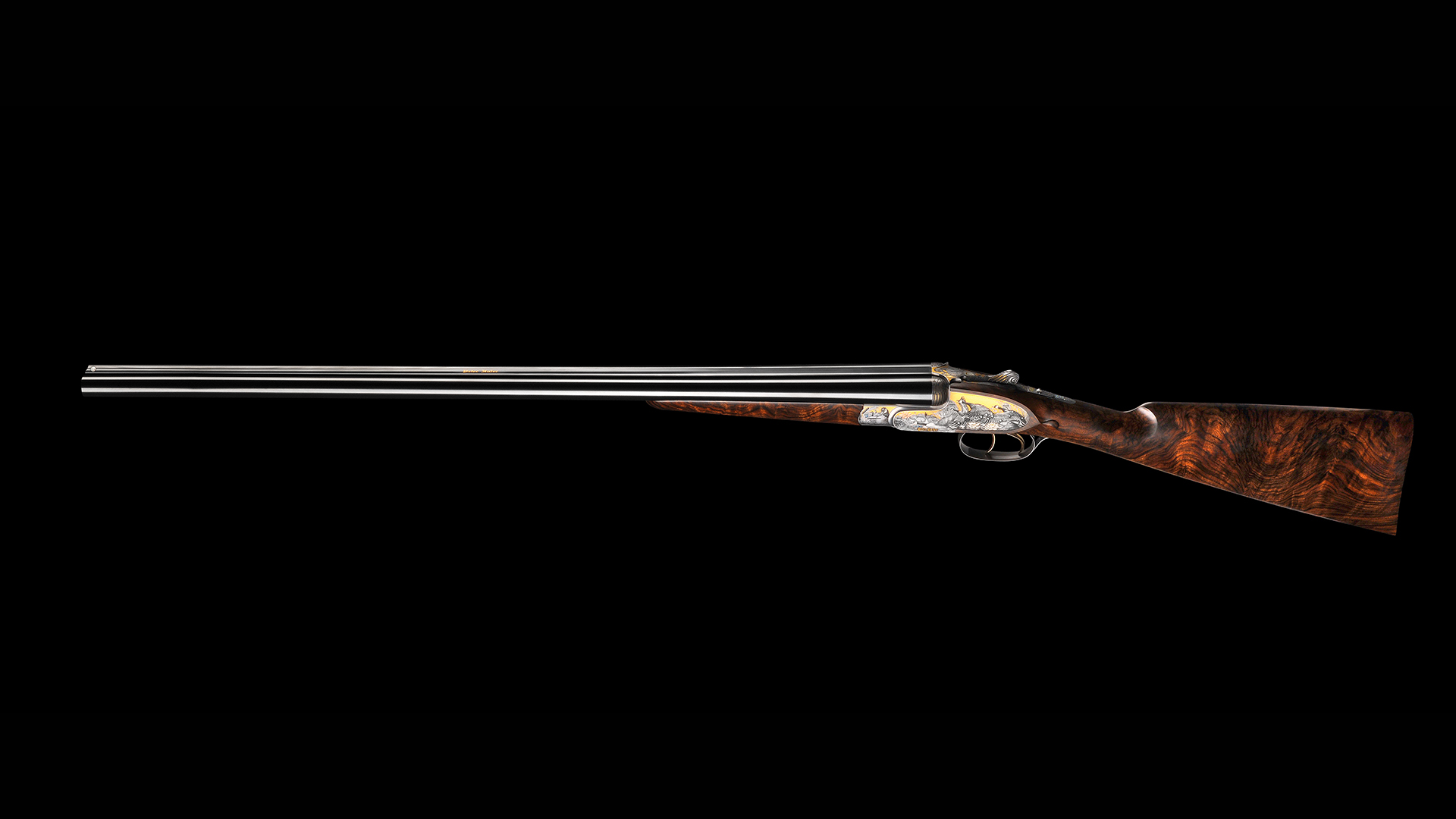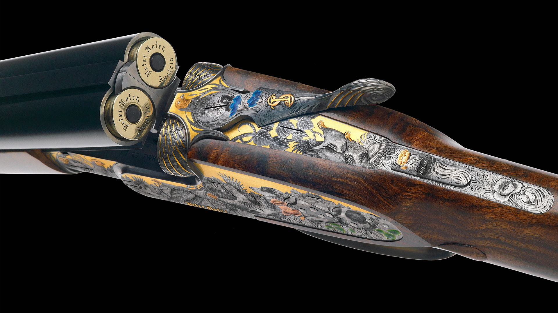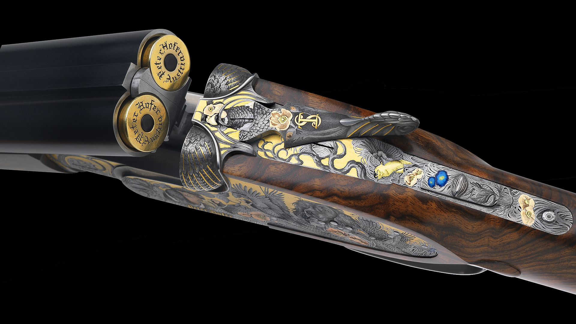 Weltrekord Die Peter Hofer Spezialdoppelflinte mit verstecktem Kugellauf • Kaliber 410 Mag / 17HMR / 410 Mag • 2 Seitenschlösser • 1 innenliegendes drittes Schloss für den Kugellauf • Ejektor für die beiden Schrotläufen • Separater Extraktor für den Kugellauf