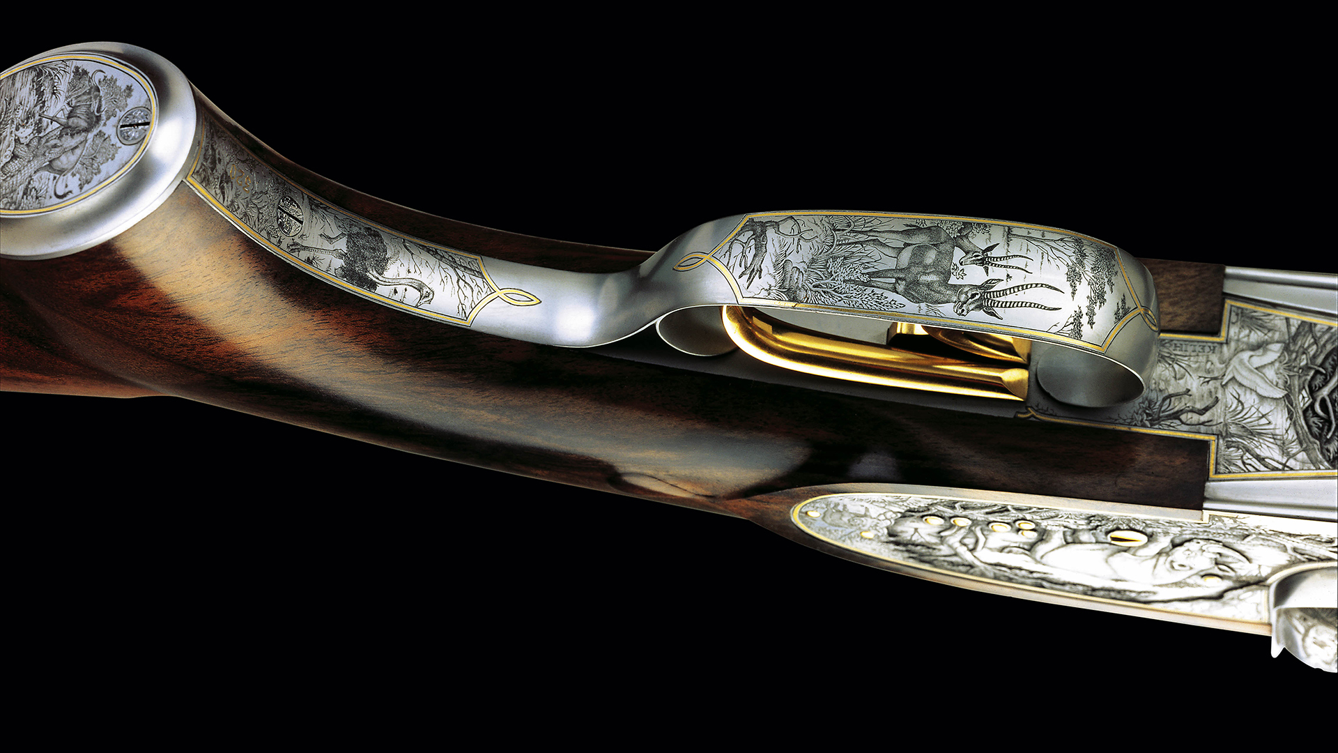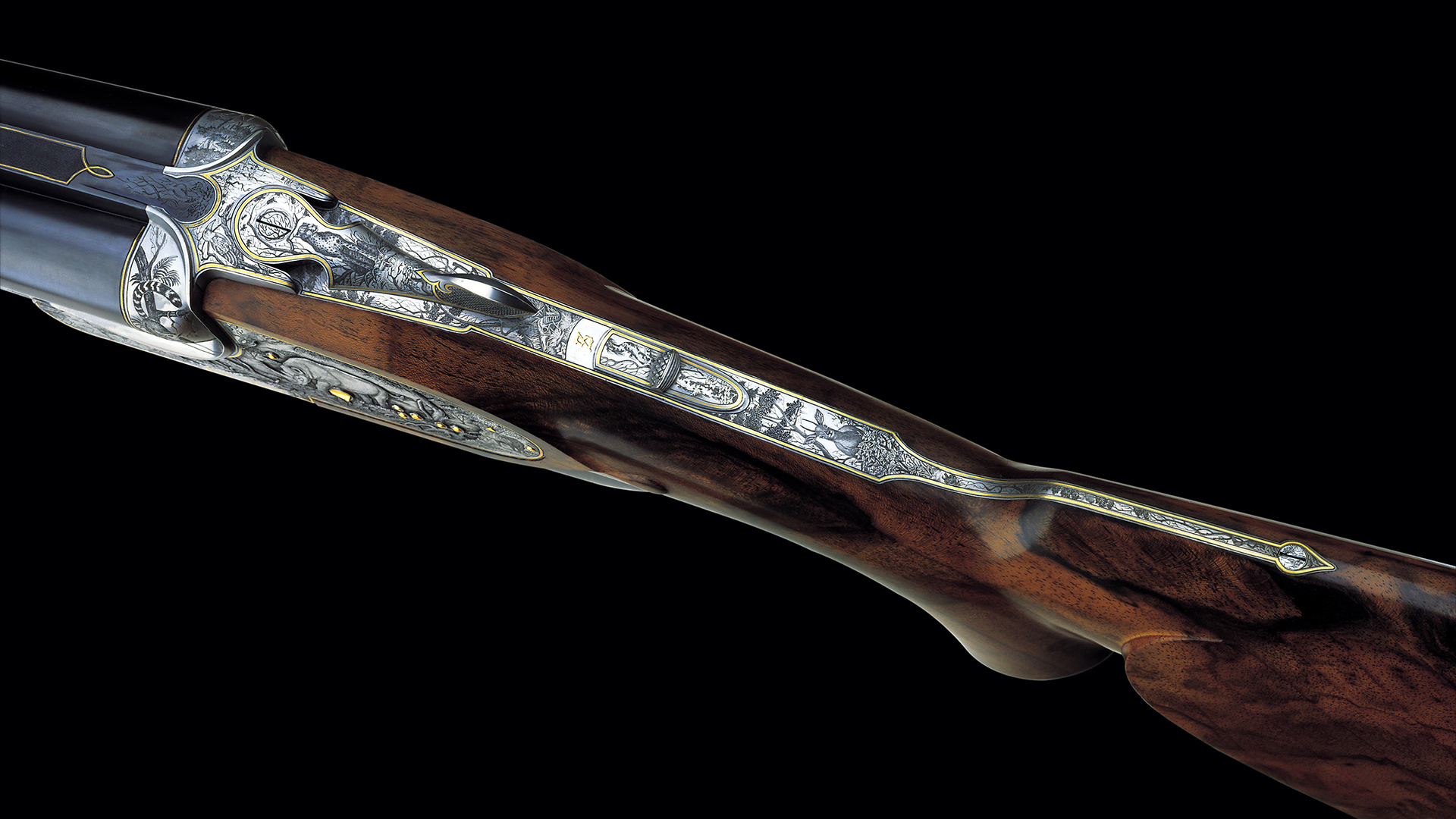 • Peter Hofer Spezial Seitenschloss System mit Fangstange und doppelter Laufhakenverriegelung und verdeckter oberster Laufverriegelung • Spezial Ejektor und Toplever • Markant stufenförmig abgesetzte Seitenflächen des Basküls • Nach hinten in der Breite verjüngte Seitenschlösser und Seitenflächen für zierliche Schäftung trotz großen Kalibers