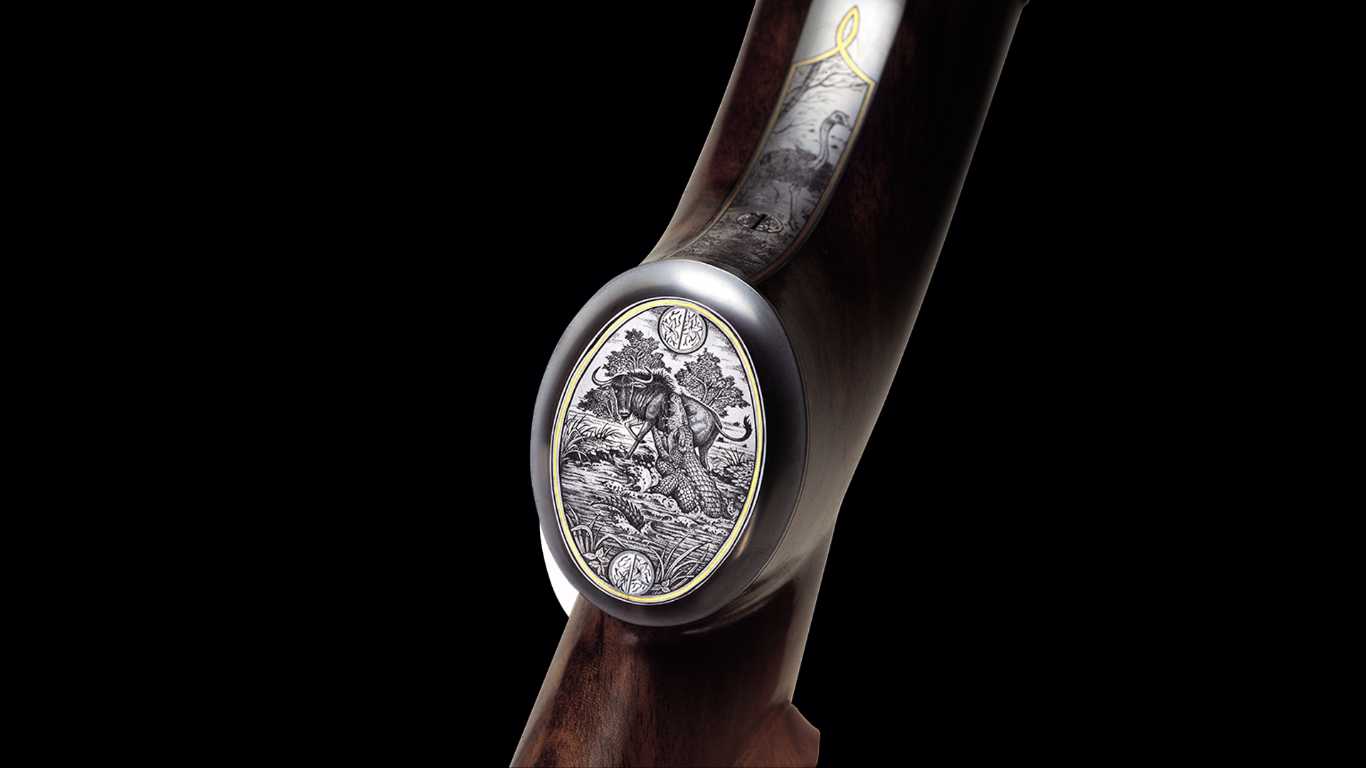 Die in Relief Technik ausgeführte Gravur ist von drei Hauptszenen dominiert und bringt Büffel, Nashorn und Elefant ausdrucksstark zur Geltung. Die afrikanische Buschlandschaft mit den typischen Tieren der Savanne rundet diese Gesamtkomposition in einer einzigartigen Schattierungstechnik ab.