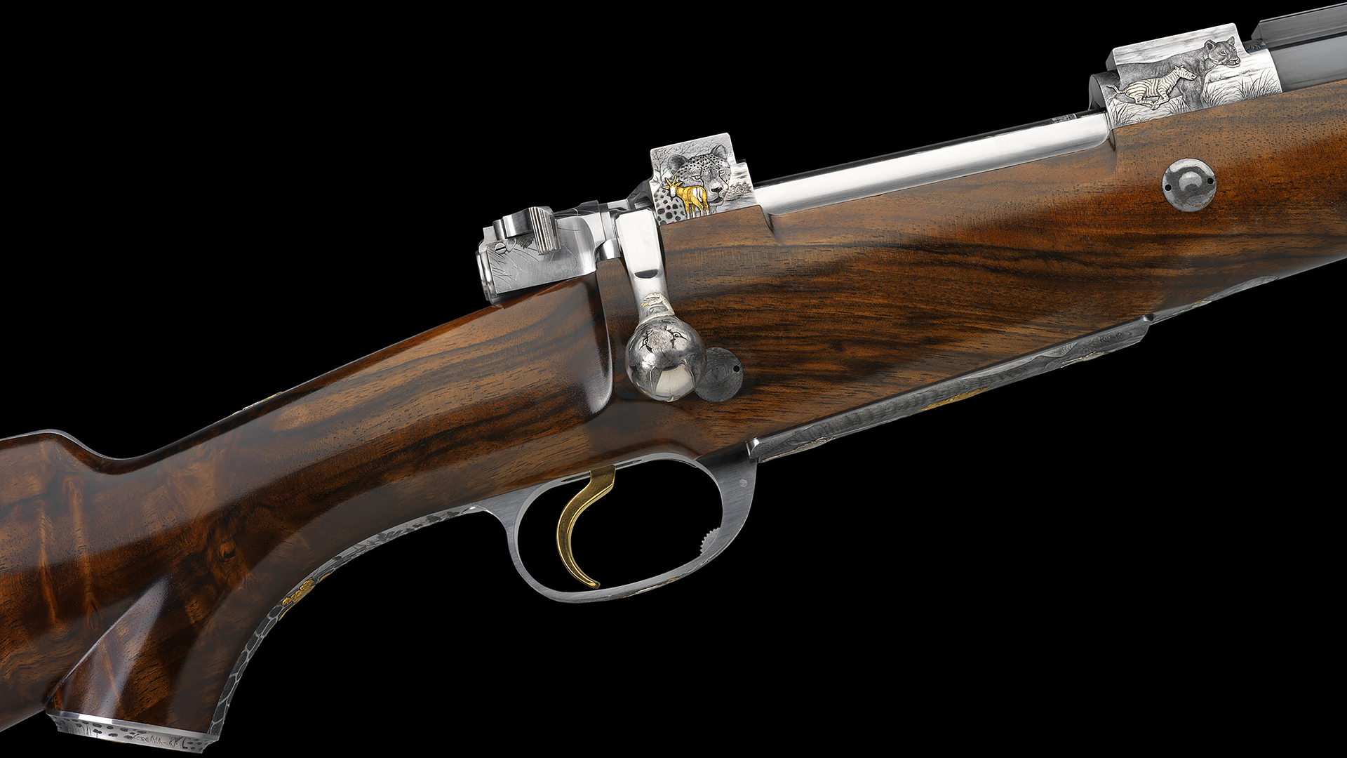 • Robust geschmiedetes Magnum Mausersystem mit verlängerter Scheibe, verlängertem Abzugsbügel, vergrößertem Magazin für 5 Patronen, verstärktem Lauf mit Spezialschiene sowie Kornsattel und zwei robust verarbeiteten Riemenbügeln