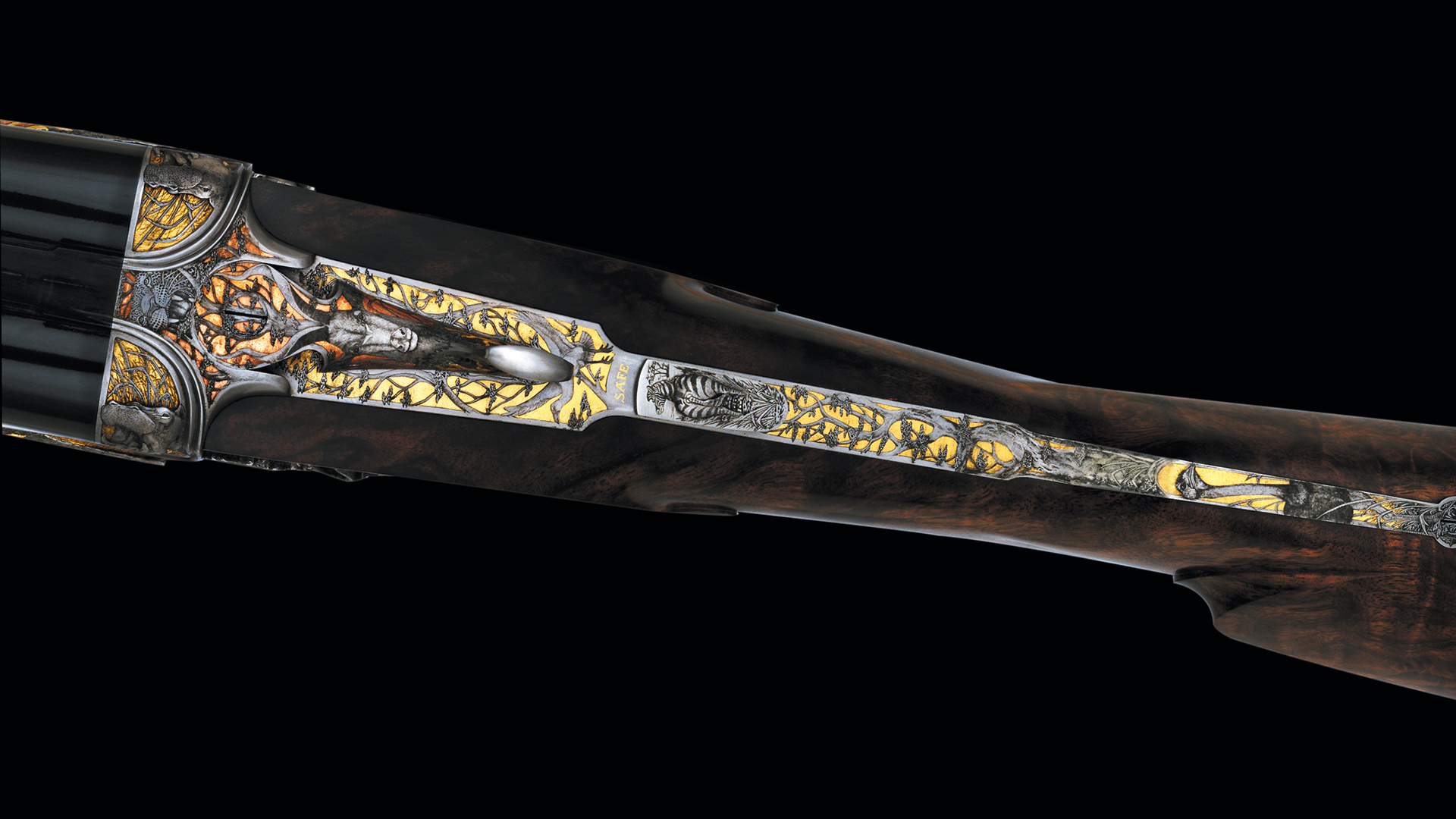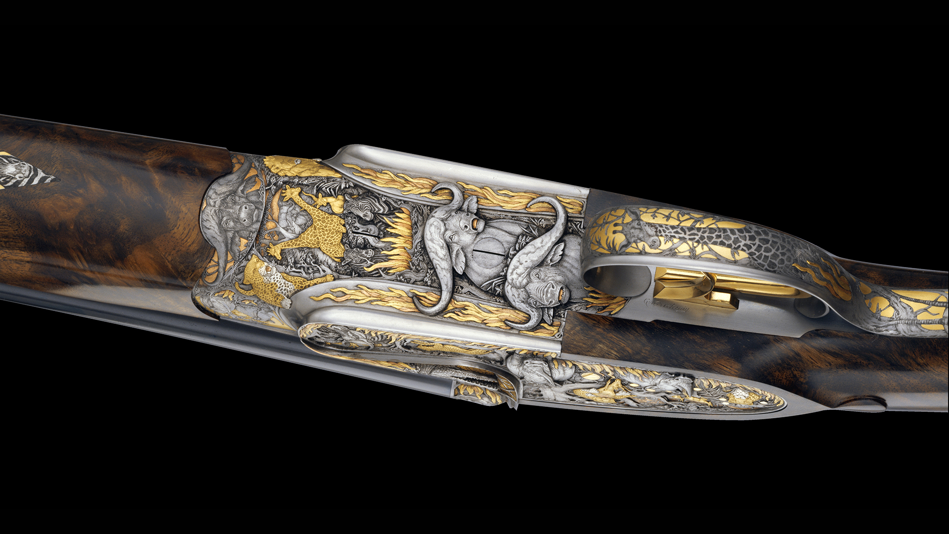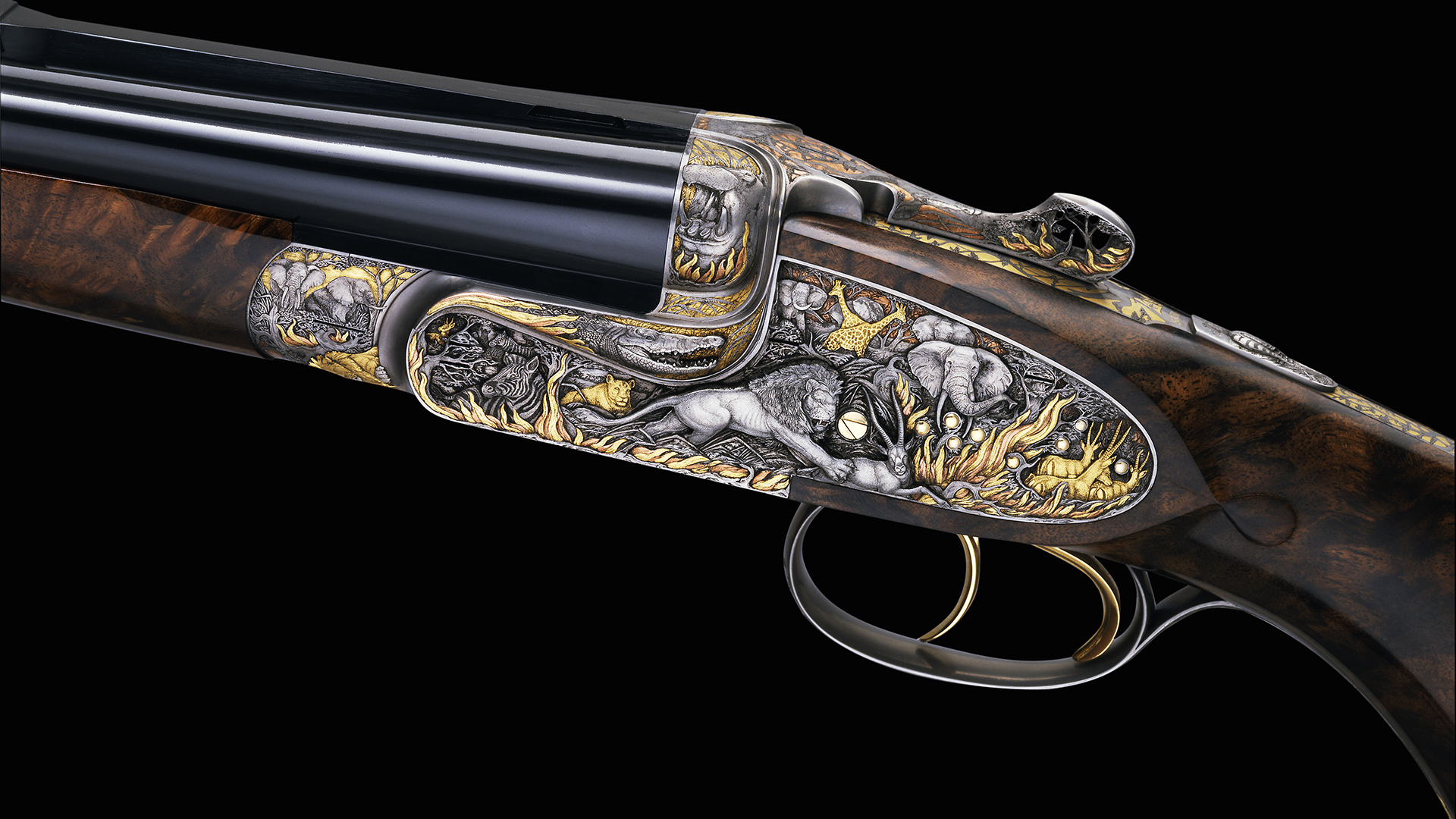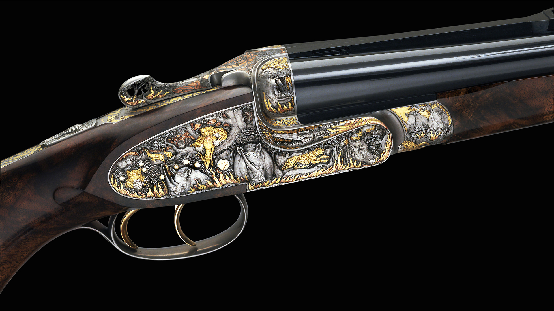 In seinem Werk „Buschfeuer in Afrika“ hat Peter Hofer die imposantesten Vertreter der afrikanischen Fauna in einer äußerst dramatischen Szenerie verewigt. Die Ausführung dieser atemberaubenden Gravurkreation erfolgte in unterschiedlichen Ebenen und lässt in perspektivischer Darstellung den weit entfernten und vom Feuer rot gefärbten Horizont erkennen. Die vor den Flammen in alle Richtungen fliehenden Tiere scheinen förmlich aus der Waffe zu springen.