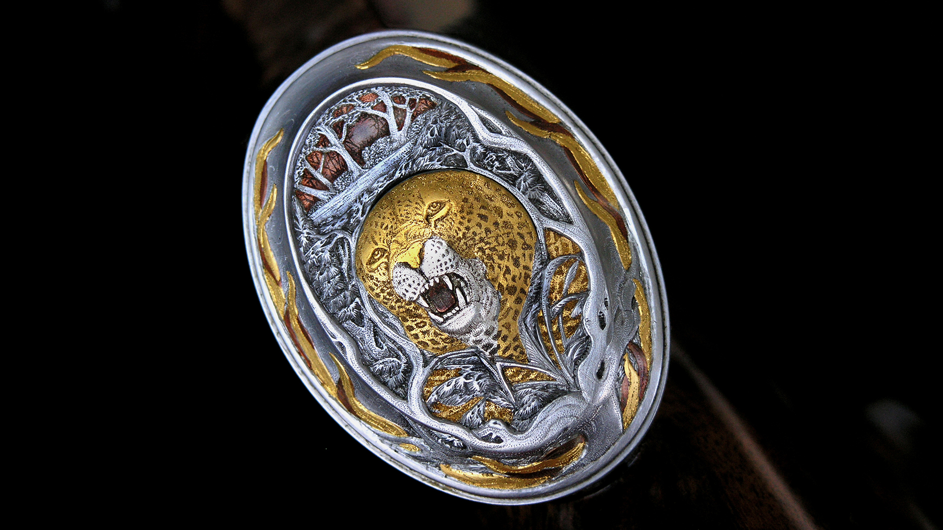 Wer einmal ein Buschfeuer in Afrika miterlebt hat, weiß in welcher Hektik sich die Ereignisse überschlagen. Die lebensbedrohende Situation und die Panik der Tiere wurden hier in so beeindruckender Weise und Perfektion wiedergegeben, dass man vermeint, das Lodern der Flammen und den Geruch des Feuers wahrzunehmen. Der Kontrast zwischen den in 24-karätigem Massivgold eingelegten Leoparden, Giraffen, Antilopen und dem grauen Stahl der Elefanten, Büffel und Nashörner ist atemberaubend schön und unübertroffen perfekt.