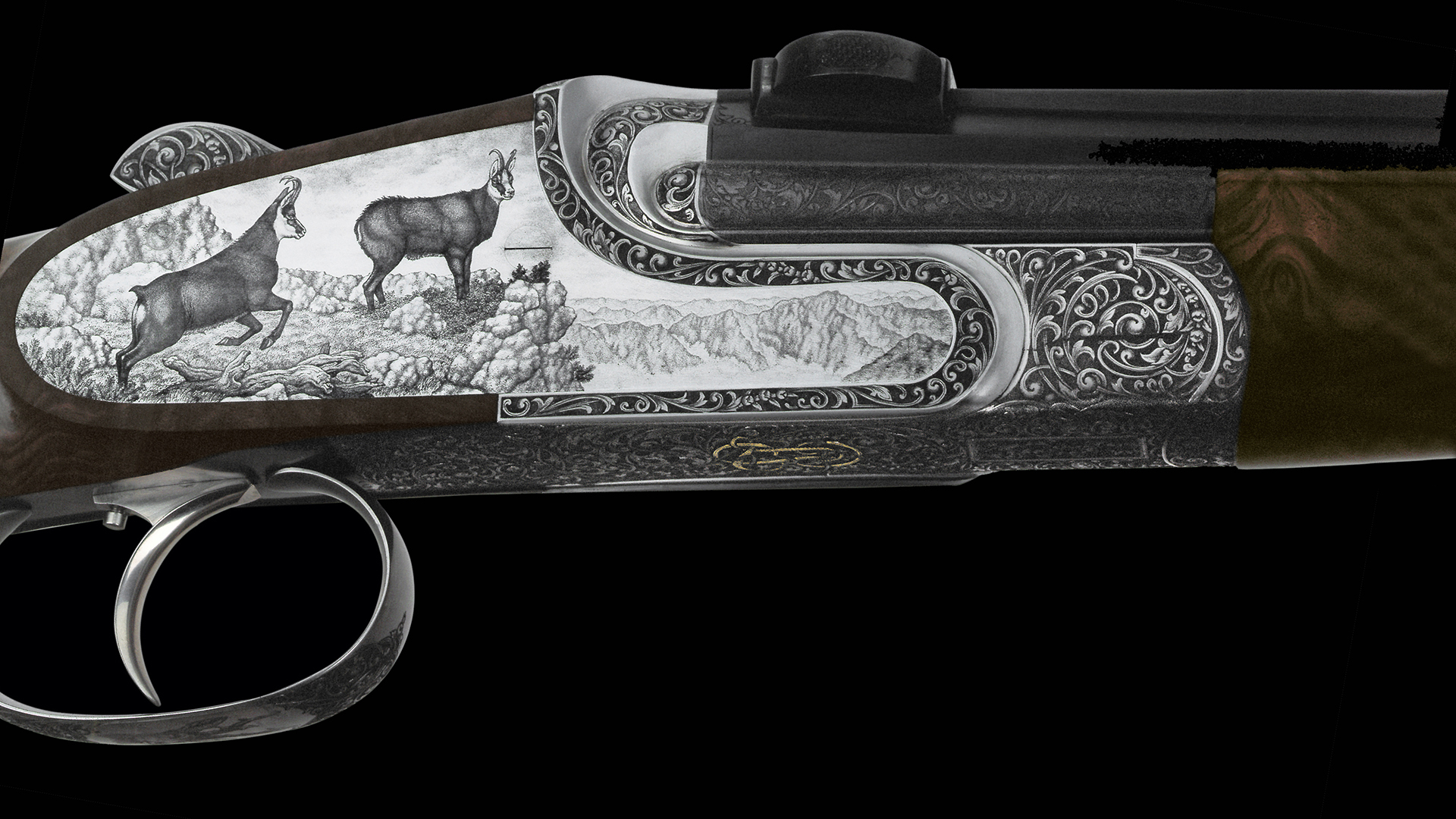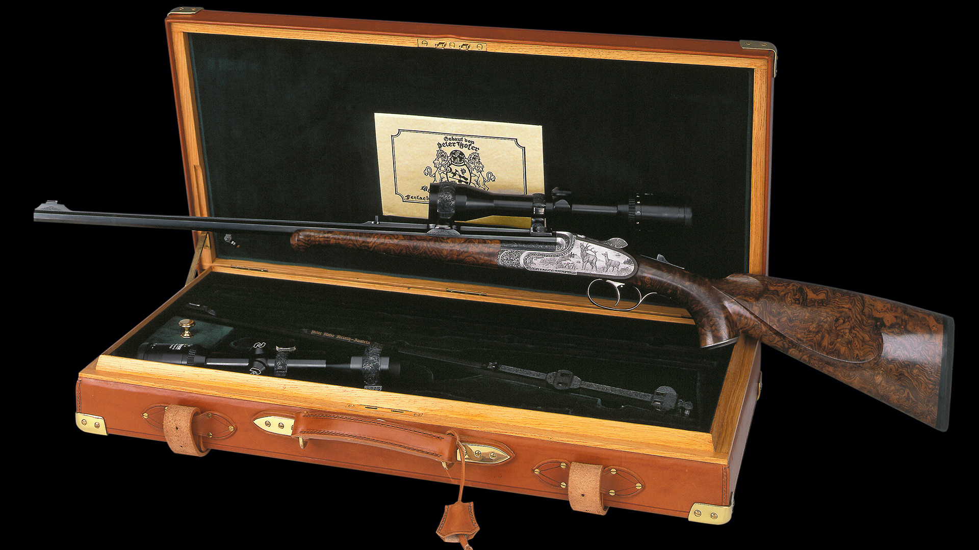 Extravagant geformte Kipplaufbüchse mit separater Peter Hofer Sicherheitskugelspannung und einem Gesamtgewicht von nur 2,3 kg. Eine absolut formschöne Waffe von höchster Perfektion. Die künstlerische Ausführung der Waffe erfolgte in einer extrem fein gearbeiteten Bulino Gravur mit 4.000 Stichen pro Quadratmillimeter.