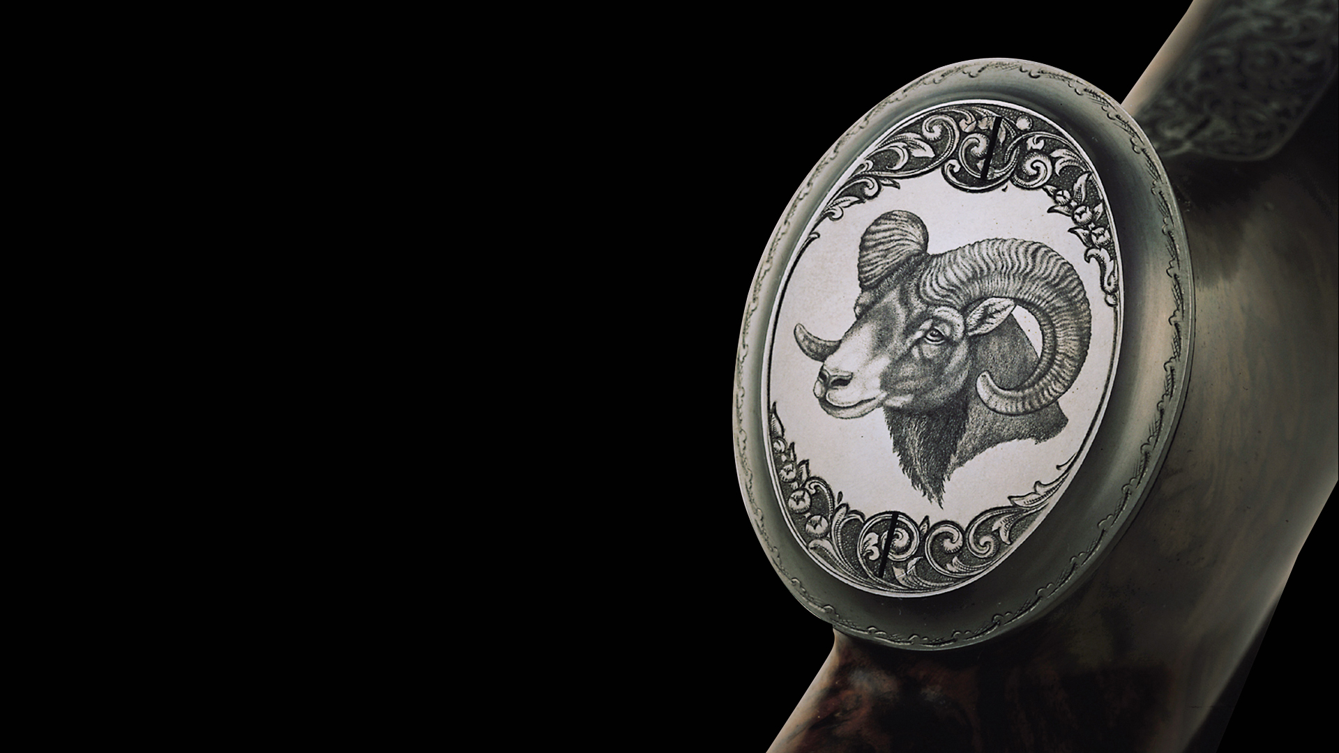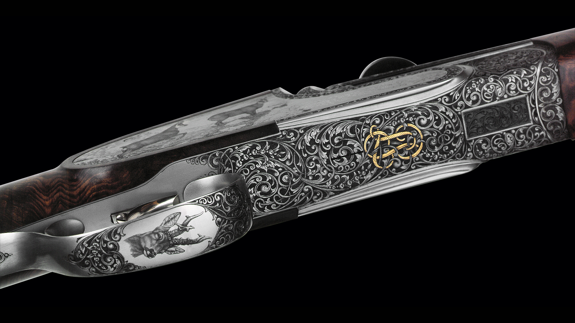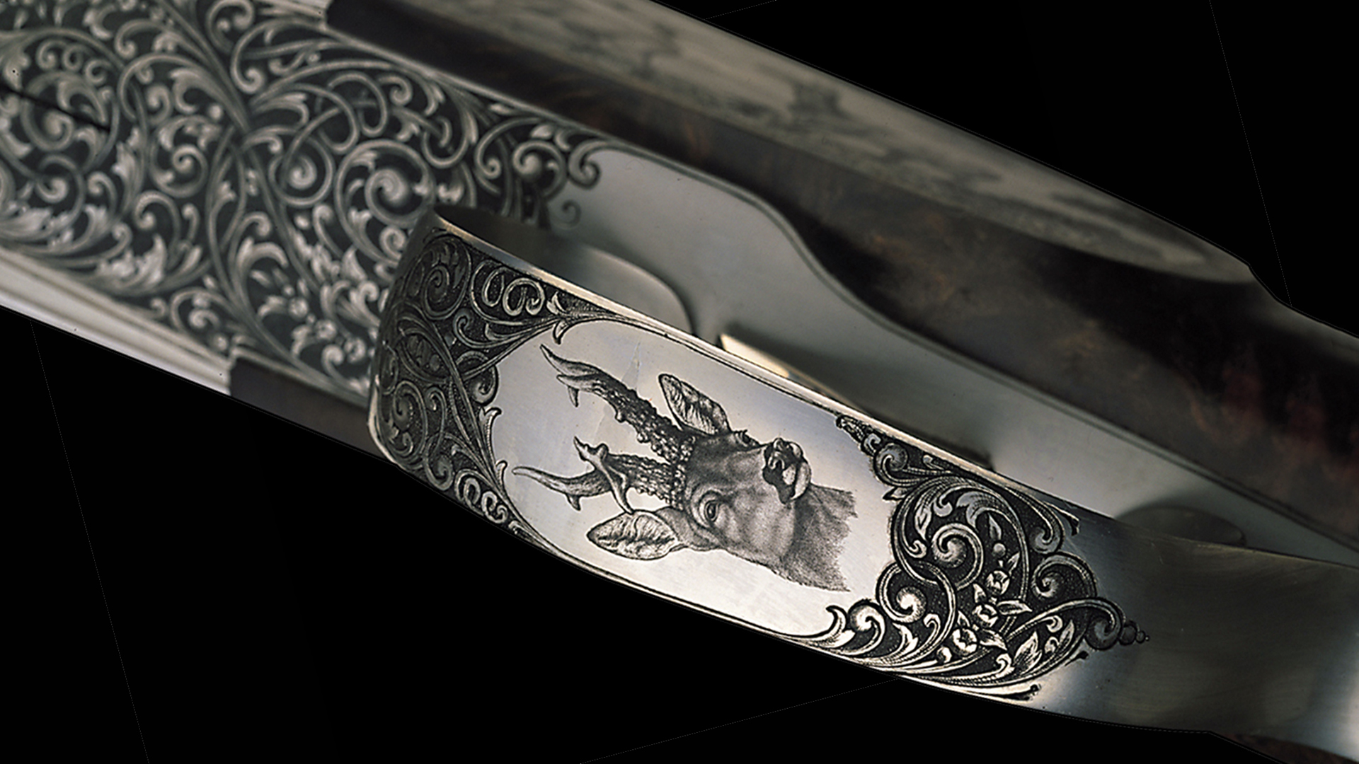 Das Gravurmotiv zeigt Szenen mit Hirschen und Gänsen, umrahmt von einer schönen Ornamentgravur. Ein maßgefertigter Schaft aus einem 1100 Jahre alten Wurzelmaserholz rundet diese edle Gesamtkomposition stilvoll ab.