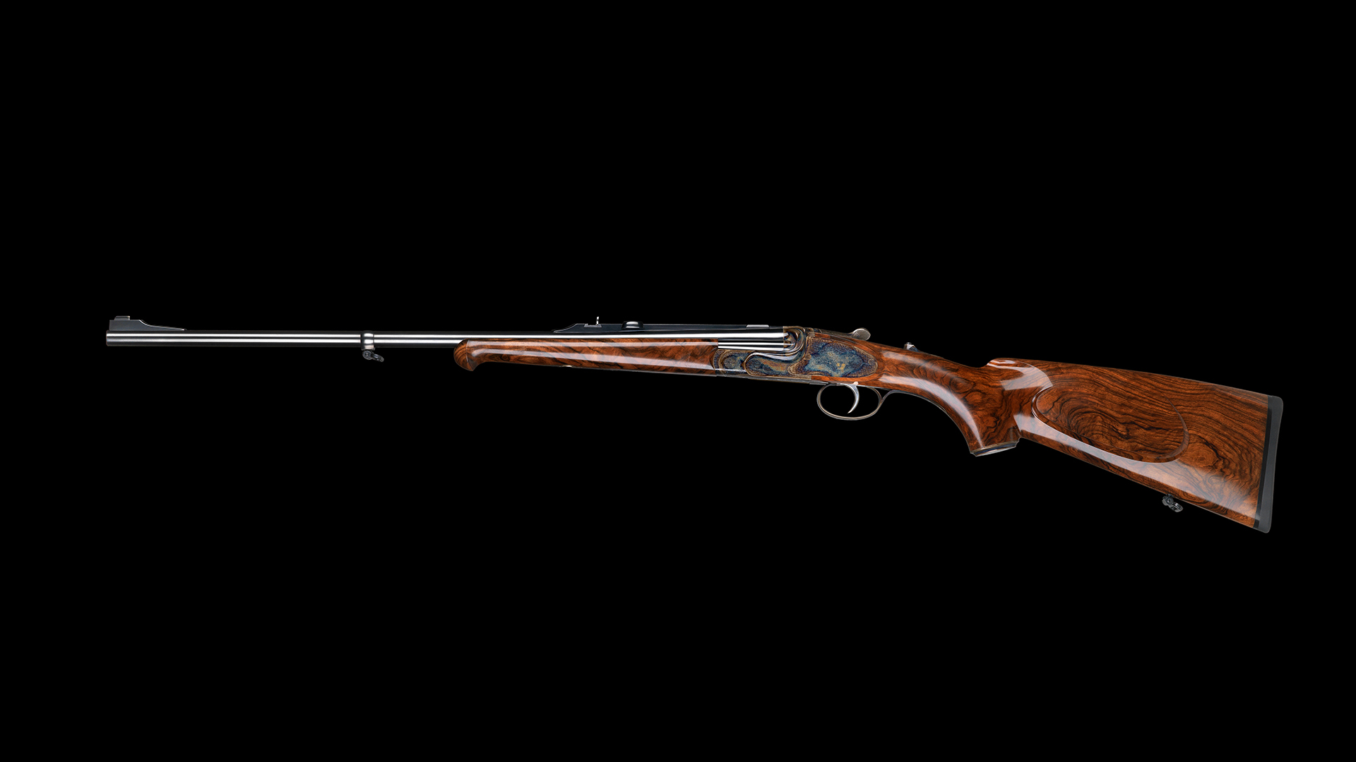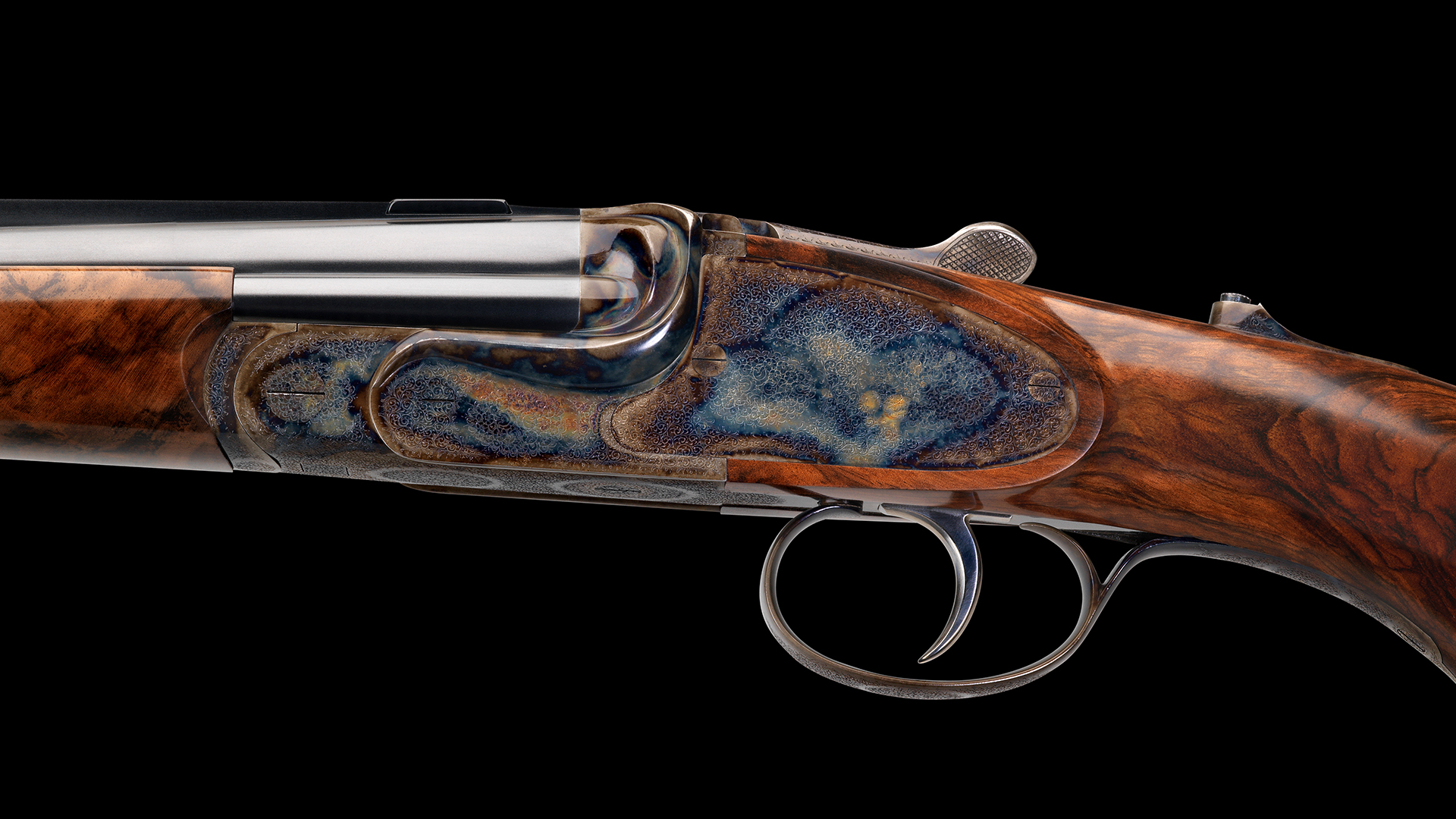 Die English Scroll Gravur und die exzellente Bunthärtung adeln diese zeitlose Kipplaufbüchse.