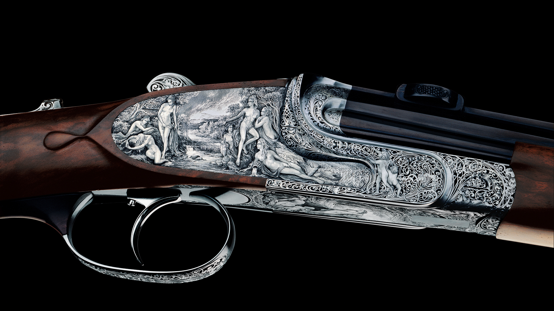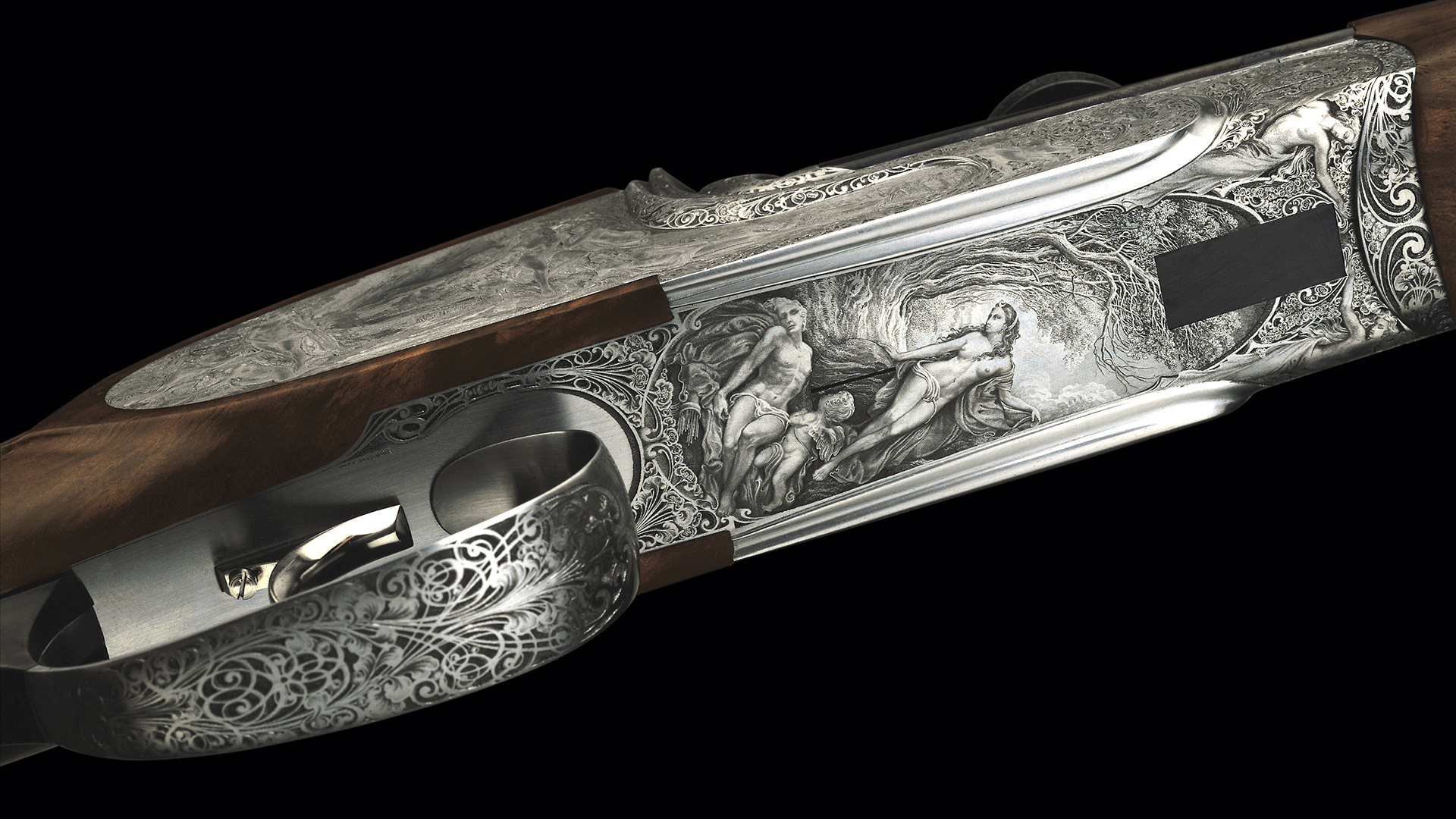 Ein Meisterwerk höchster Büchsenmacher- und Graveurkunst, das der mythologischen Darstellung zur vollen Ehre gereicht.