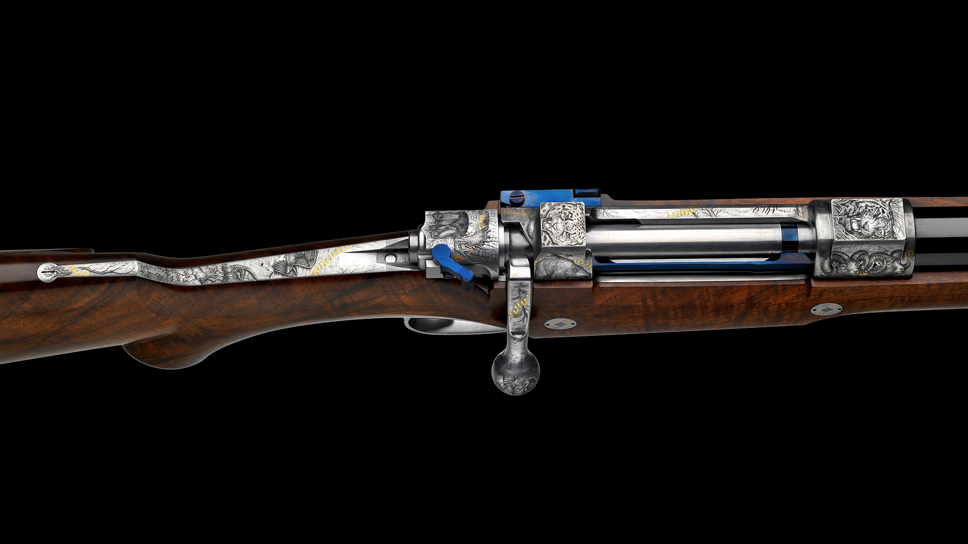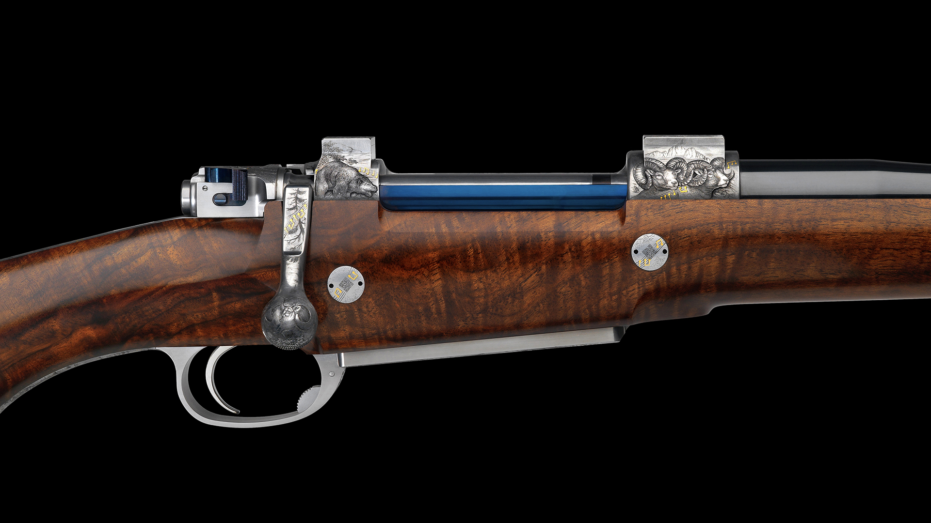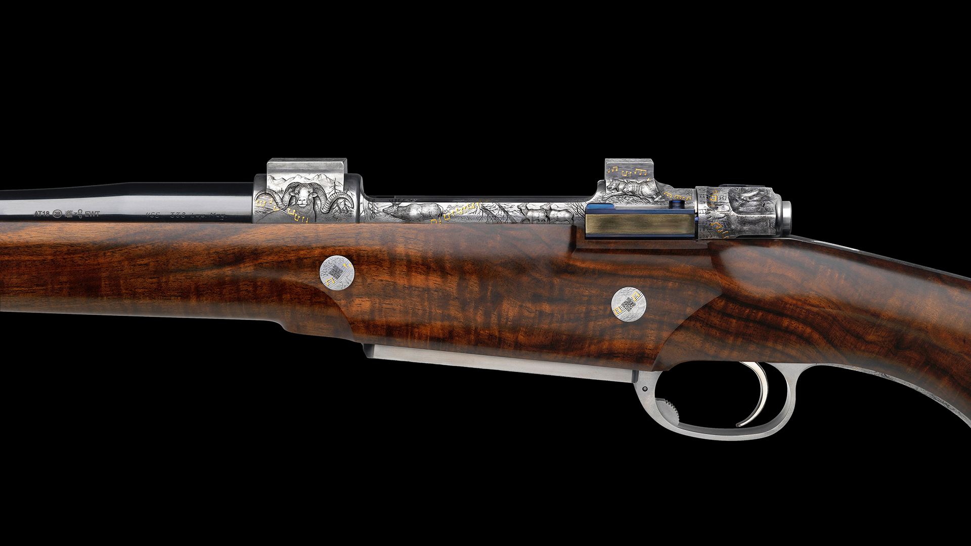 Auf dem ersten Blick sind die für dieses Kaliber zu bejagenden Wildarten zu sehen, doch bei genauerer Betrachtung erkennt man ein aus Musiknoten gebildetes Goldband. Diese Kreation ist gewiss sehr außergewöhnlich und eigenwillig und ist auf die konkreten Lebensumstände des stolzen Besitzers abgestimmt.