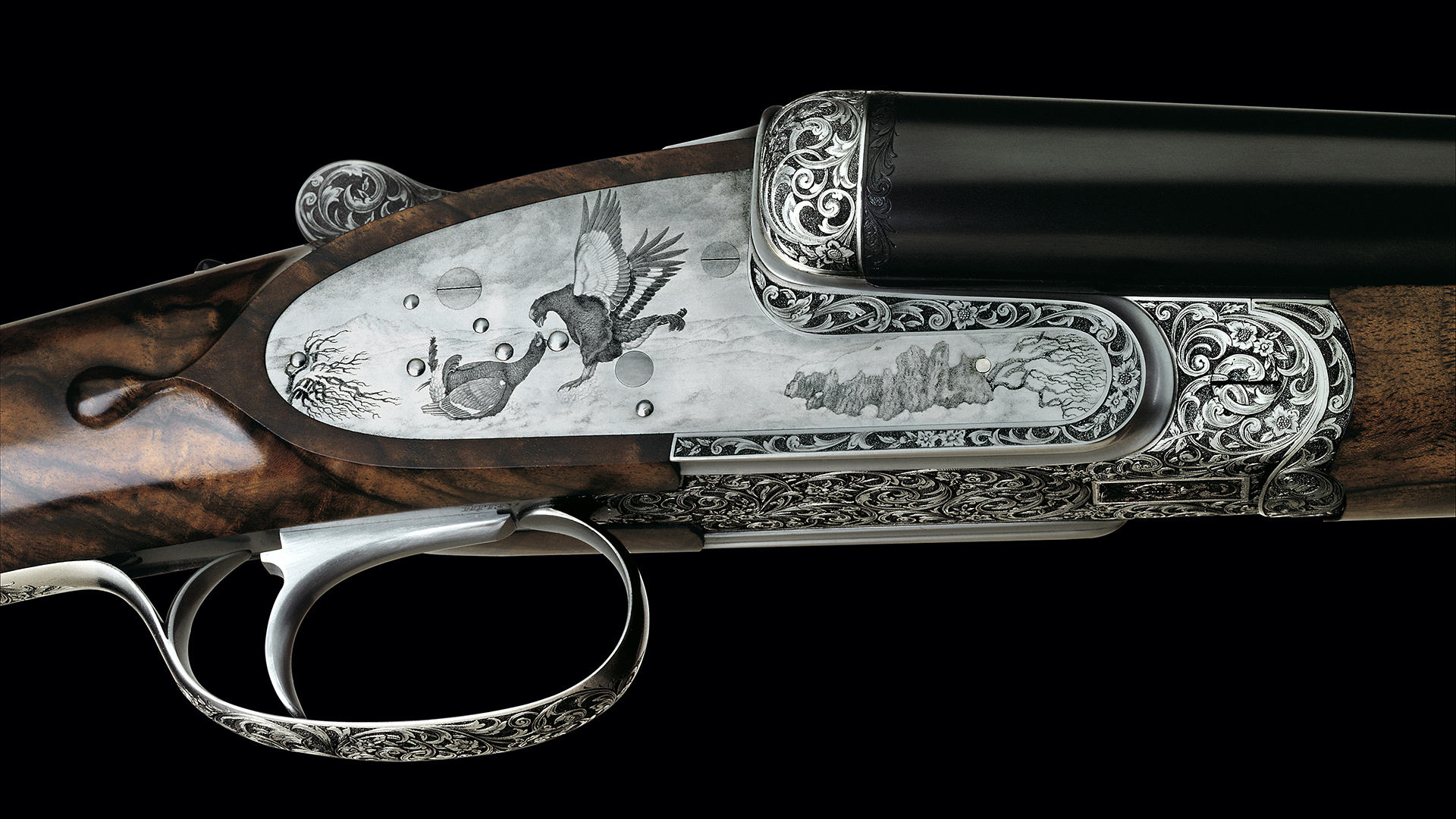 Das Grauvurmotiv auf dieser erlesenen Peter Hofer Doppelflinte in Kaliber 12 zeigt auf einer Seite einen English Setter bereit zum Sprung und auf der anderen Seite eine dynamische Kampfszene zweier Birkhähne im Schnee.