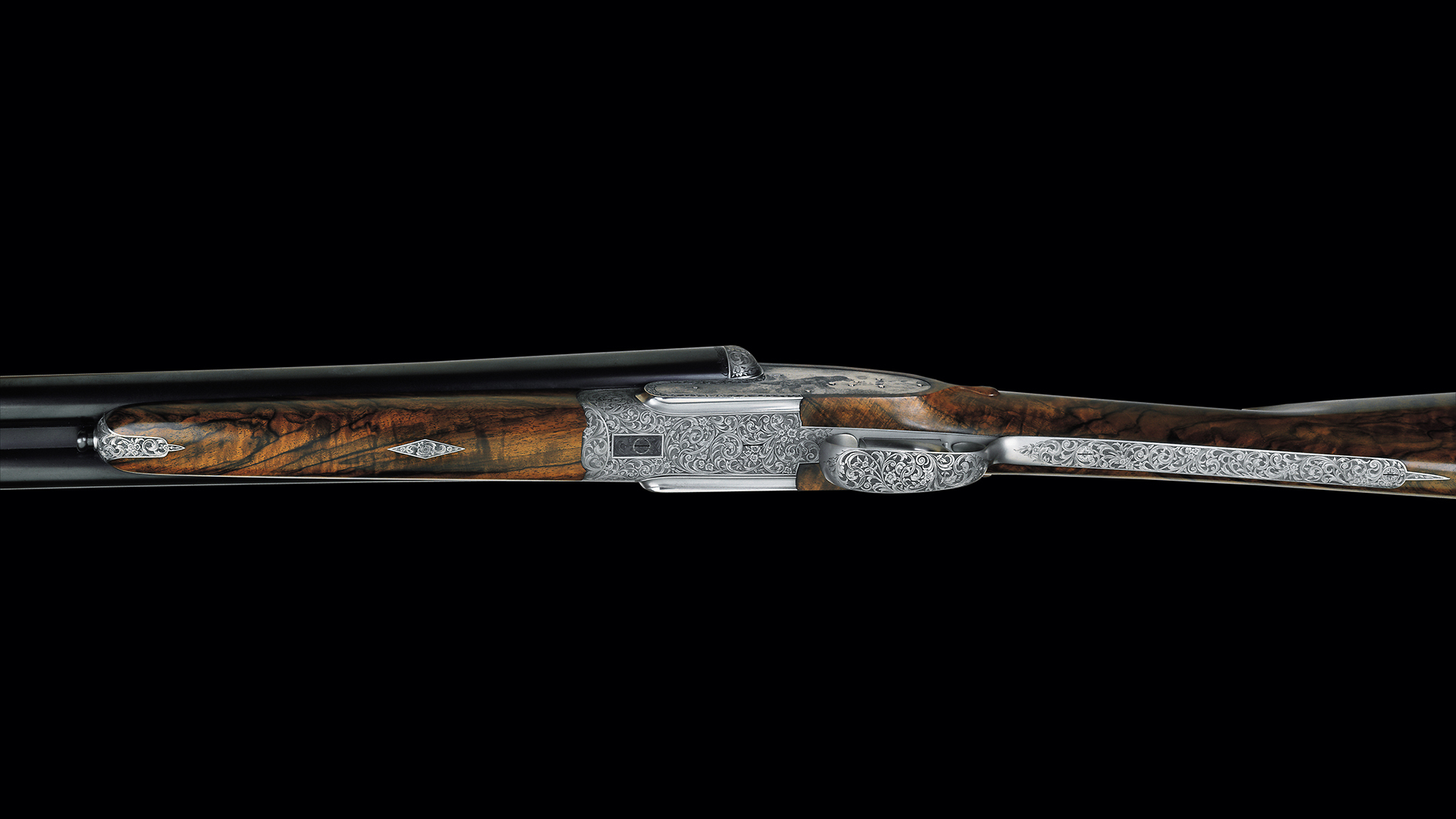 • Peter Hofer Spezial Seitenschloss System mit Fangstange und doppelter Laufhakenverriegelung Spezial Ejektor und Toplever • Markant stufenförmig abgesetzte Seitenflächen des Basküls • Nach hinten in der Breite verjüngte Seitenschlösser und Seitenflächen für zierliche Flintenschäftung