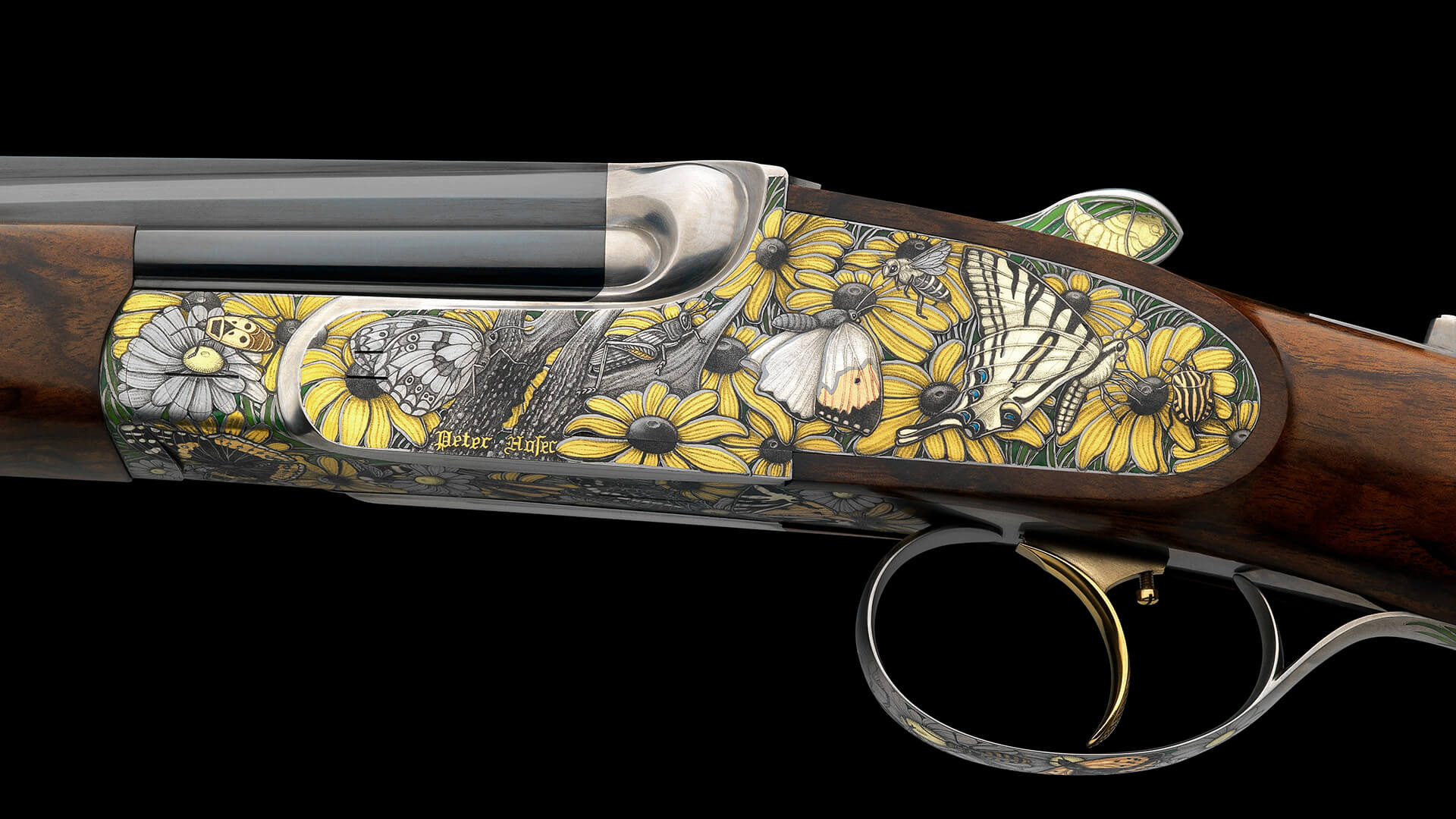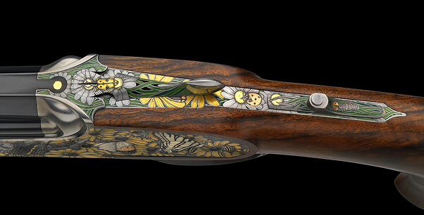 Das Gravurmotiv dieser Kipplaufbüchse soll dieses Zusammenspiel zwischen Jagd und Natur widerspiegeln. Umhüllt von der bunten Vielfalt und Farbenpracht der Natur zeigt sich hie und da ein Geweihfragment. Die Ausführung dieses Gravurkonzeptes erfolgte in feinster Buttini Technik mit 10.000 Stichen pro mm2 in Kombination mit speziell legierten Goldeinlagen.