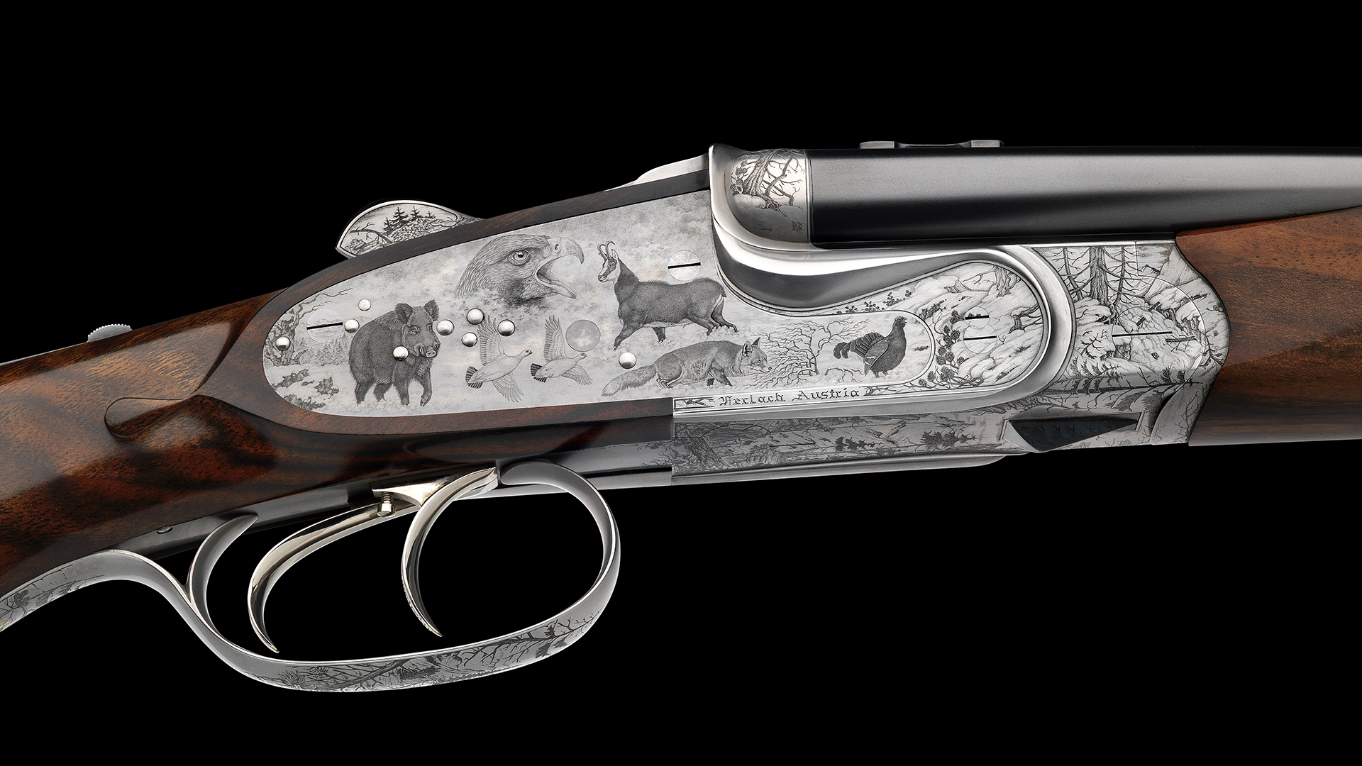 Ein herkömmlicher Drilling mit zwei unterschiedlichen Kugelkalibern und einem Schrotkaliber hat ein Gesamtgewicht von 4,6 kg. Ein von Anfang an durchdachtes Konzept zur gezielten Gewichtsreduzierung machte es möglich, dass bei dieser Neuentwicklung ein Weltrekordgewicht von nur 2,9 Kilo erzielt werden konnte. Diese weltweit unerreichte technische Meisterleistung sollte auch in künstlerischer Hinsicht eine absolute Krönung erfahren. Die Verwirklichung der auf dieser Waffe dargestellten Tierstücke erfolgte in einer über alle Maßen präzisen Ausführungsqualität. Mit einer Feinheit von 13.000 Stichen pro Quadratmillimeter realisierte unsere begnadete Bulino- und Butinikünstlerin in tausenden Gravurstunden die hier dargestellte Gravurkomposition in einer Herbst- und Winterlandschaft.