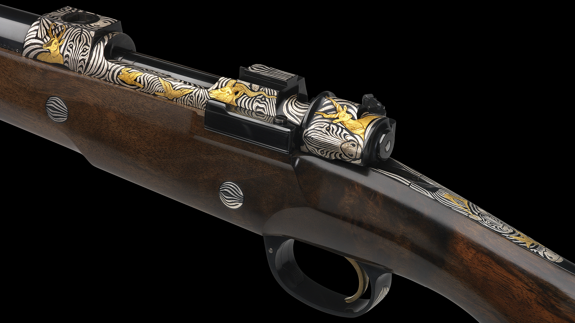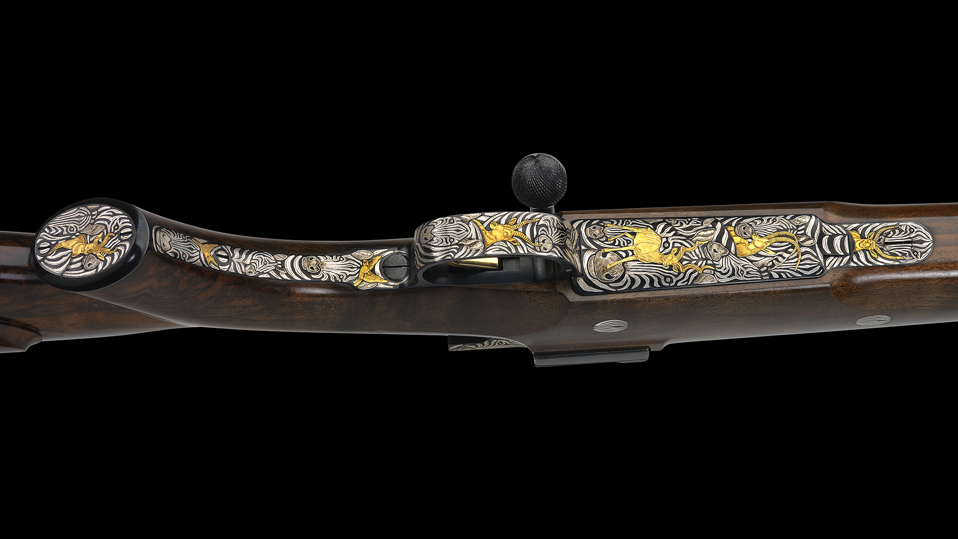 Die künstlerische Ausführung dieser Repetierbüchse besticht durch die kontrastreiche Darstellung der metallfarbigen Zebras mit den darüber in Gold eingelegten Tierstücken.