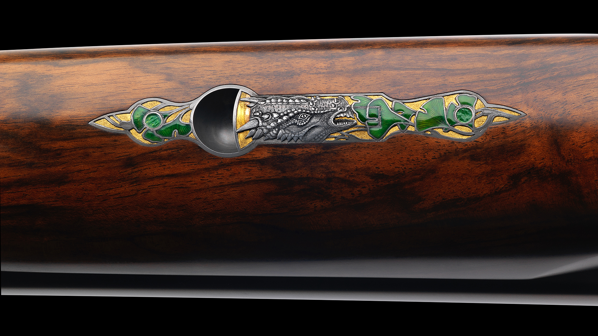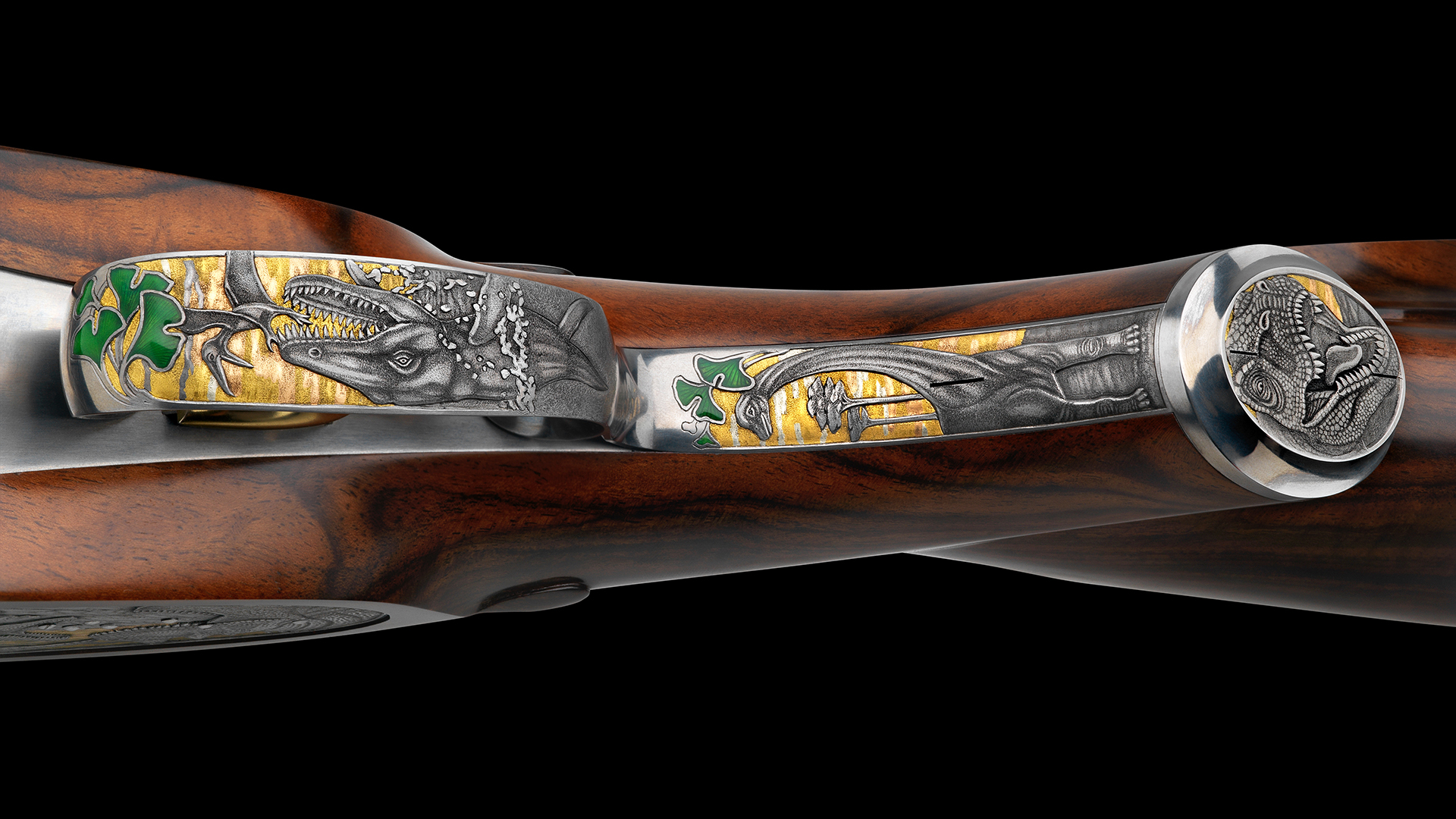 Auf der rechten Seite finden sich folgende Saurier: Koreaceratops, Tarbosaurus, Tyrannosaurus, Styracosaurus und Spinosaurus. Auf der linken Seite wurden der Ceratosaurus, Polacanthus, Spinosaurus, Triceratops und Dilophosaurus graviert. An der Unterseite befindet sich der Tyrannosaurus, Psittacosaurus, Corythoraptor, Dakosaurus, Brachiosaurus, Cearadactylus und abermals der Tyrannosaurus. An der Oberseite sind der Triceratops, Psittacosaurus, Pteranodon zu sehen und am Vorderschaft der Dracorex. An den Ausläufern des Laufes findet sich eine Boa Constrictor. Grüne Ginkgoblätter legen sich in feinster Emailarbeit um den Stahl. Die Blätter dieses Nadelbaumes, der bereits zur Zeit der Dinosaurier existiert hatte, haben sich nie zu Nadeln geteilt. Noch heute zeigt sich dieser Baum besonders im Herbst in wunderschönen leuchtenden Goldfarben.