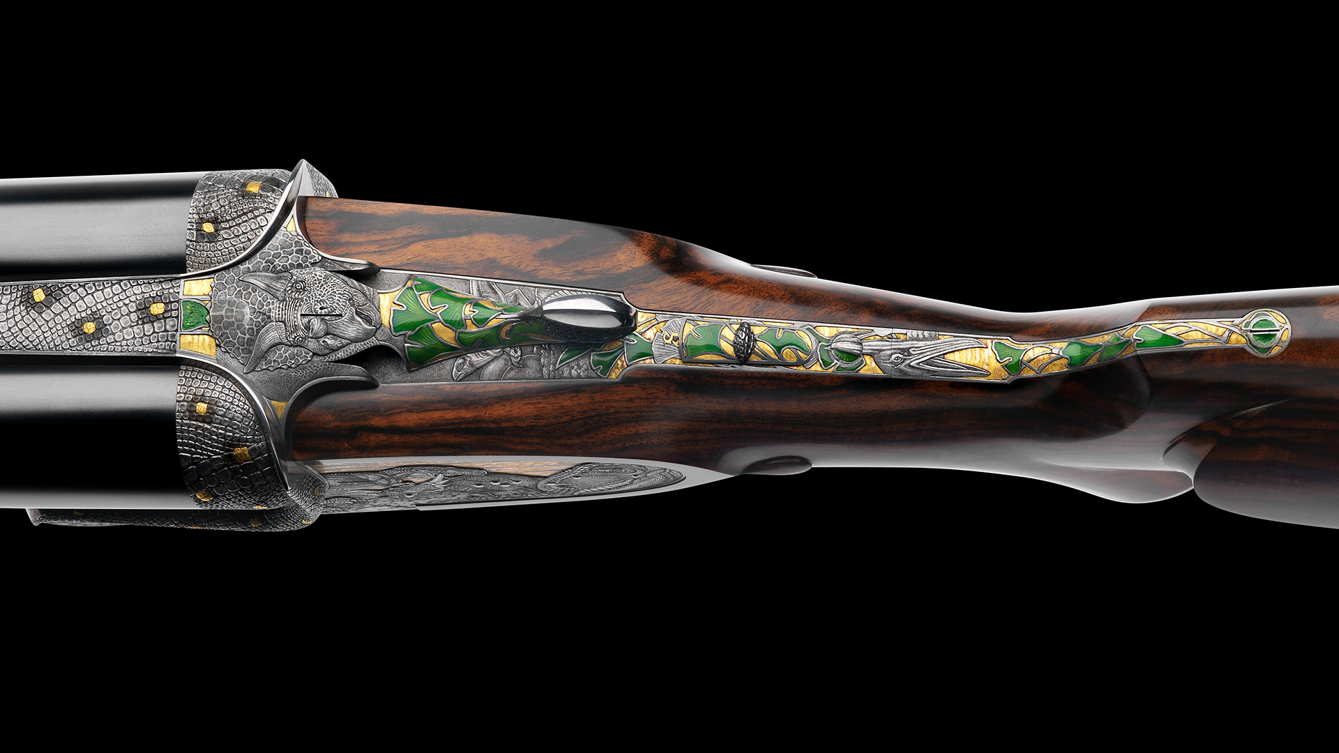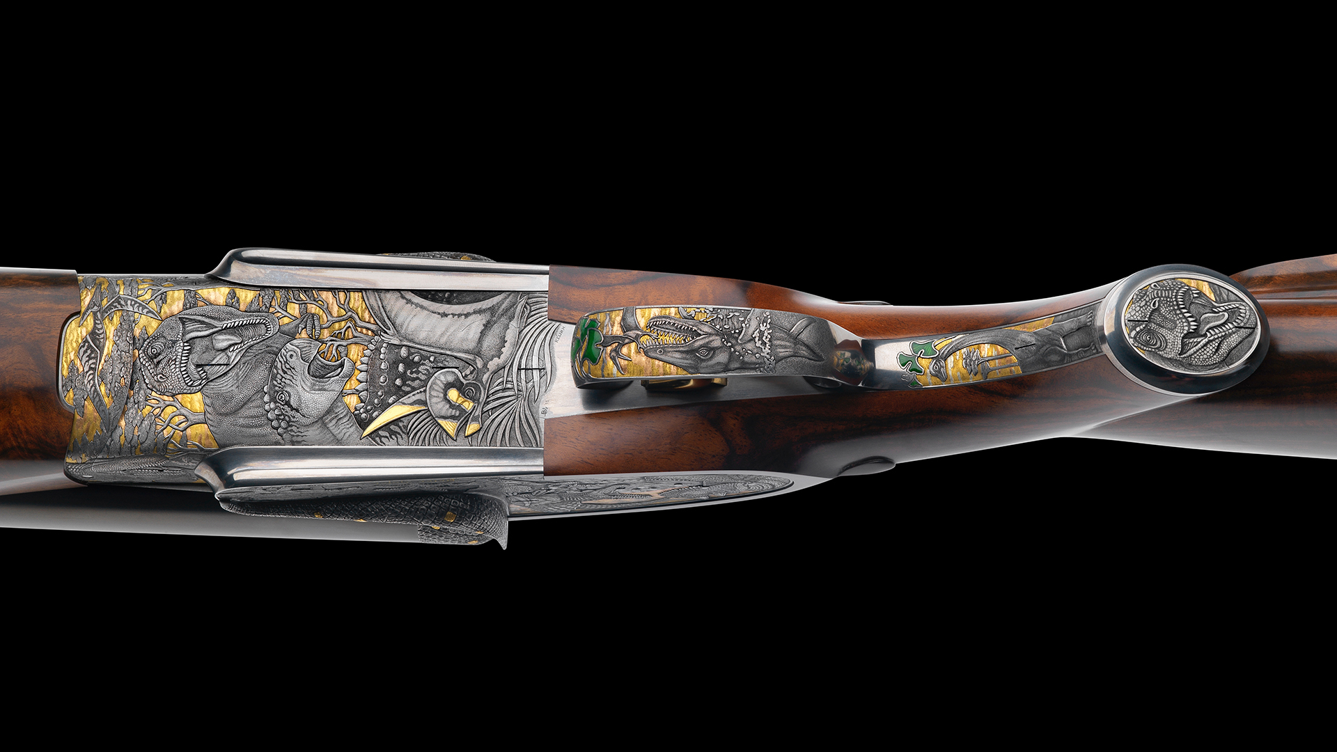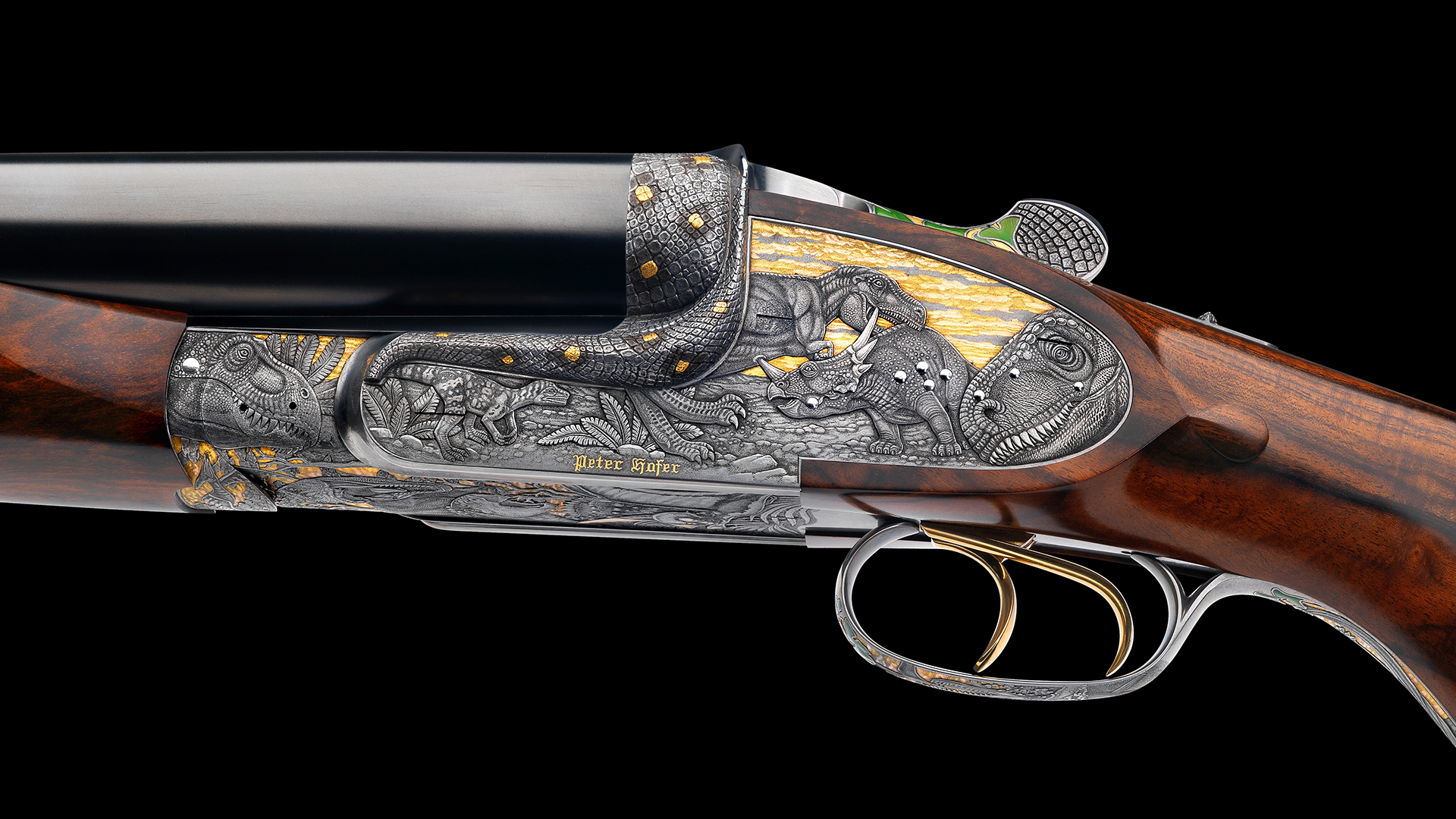 Das künstlerische Design dieser weltweit größten Doppelbüchse sollte die mit diesem Kaliber assoziierte Stärke widerspiegeln, weshalb die Wahl für das Gravurkonzept unweigerlich auf die weltweit größten Tiere fiel, die jemals auf der Erde gelebt hatten, die Dinosaurier. Peter Hofer wählte bei seiner Gravurkreation die dramatischste Epoche in der Existenz der Saurier, als vor 65 Millionen Jahren ein gewaltiger Meteoriteneinschlag im Golf von Mexiko weltweite Brände und Feuerinfernos auslöste. Die Darstellung dieses Feuerinfernos erfolgte durch verschiedenfärbige Massivgoldeinlagen im tief ziselierten Hintergrund. Vor dieser dramatischen Szenerie wurden in größter Akribie und in Tausenden Arbeitsstunden die mächtigsten Kämpfe der Tierwelt unseres Planten in Relief aus dem Stahl herausmodelliert.