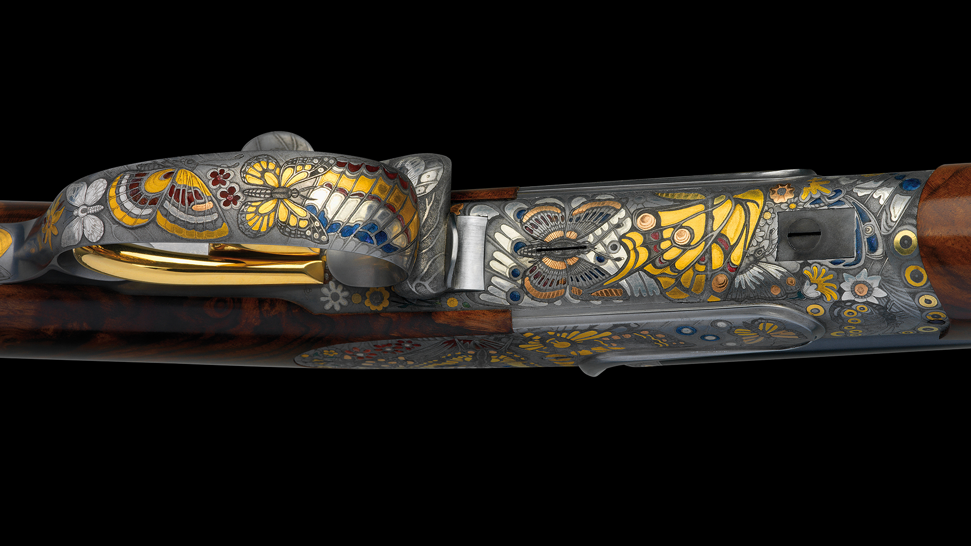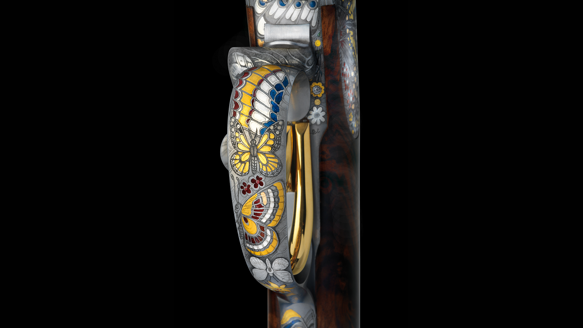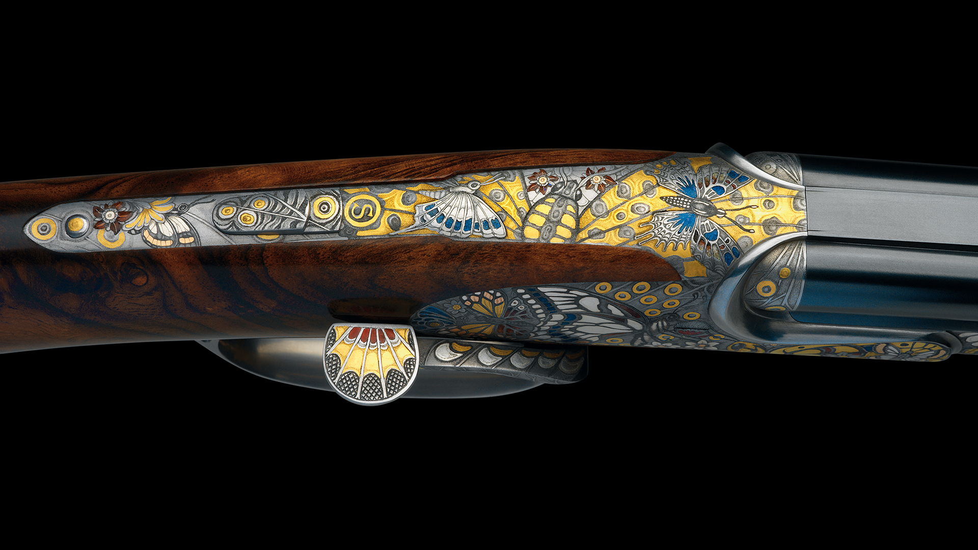 Auch die Gravurausführung erfolgte auf besonderen Kundenwunsch und zeigt ein Potpourri an Schmetterlingen, die sich in fünf Lagen, in unterschiedlichen Farben, Perspektiven und Größen über die gesamte Waffe legen. Die verschiedenfarbigen Edelmetall- und Emaille Einlagen verleihen der in Punkttechnik ausgeführten Gravur eine atemberaubende und weltweit unübertroffene Farbkomposition.