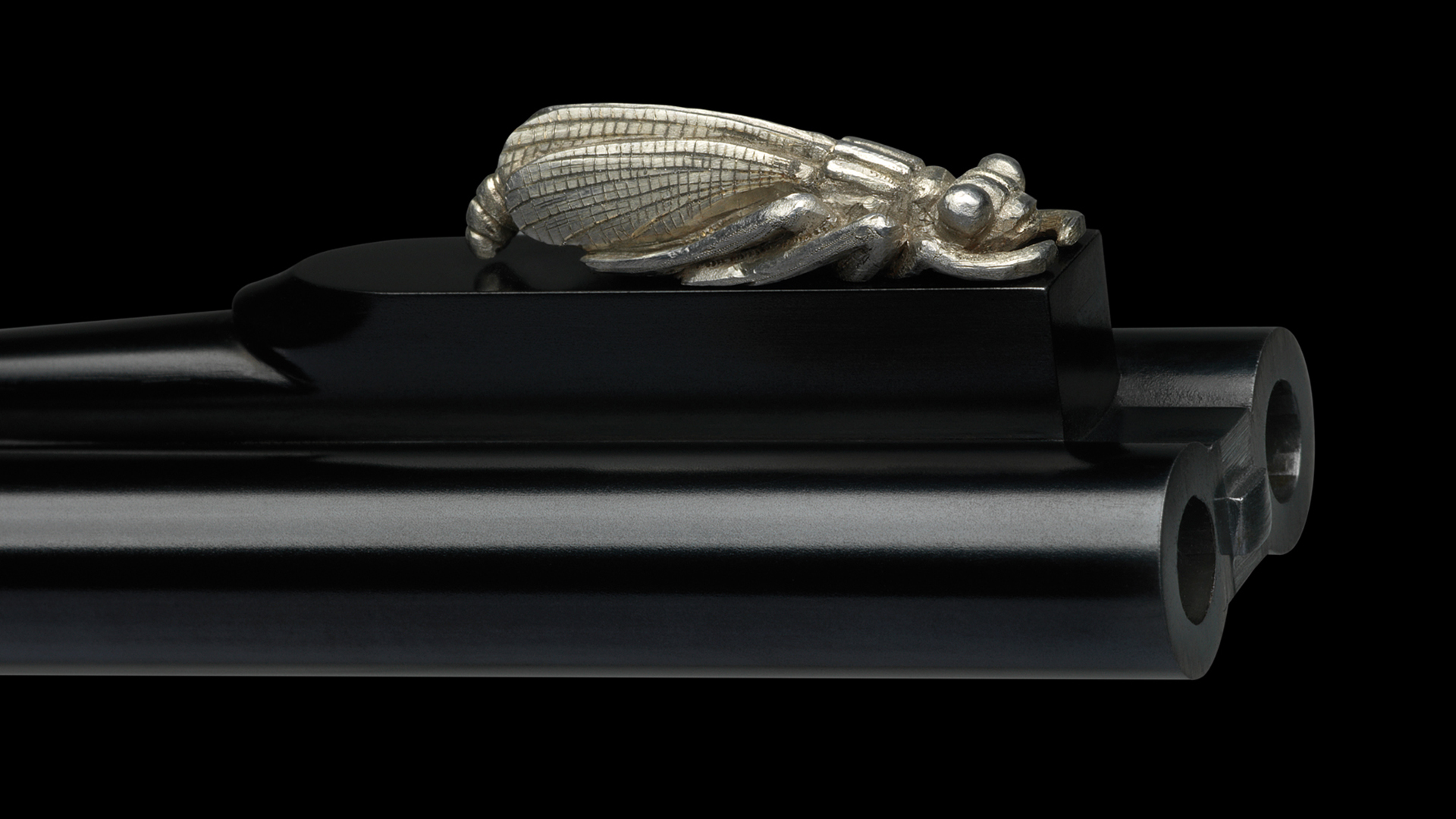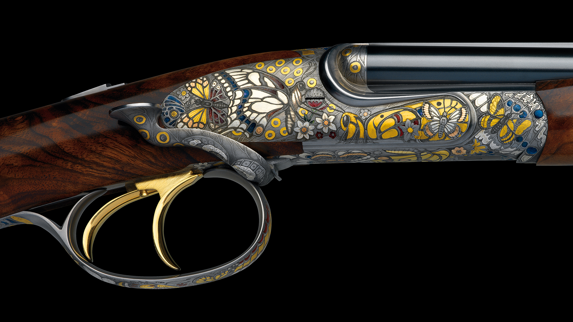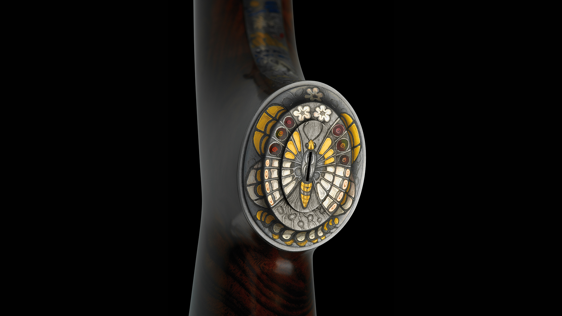 Auch die Gravurausführung erfolgte auf besonderen Kundenwunsch und zeigt ein Potpourri an Schmetterlingen, die sich in fünf Lagen, in unterschiedlichen Farben, Perspektiven und Größen über die gesamte Waffe legen. Die verschiedenfarbigen Edelmetall- und Emaille Einlagen verleihen der in Punkttechnik ausgeführten Gravur eine atemberaubende und weltweit unübertroffene Farbkomposition.