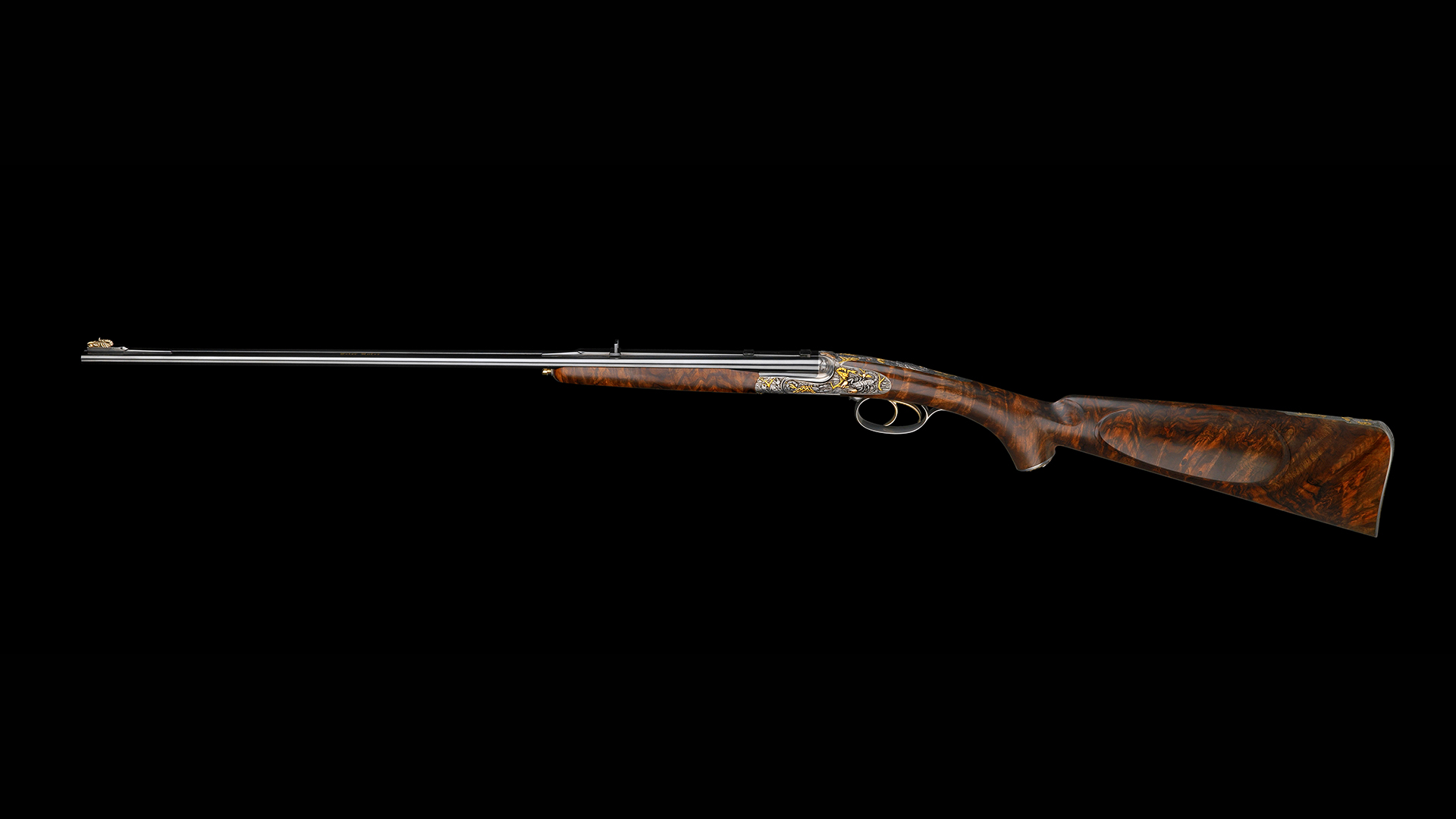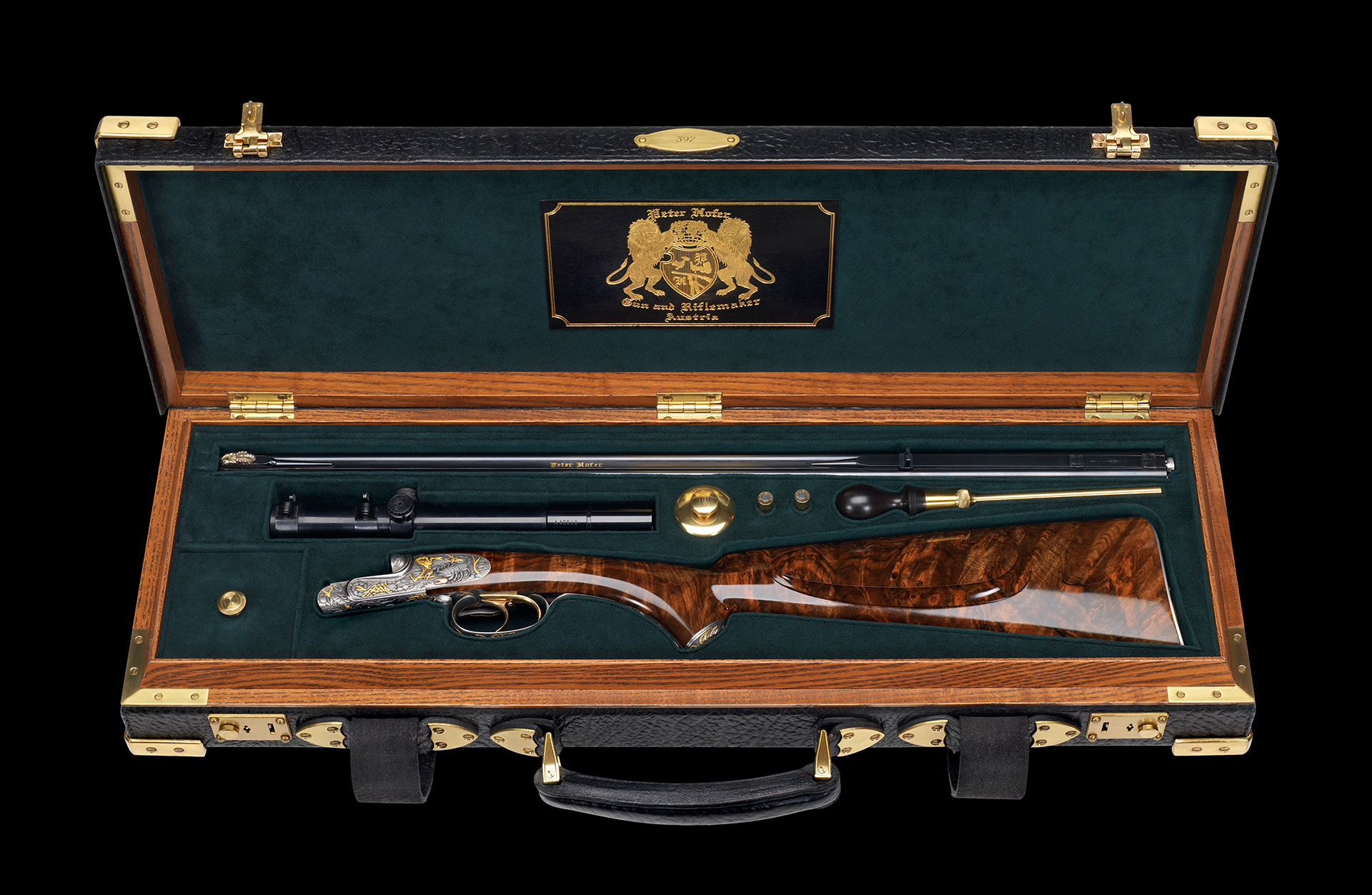 Die hier präsentierte Doppelbüchse mit einem Rekordgewicht von 0,9 kg ist weltweit einzigartig und wird nur von der Manufaktur Peter Hofer Jagdwaffen ausschließlich von Hand gefertigt. Bei dieser Jagdwaffe ist Peter Hofer an die absoluten Grenzen des technisch Machbaren gegangen und hat dank seines Erfindergeistes dieses einzigartige Doppelbüchsenmodell erschaffen. Bei der Kreation dieses Werks hat der Meisterbüchsenmacher und Künstler Peter Hofer sich „fast“ selbst überschätzt und benötigte mit seinem Team eine vierjährige Entwicklungszeit, um diese Rekordwaffe zu verwirklichen.