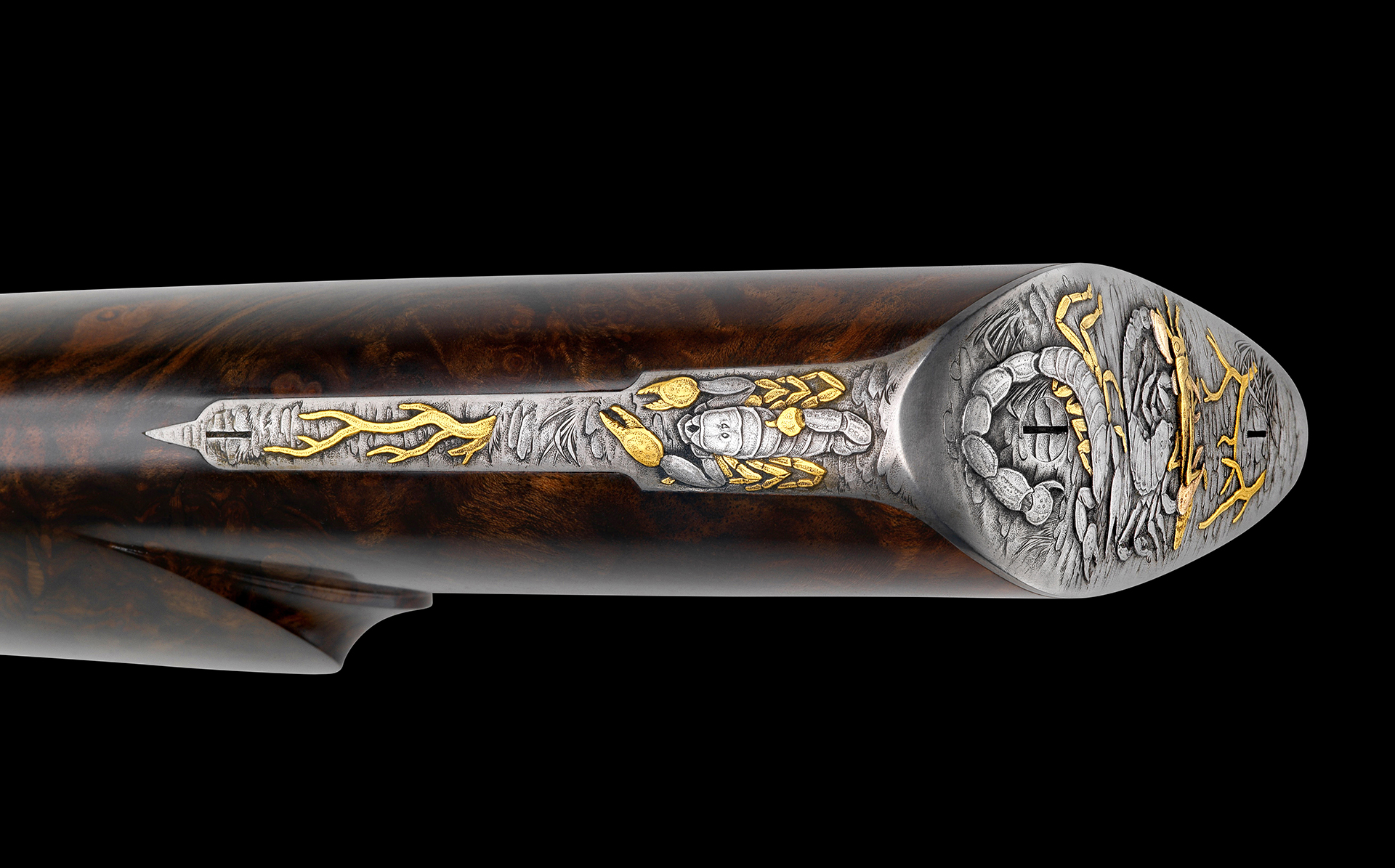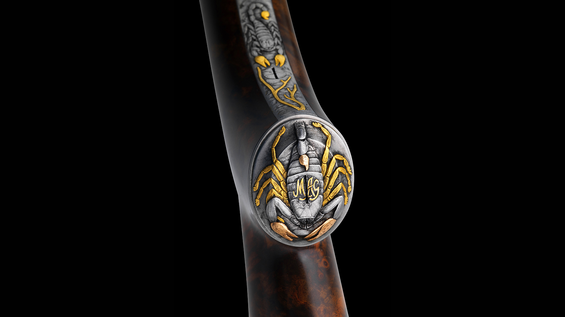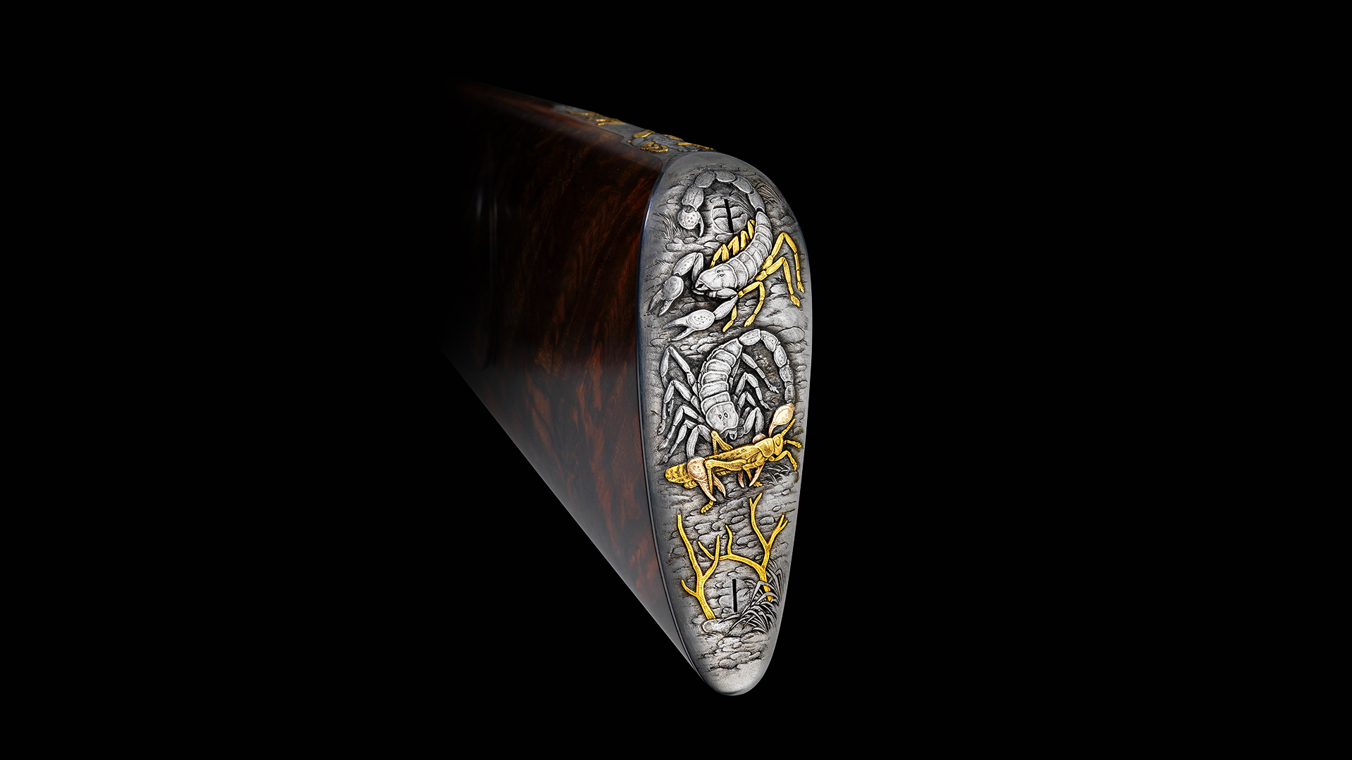 Auch die künstlerische Gestaltung zeugt von einzigartiger Genialität, wurde doch der Skorpion bewusst ob dessen Größe gewählt, um dieses Meisterwerk der Büchsenmacherkunst zu zieren. Das hier dargestellte Tier ebenso wie die Waffe selbst sollten trotz deren geringer Größe nicht unterschätzt werden. Es ist zweifelsohne ein wahrer Genuss, mit dieser perfekt ausbalancierten Doppelbüchse zu schießen und deren äußerst gelungene und kontrastreiche Gravurausführung mit Goldeilangen zu bewundern.