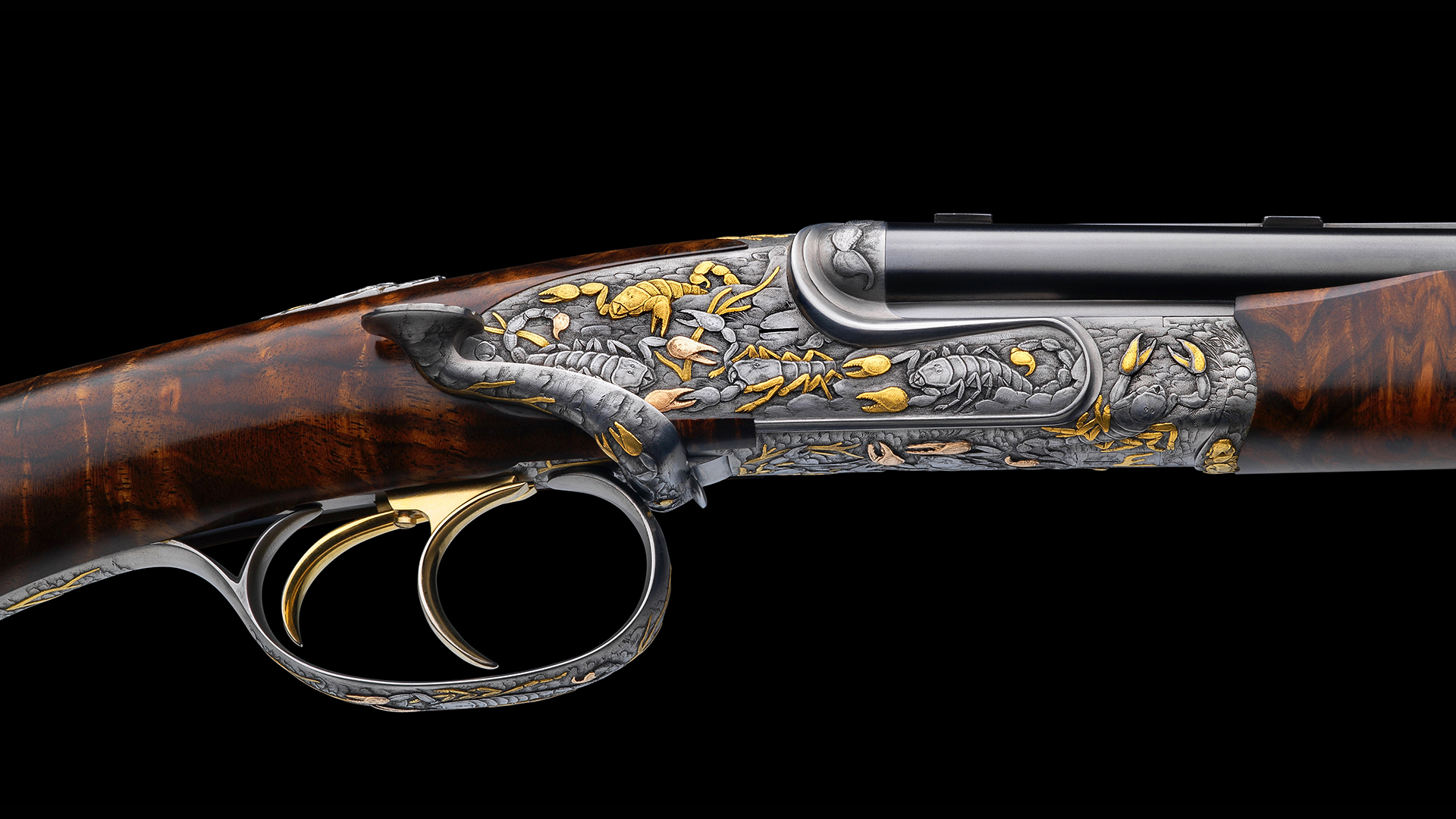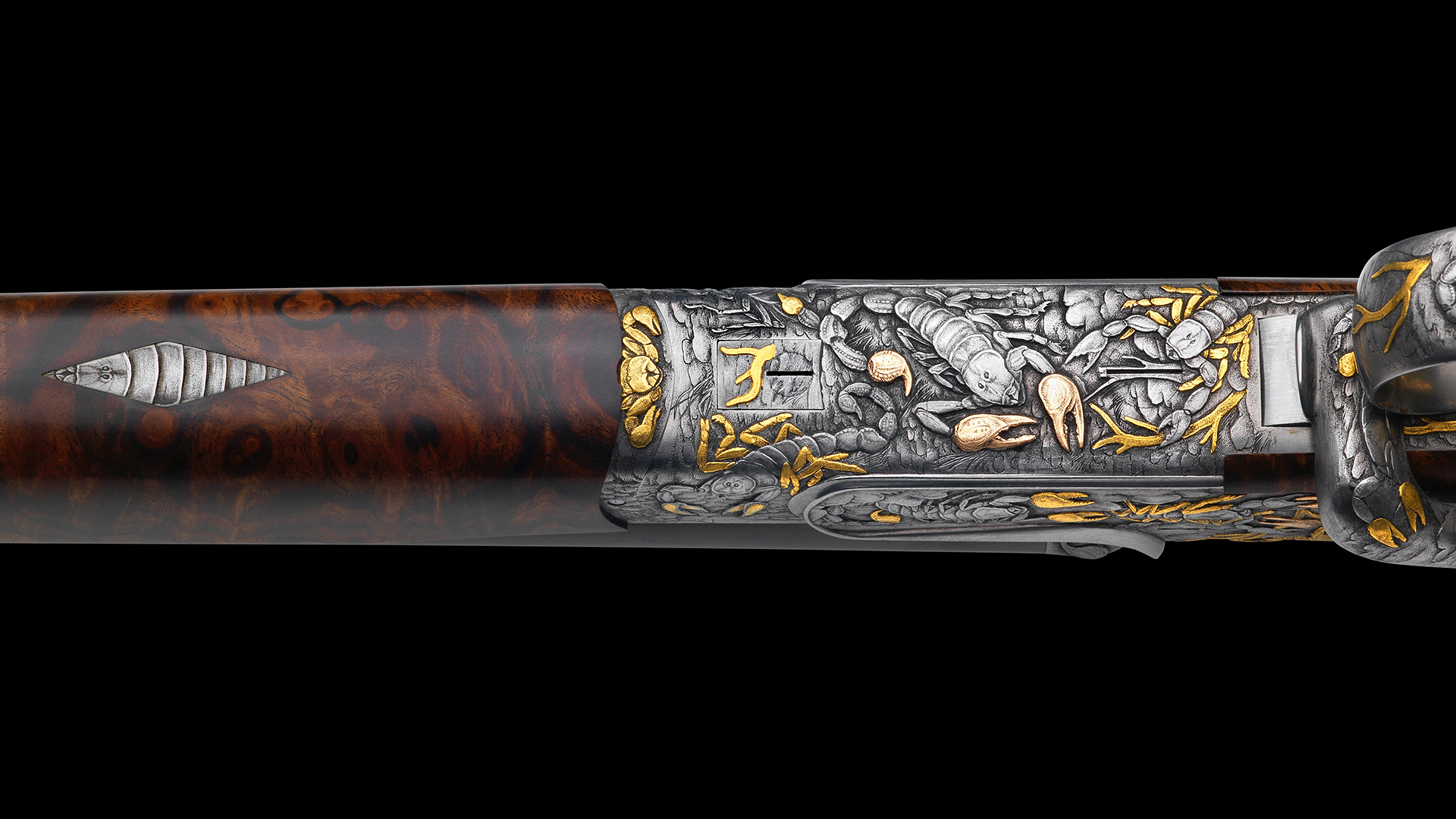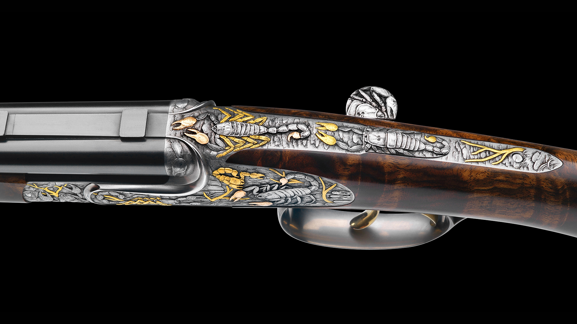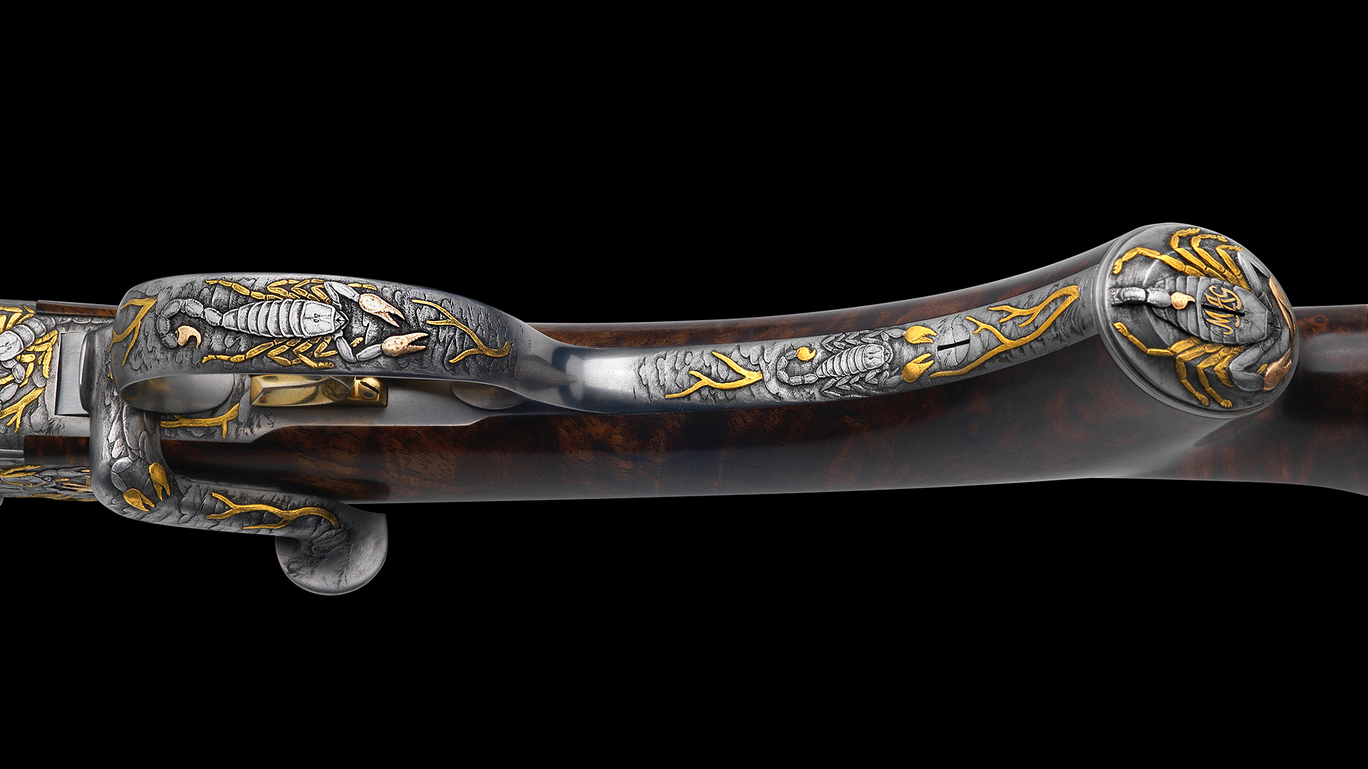 Auch die künstlerische Gestaltung zeugt von einzigartiger Genialität, wurde doch der Skorpion bewusst ob dessen Größe gewählt, um dieses Meisterwerk der Büchsenmacherkunst zu zieren. Das hier dargestellte Tier ebenso wie die Waffe selbst sollten trotz deren geringer Größe nicht unterschätzt werden. Es ist zweifelsohne ein wahrer Genuss, mit dieser perfekt ausbalancierten Doppelbüchse zu schießen und deren äußerst gelungene und kontrastreiche Gravurausführung mit Goldeilangen zu bewundern.